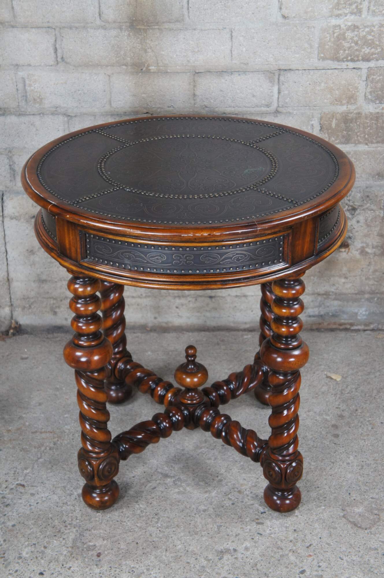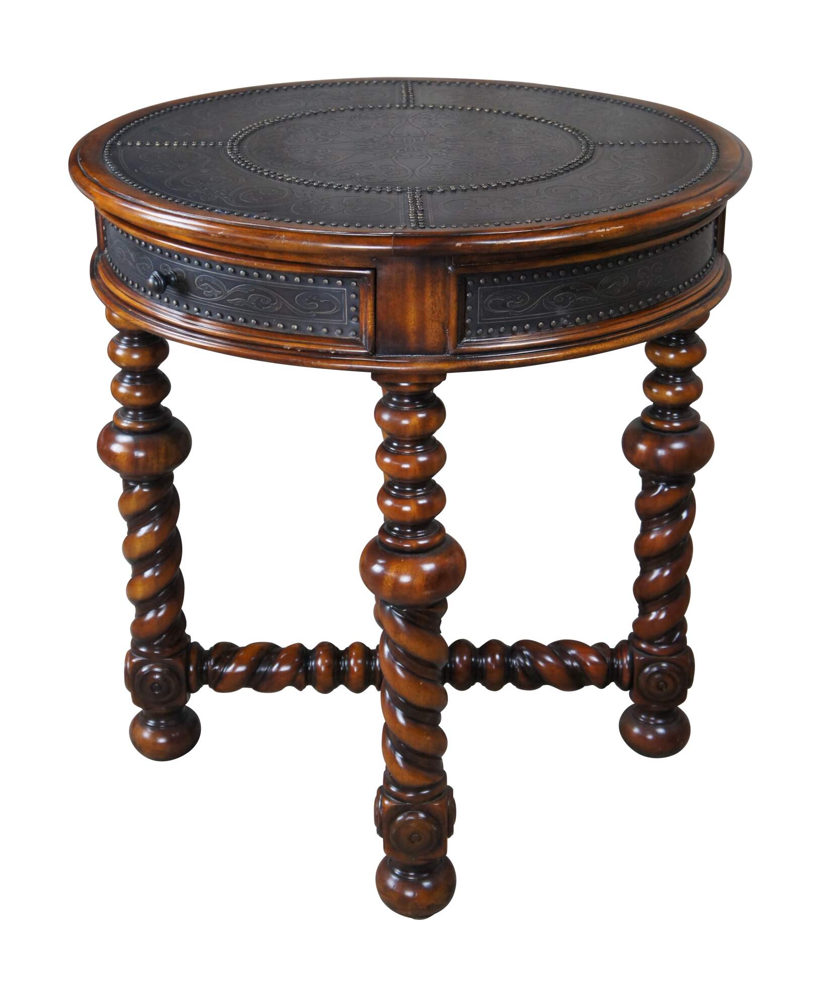 A solid mahogany and brass engraved circular lamp table by Theodore Alexander, Circa late 20th Century. Features a frieze drawer, on barley twisted turned legs and stretchers. Includes a turned lower trophy finial and riveted accents. The table is after an original 17th century Portuguese design.