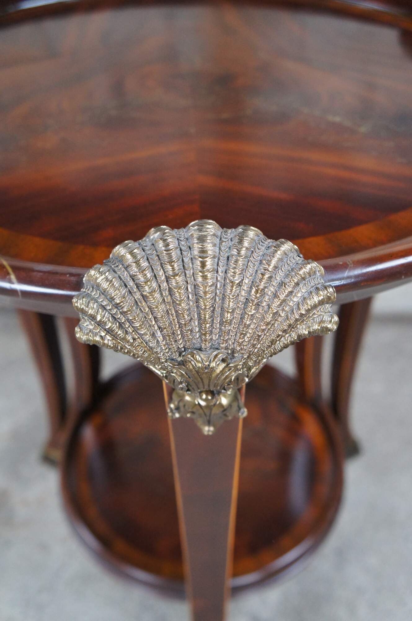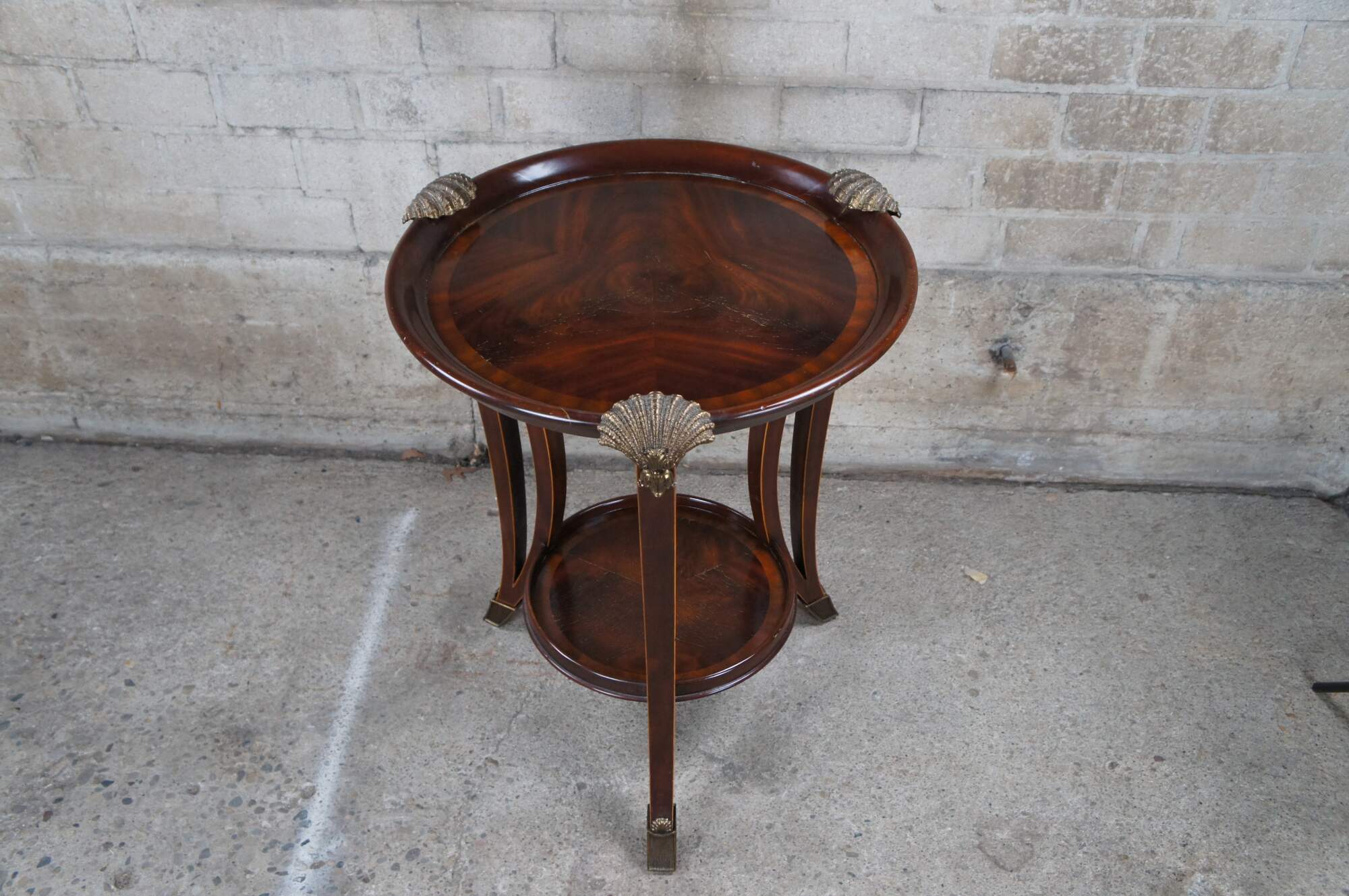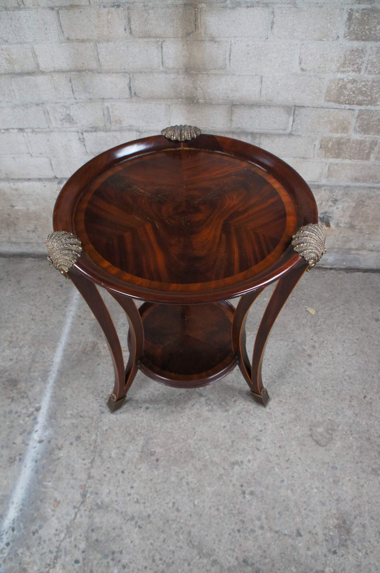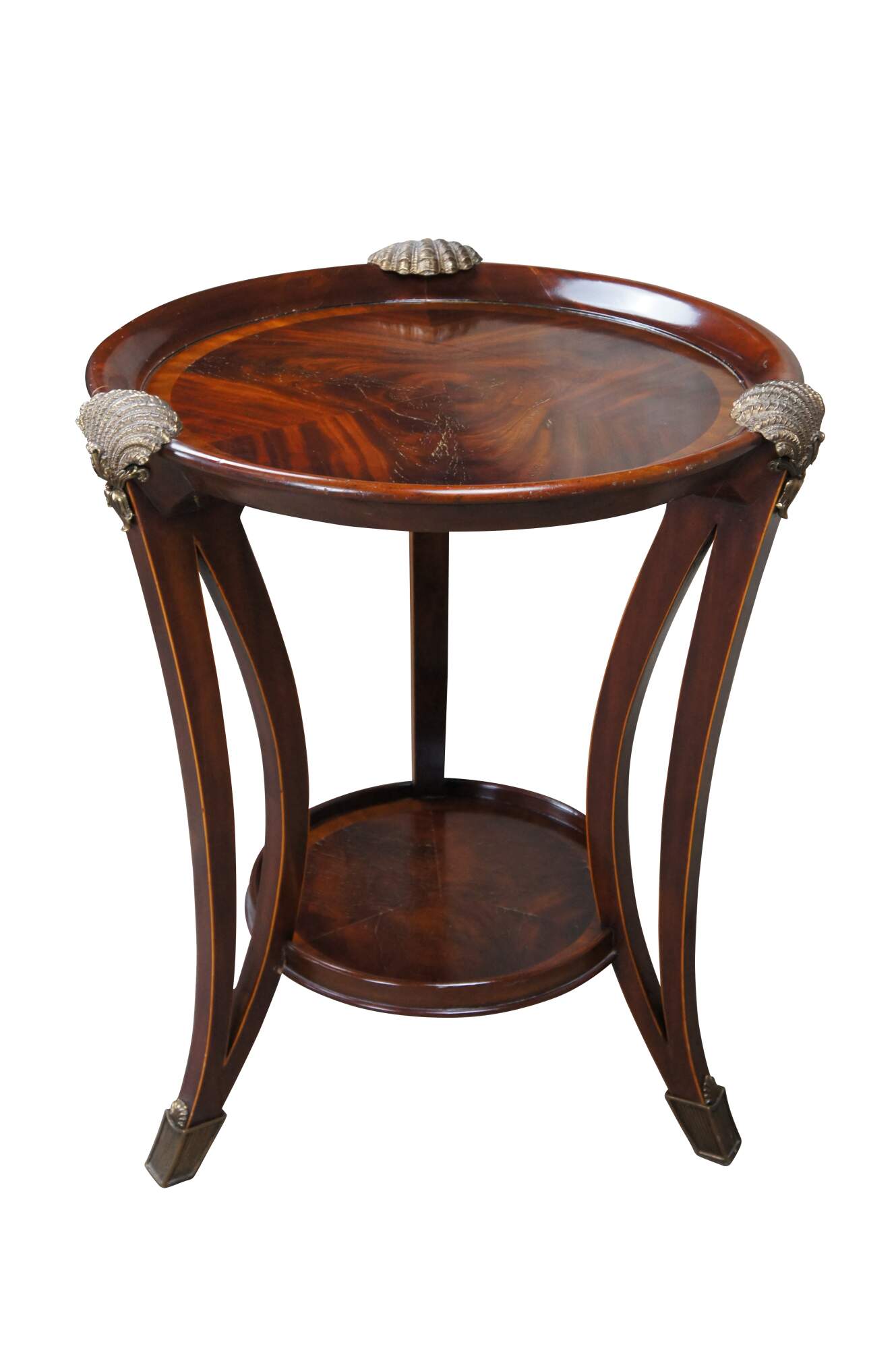An impressive late 20th century two tier side table / sculpture stand by Maitland Smith. Features a round form inset top over three downswept and pierced square form legs leading to brass capped feet. The top showcases scalloped bronze ormolu mounts above the legs. Made from mahogany with matchbook crotch veneered top with cross banded border. The legs are inlayed along the edges. Table marked with Maitalnd Smith tag along the underside. Inspired by Sheraton & Georgian styling with a little Louis Marjorelle French flair.