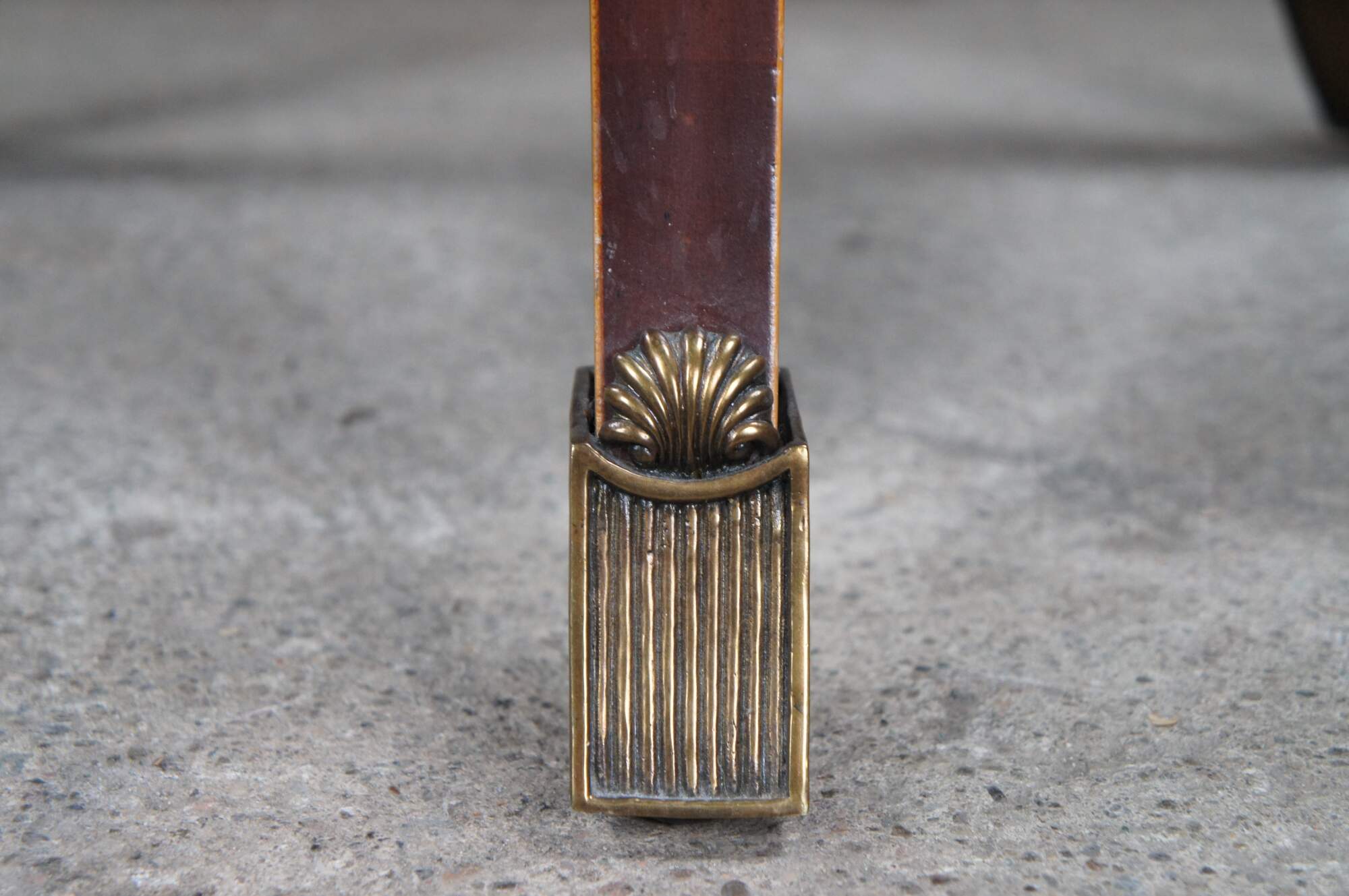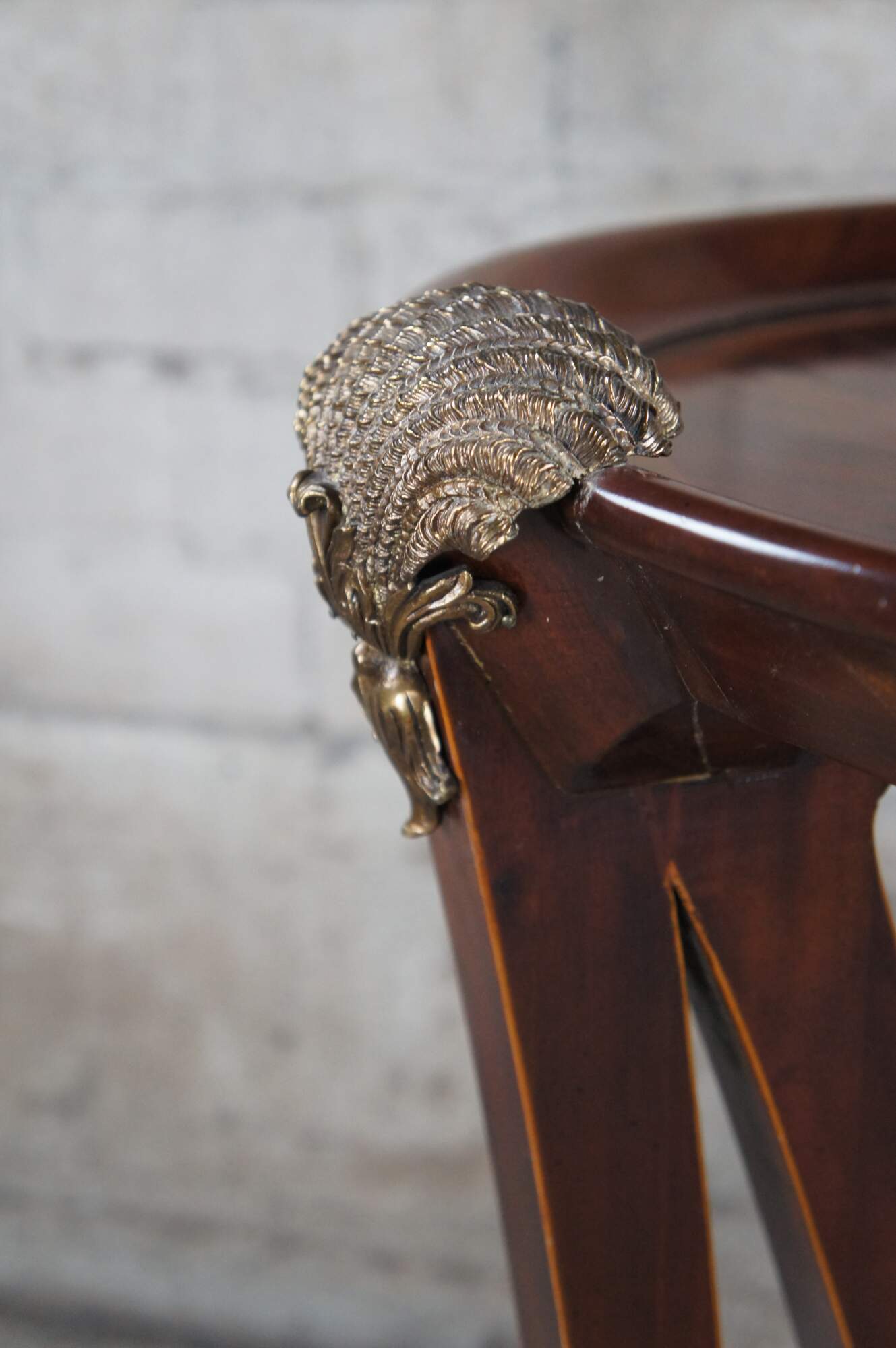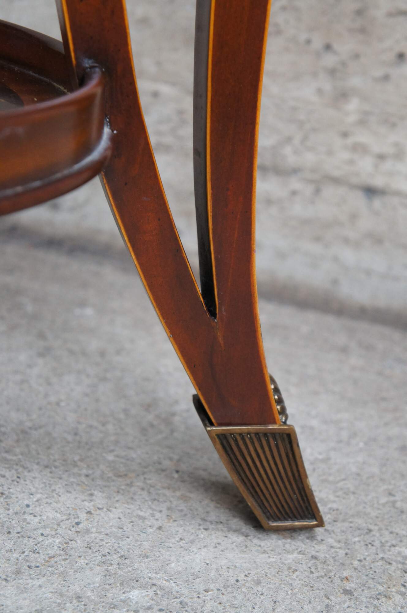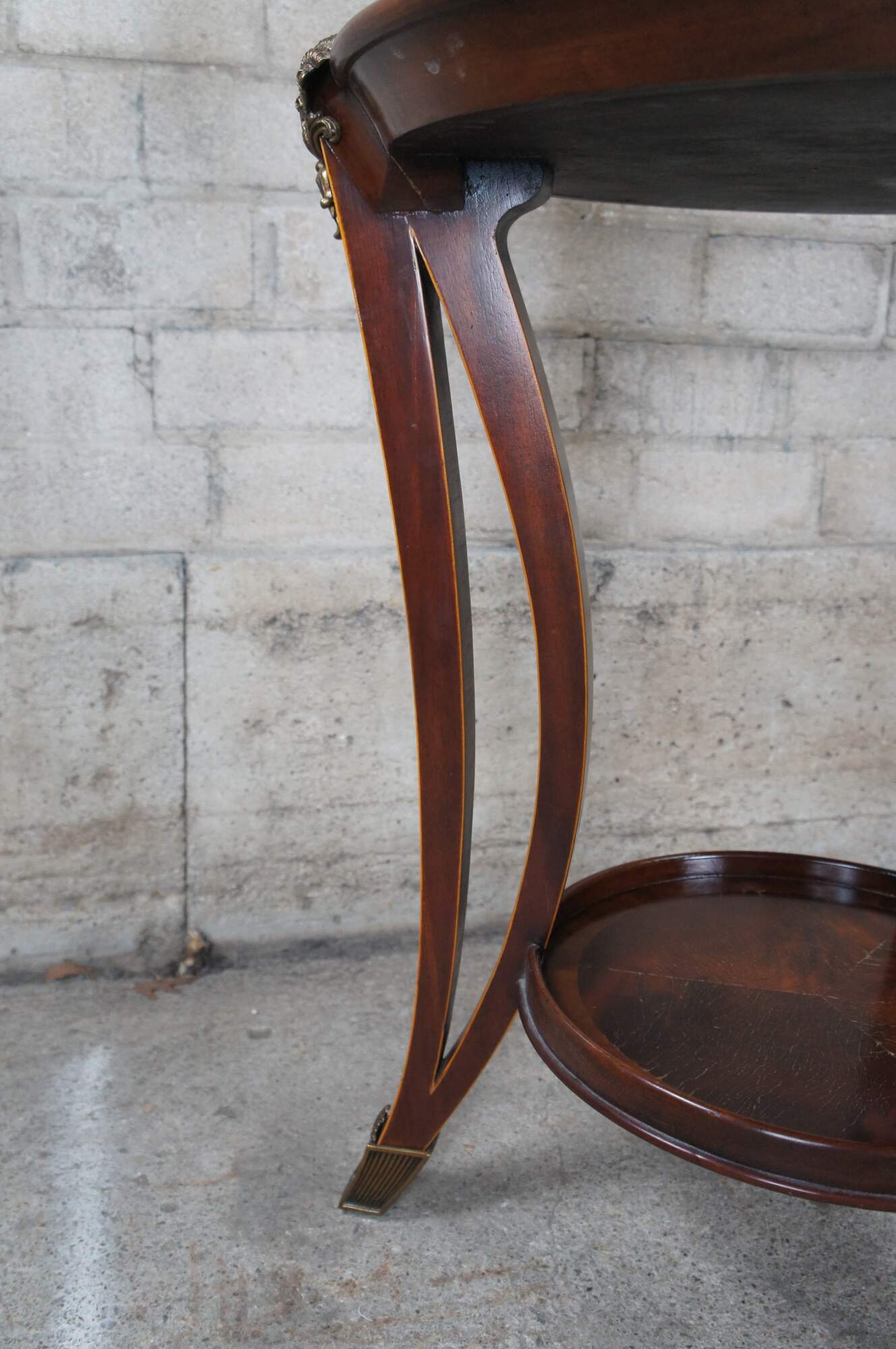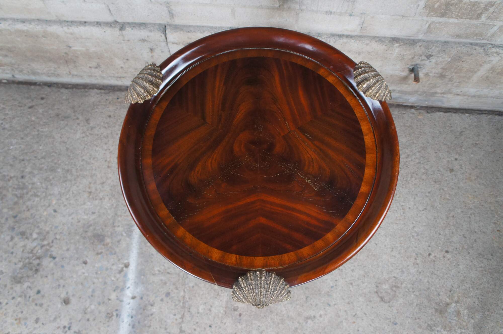 An impressive late 20th century two tier side table / sculpture stand by Maitland Smith. Features a round form inset top over three downswept and pierced square form legs leading to brass capped feet. The top showcases scalloped bronze ormolu mounts above the legs. Made from mahogany with matchbook crotch veneered top with cross banded border. The legs are inlayed along the edges. Table marked with Maitalnd Smith tag along the underside. Inspired by Sheraton & Georgian styling with a little Louis Marjorelle French flair.