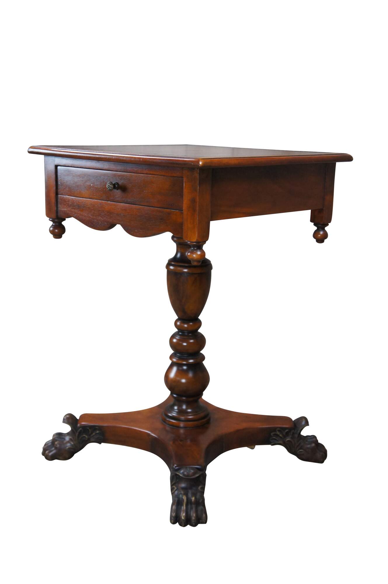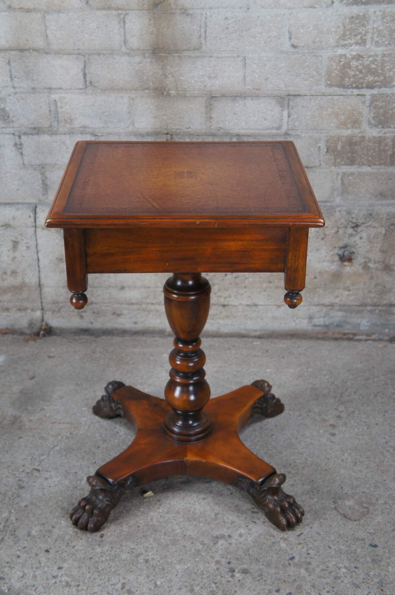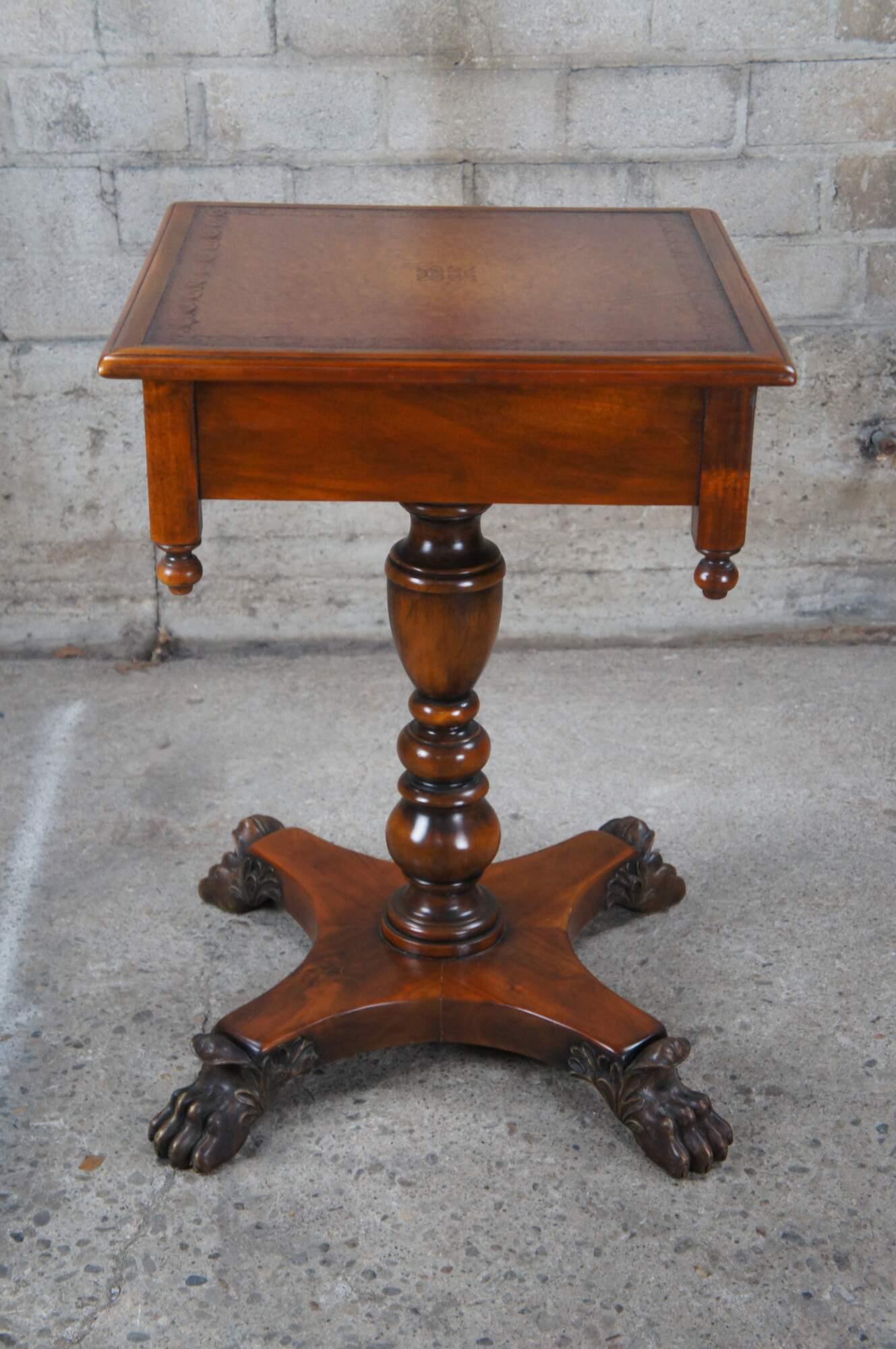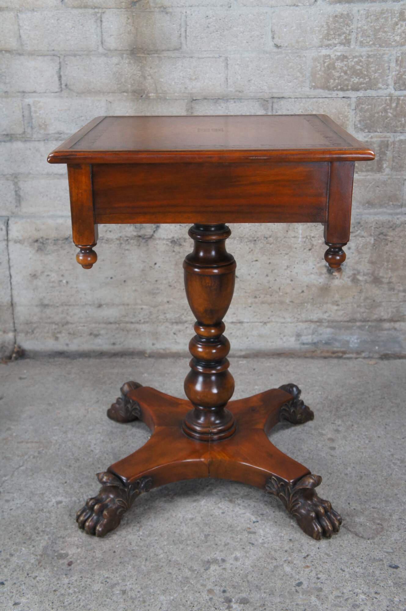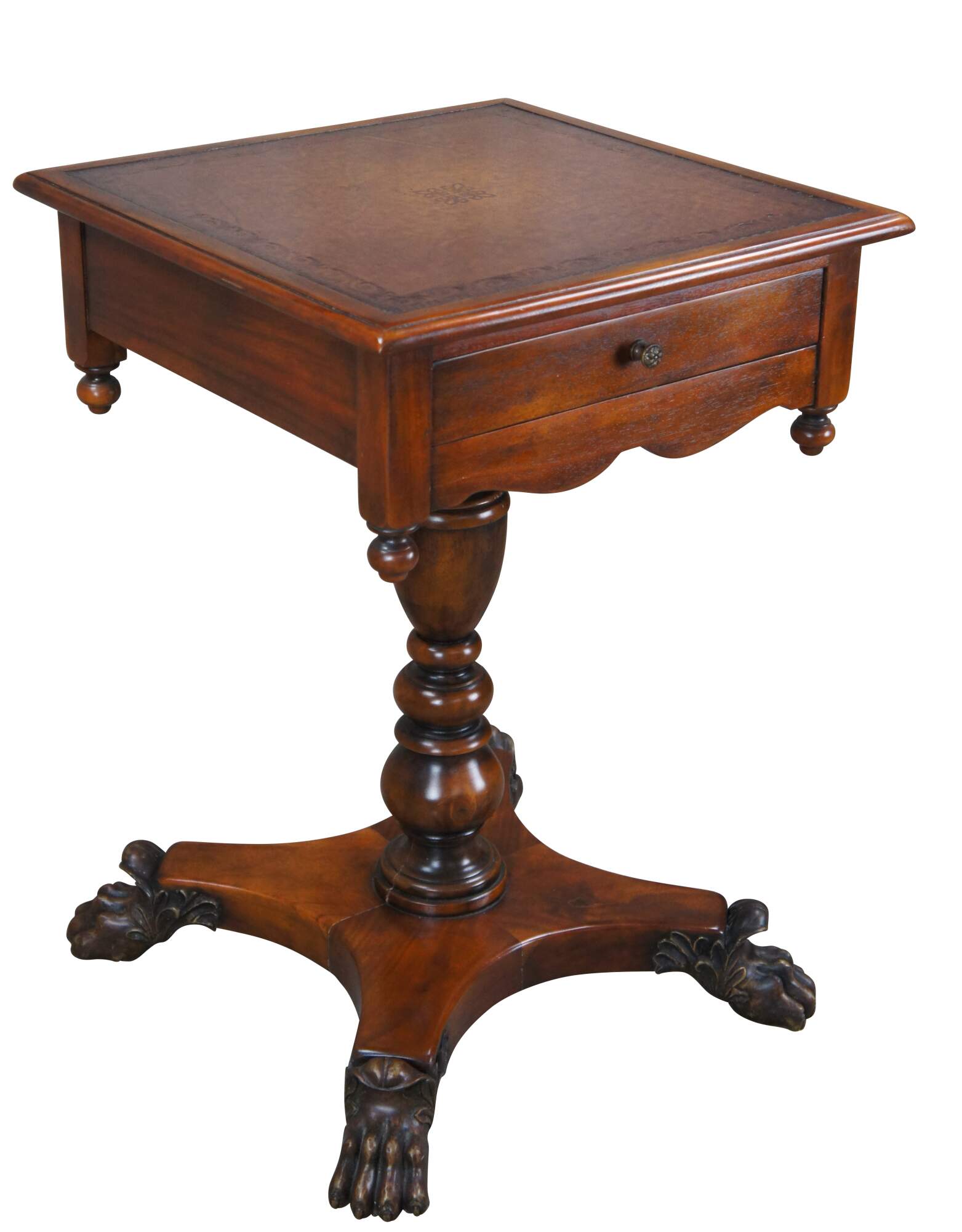 A stately American Empire style side table by Theodore Alexander, Circa late 20th century. This table is styled after a period example from the 1830s. Features a square form Made from mahogany with a topped leather top over frieze with dovetailed drawer. A serpentine is set between downward turned finials. The table is supported by a baluster turned central support leading to a matchbook veneered base with intricately carved paw feet.