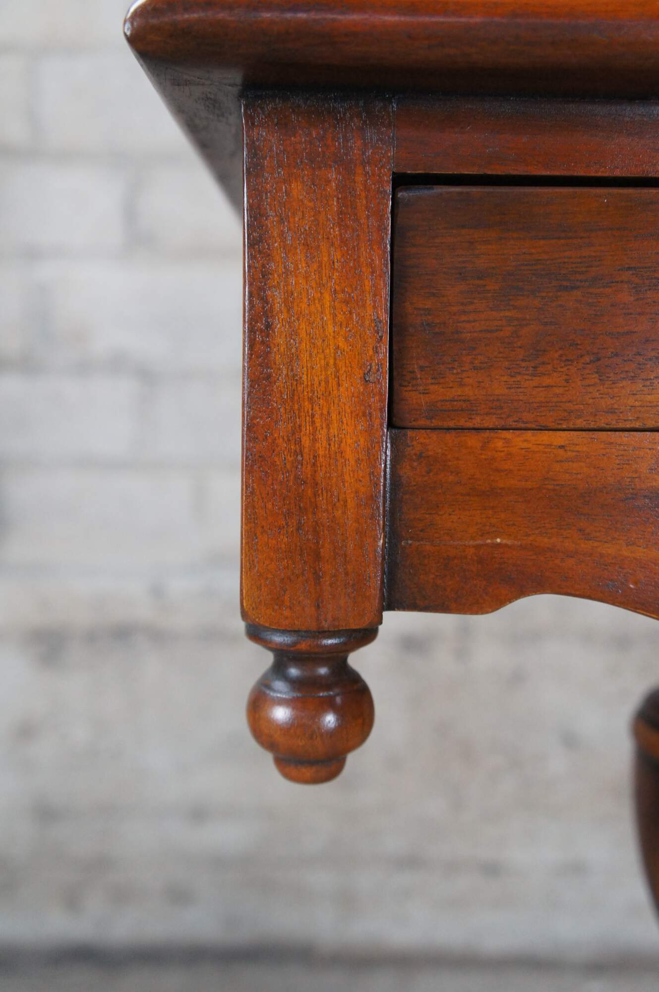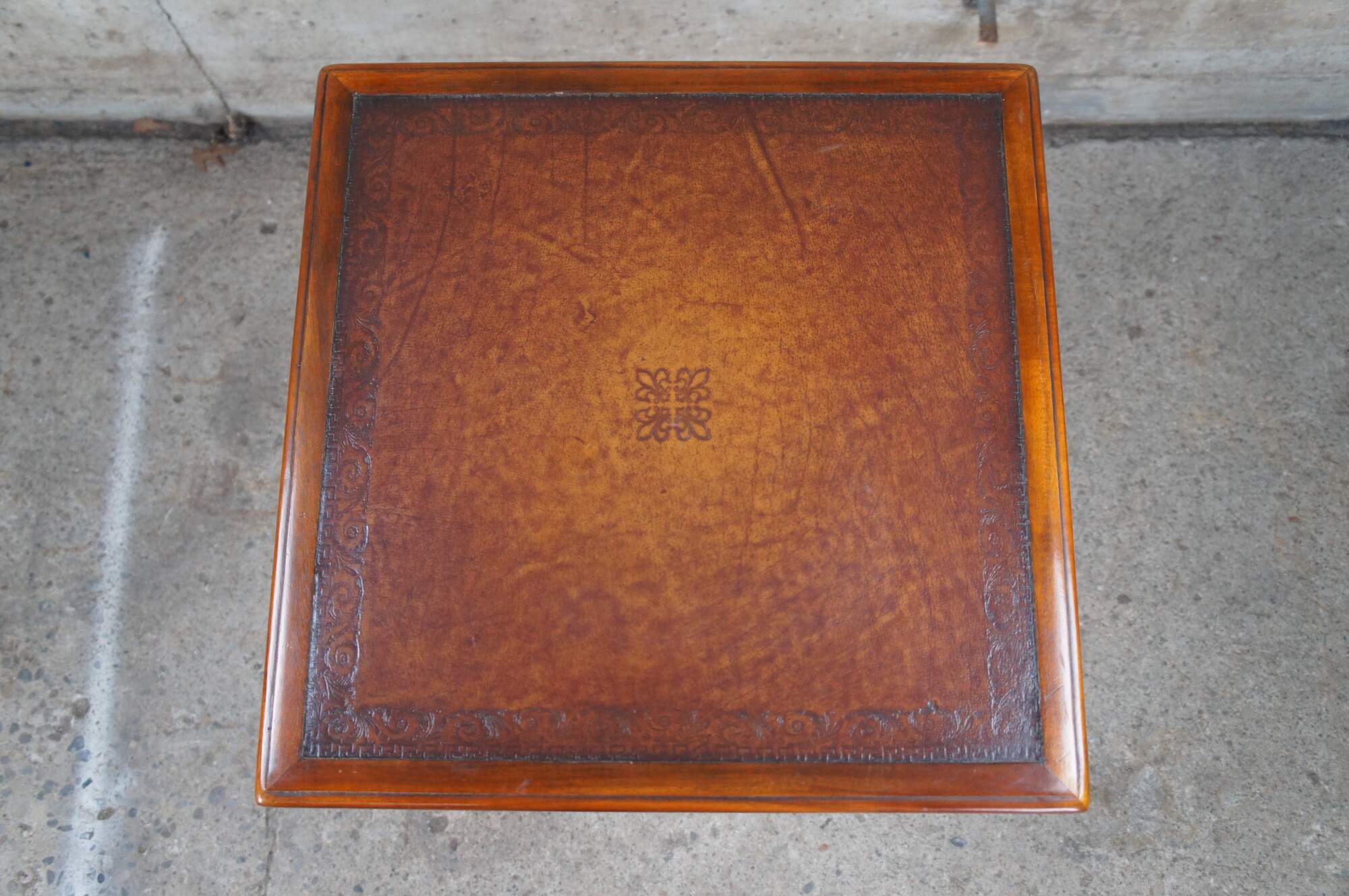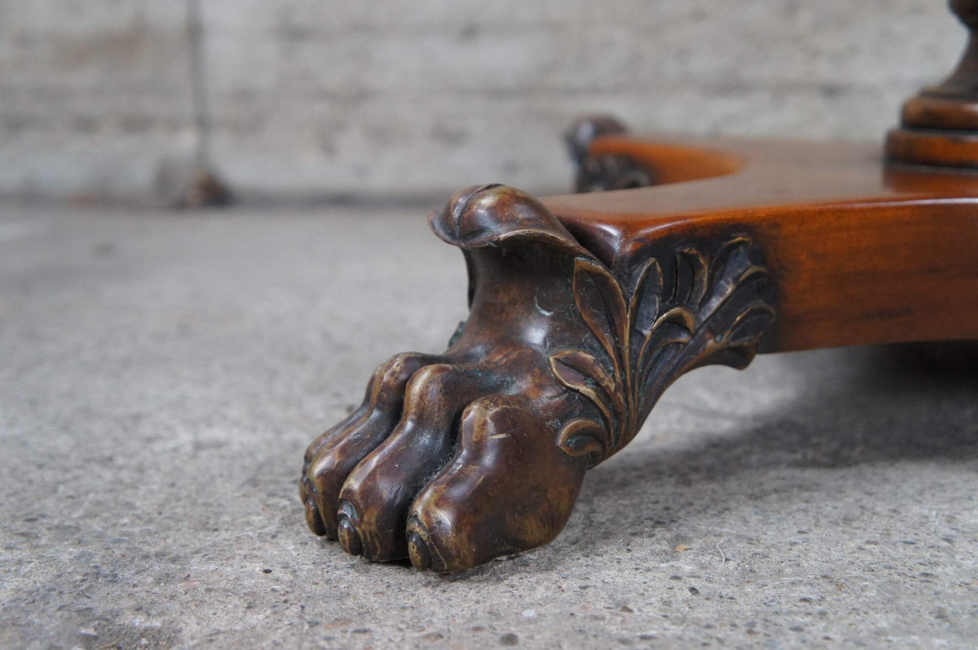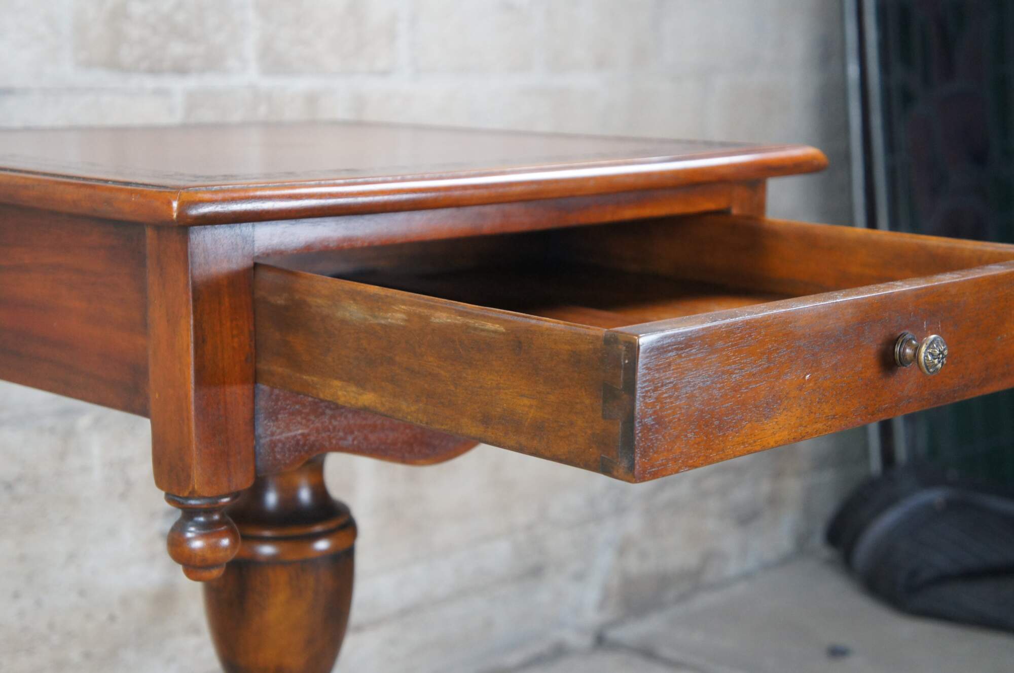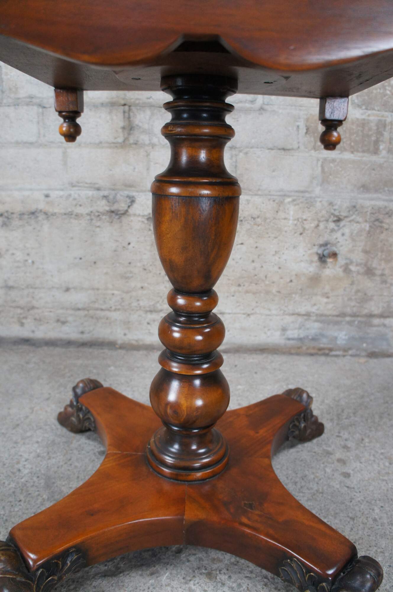 A stately American Empire style side table by Theodore Alexander, Circa late 20th century. This table is styled after a period example from the 1830s. Features a square form Made from mahogany with a topped leather top over frieze with dovetailed drawer. A serpentine is set between downward turned finials. The table is supported by a baluster turned central support leading to a matchbook veneered base with intricately carved paw feet.