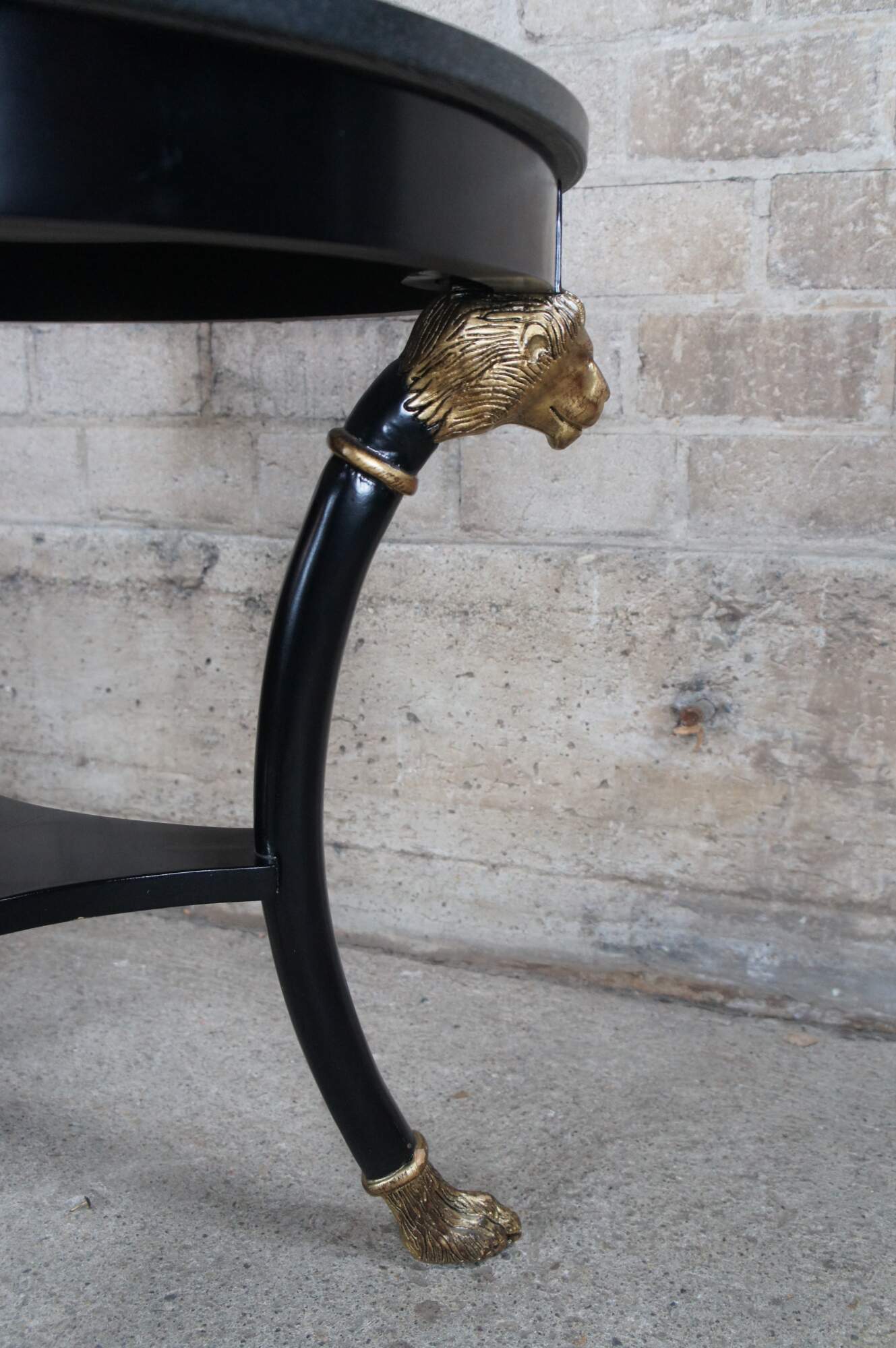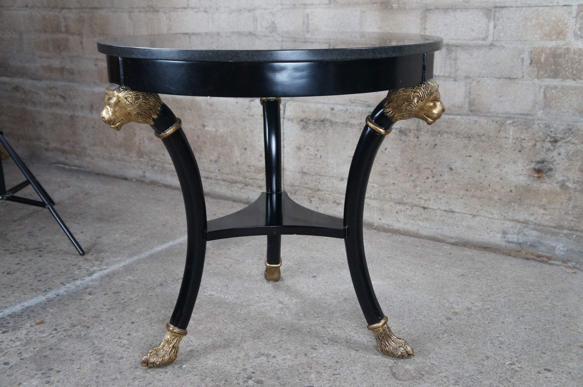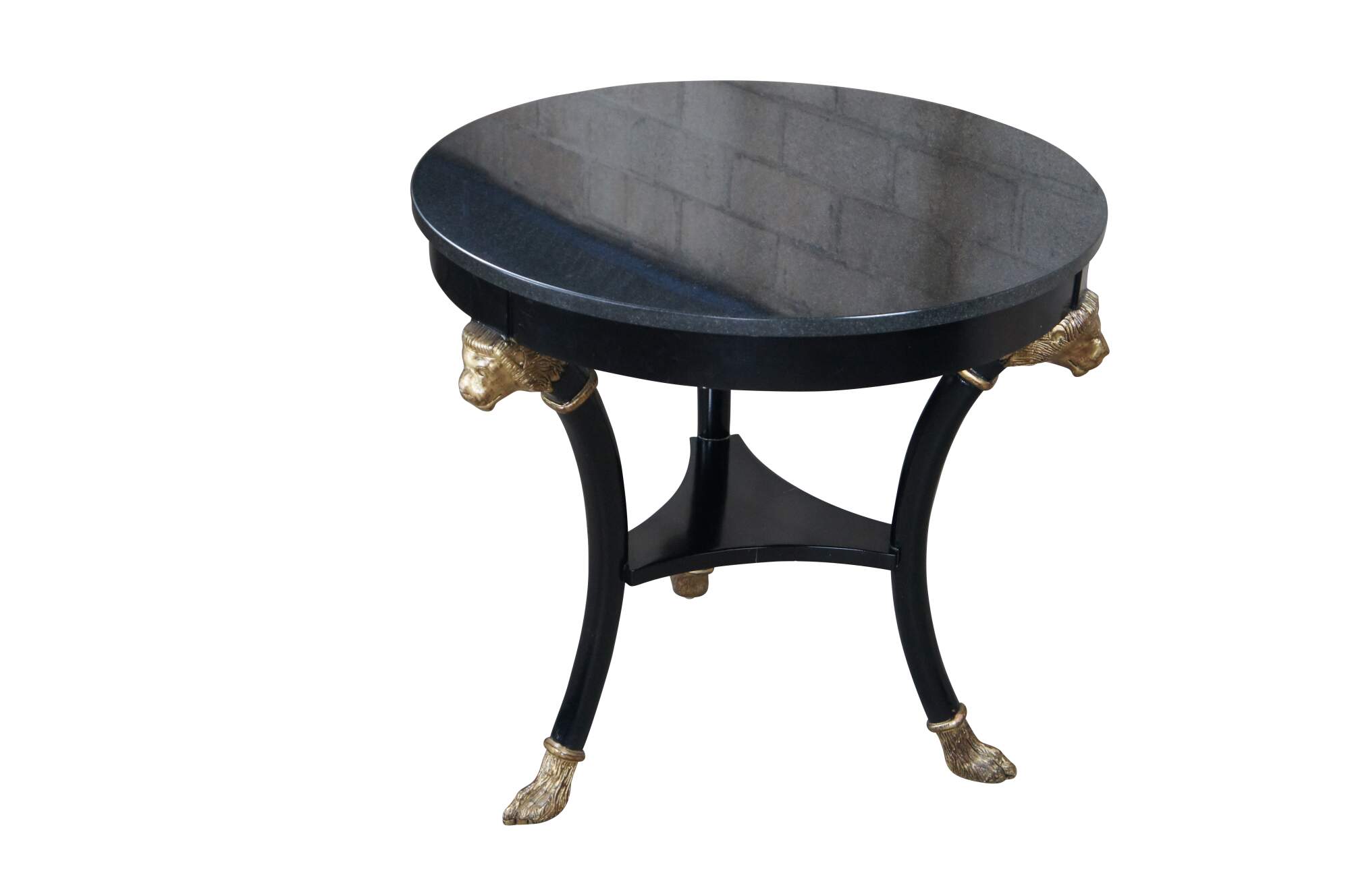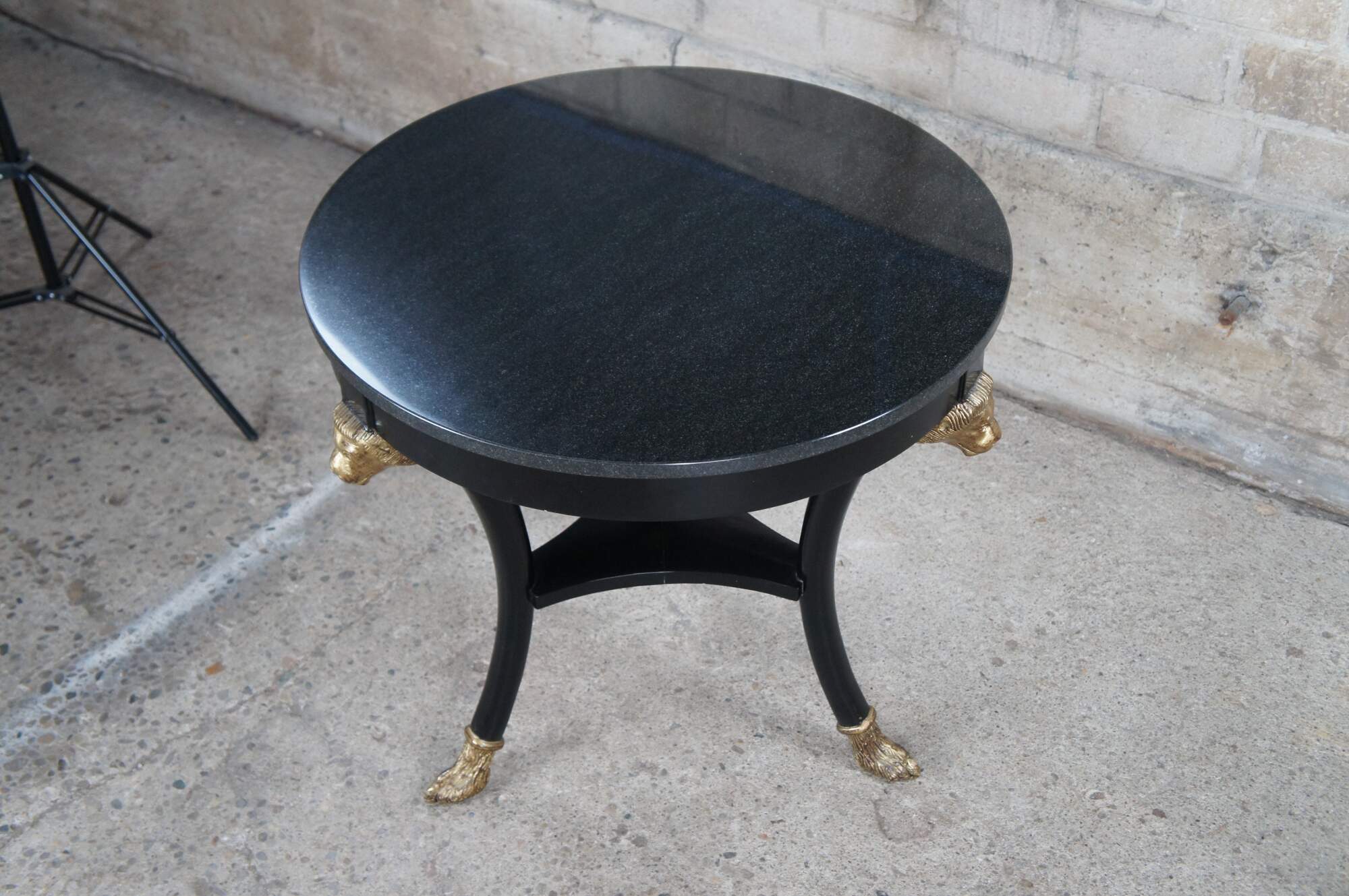 Late 20th Century Baker Furniture Empire / Regency / Neoclassical inspired Gueridon side table. Features a hardwood ebonized frame with dark granite top. The round form is supported by three contoured legs with gold finished lion heads beneath the frieze leading to a triangular trestle or shelf and ornate gold paw feet. The granite top is great touch for this kind of table as it much more stain resistant than marble. Great for use as a lamp / corner table, center (centre) table or bedside nightstand or accent piece.