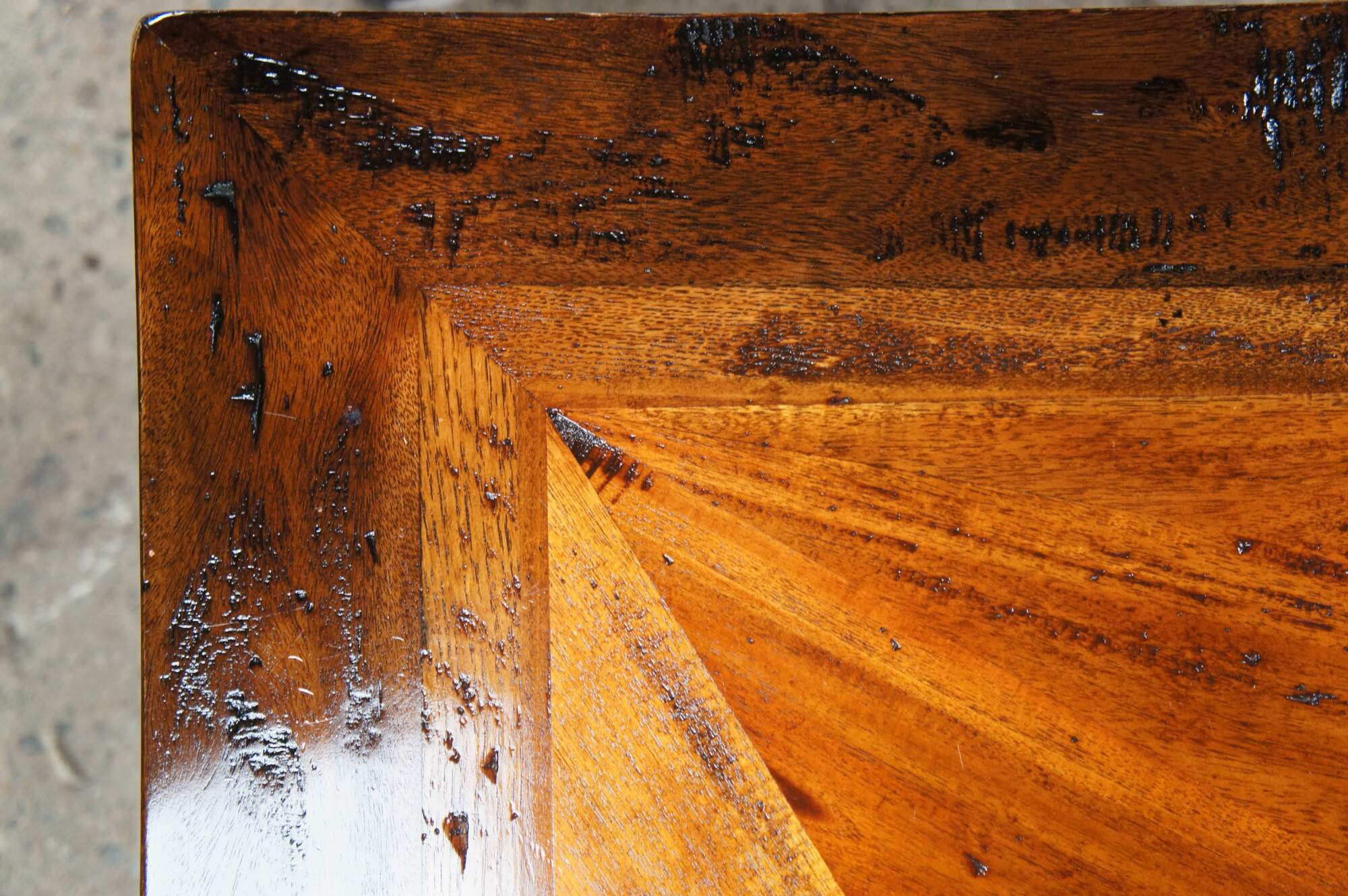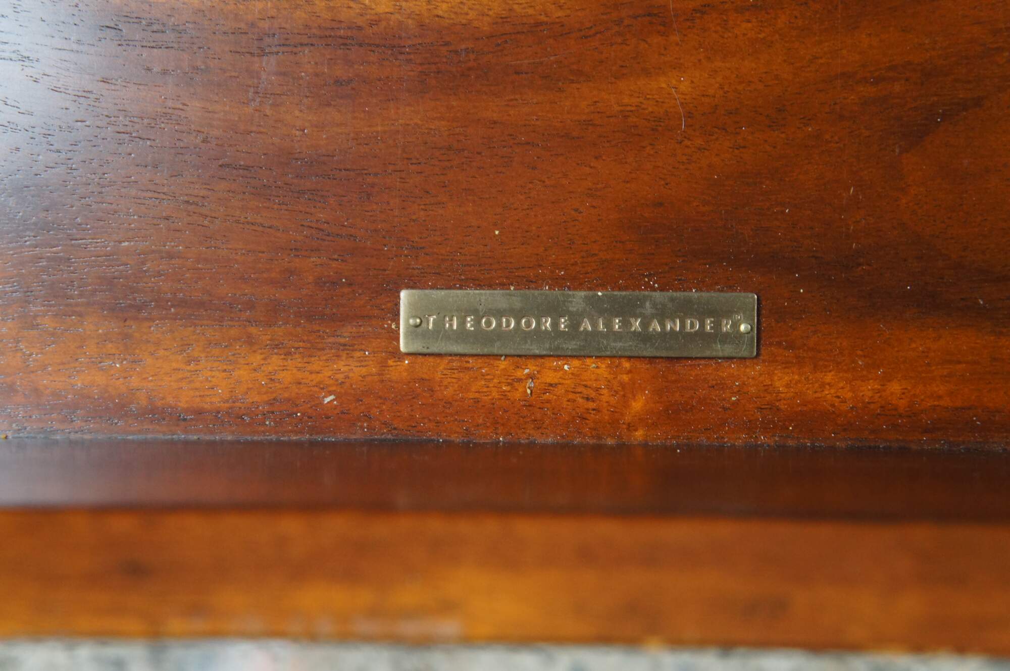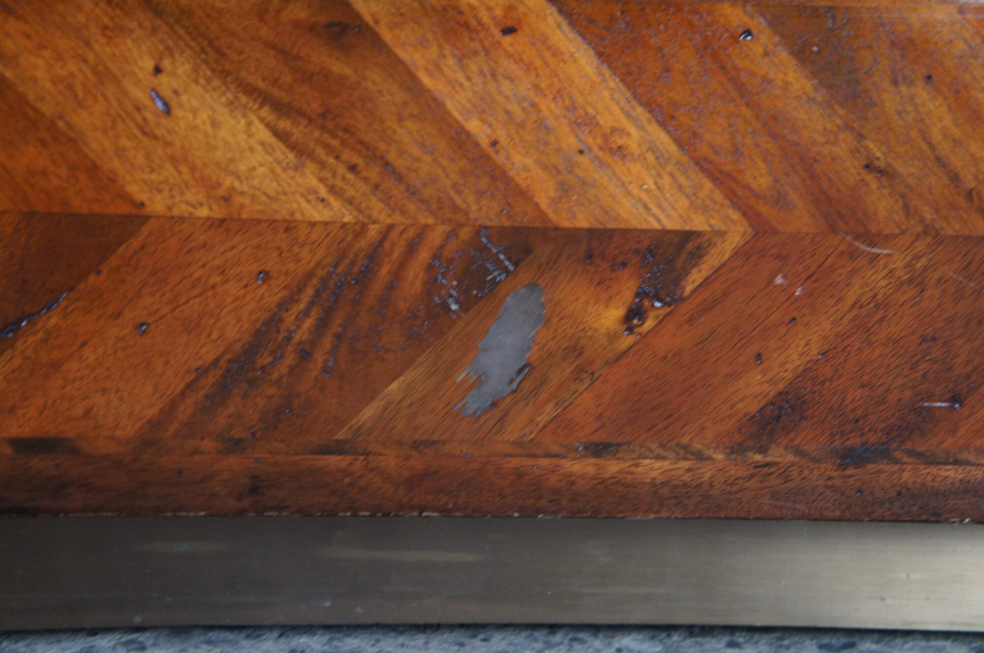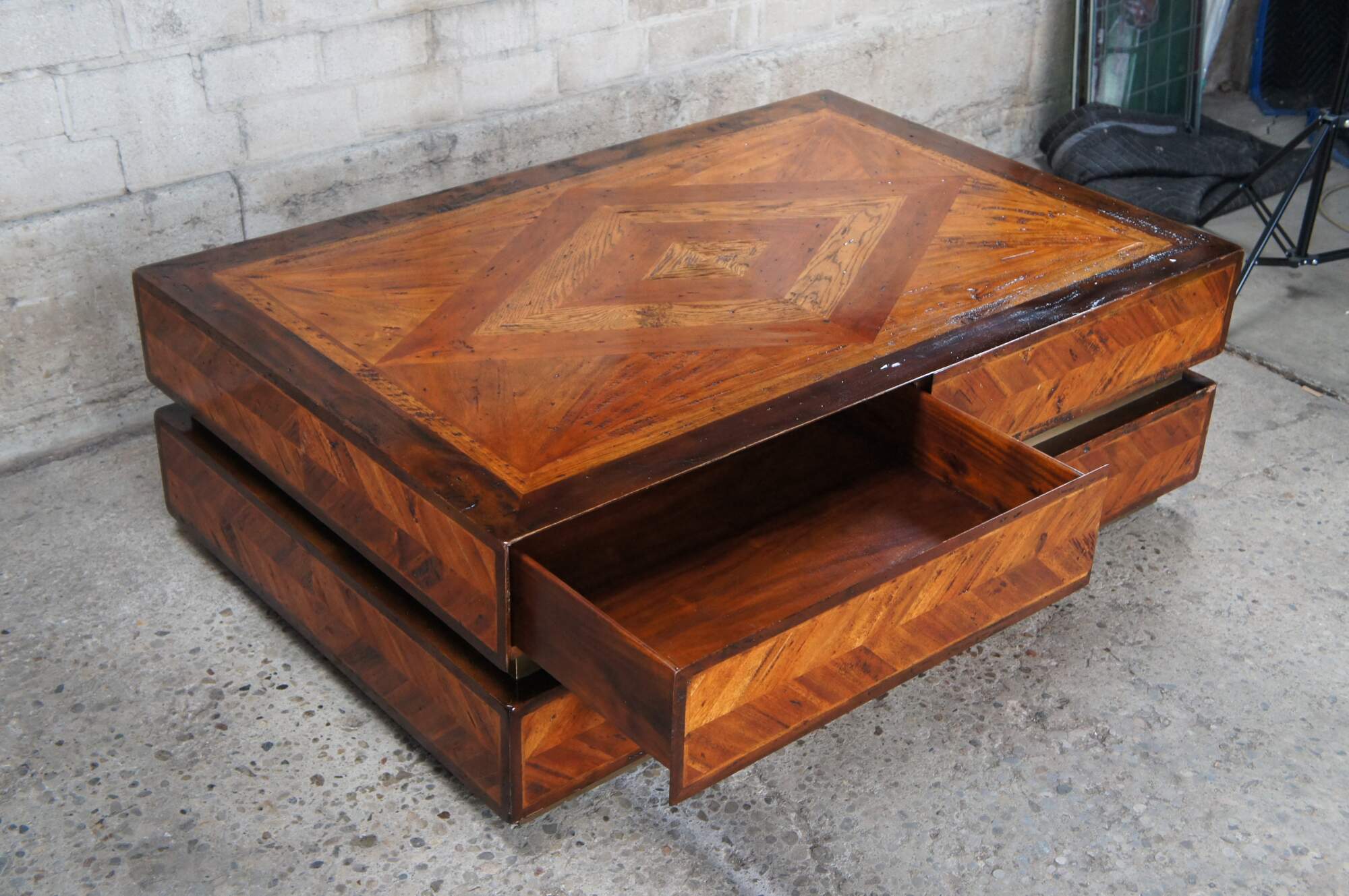 Vintage Theodore Alexander Brunello Sera Cocktail Table; 5100-182. Features a geometric lozenge parquetry fashioned out of hand selected acacia, oak and parawood. Concealed drawers provide storage space without detracting from the look of the piece, which includes decorative wood grain paneling along the frieze and base. Inset brass bands separate the wo levels of wood on each side. The tables low modern form blends well in any mid century modern, contemporary or traditional space. A unique find as this table is sold out quickly and rarely comes to market.