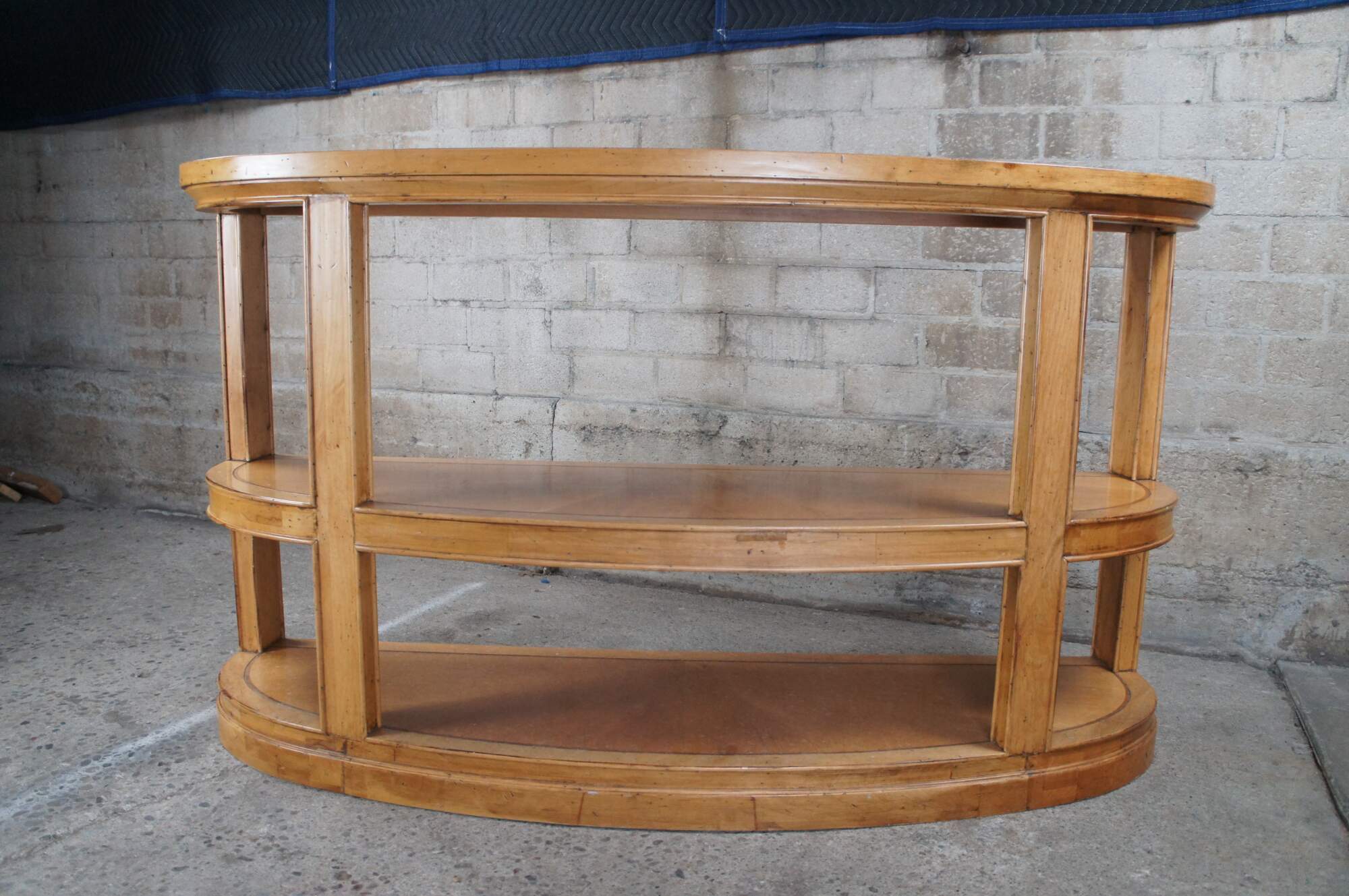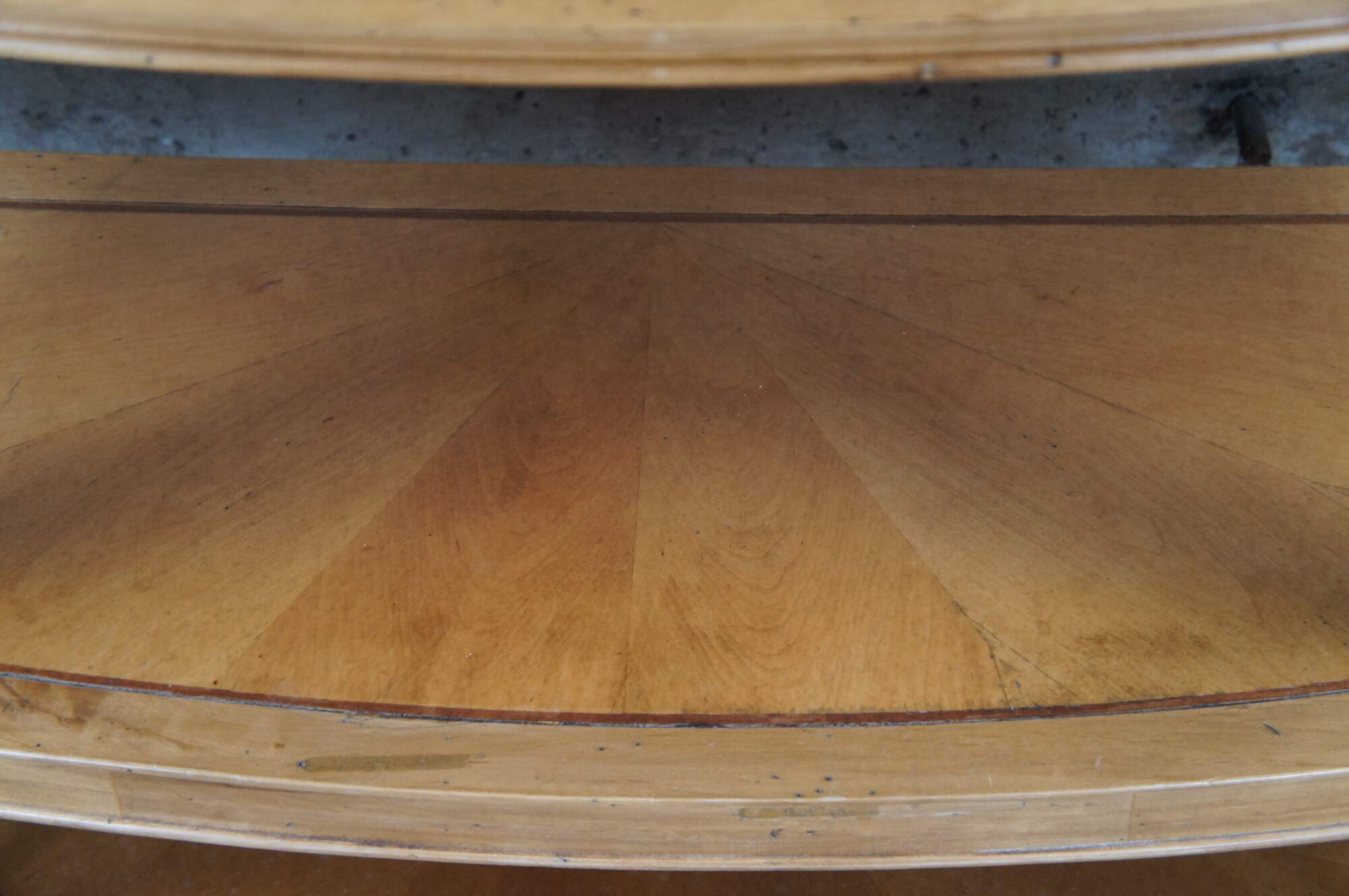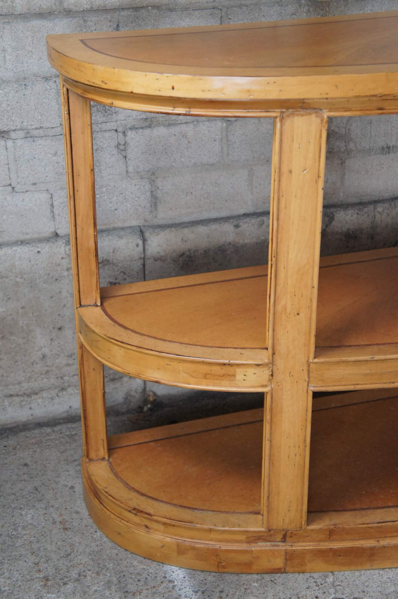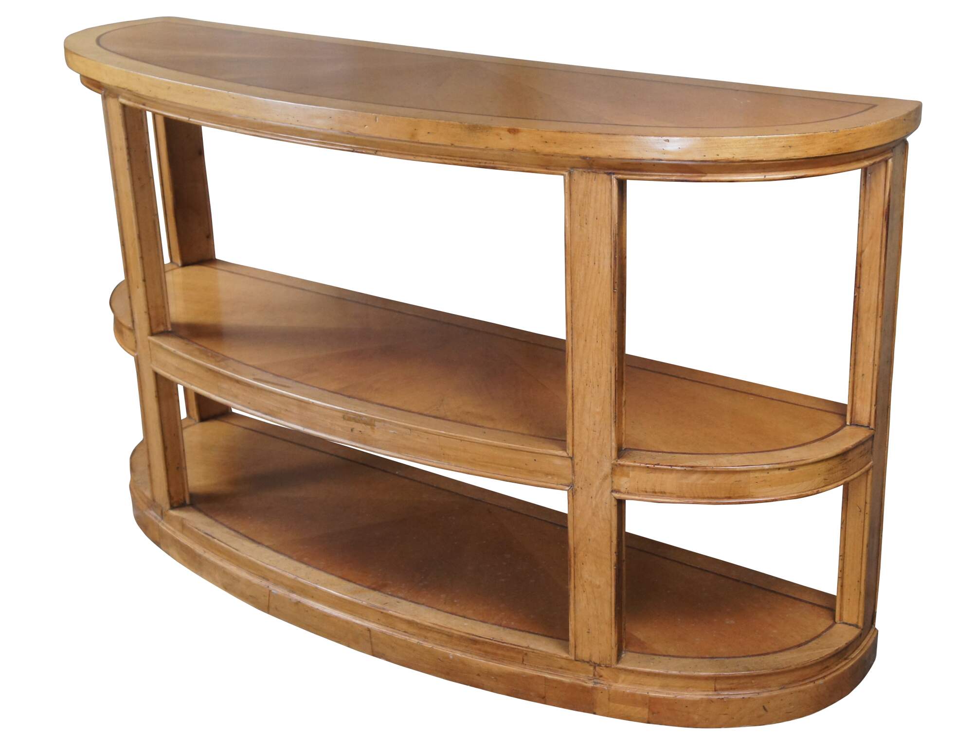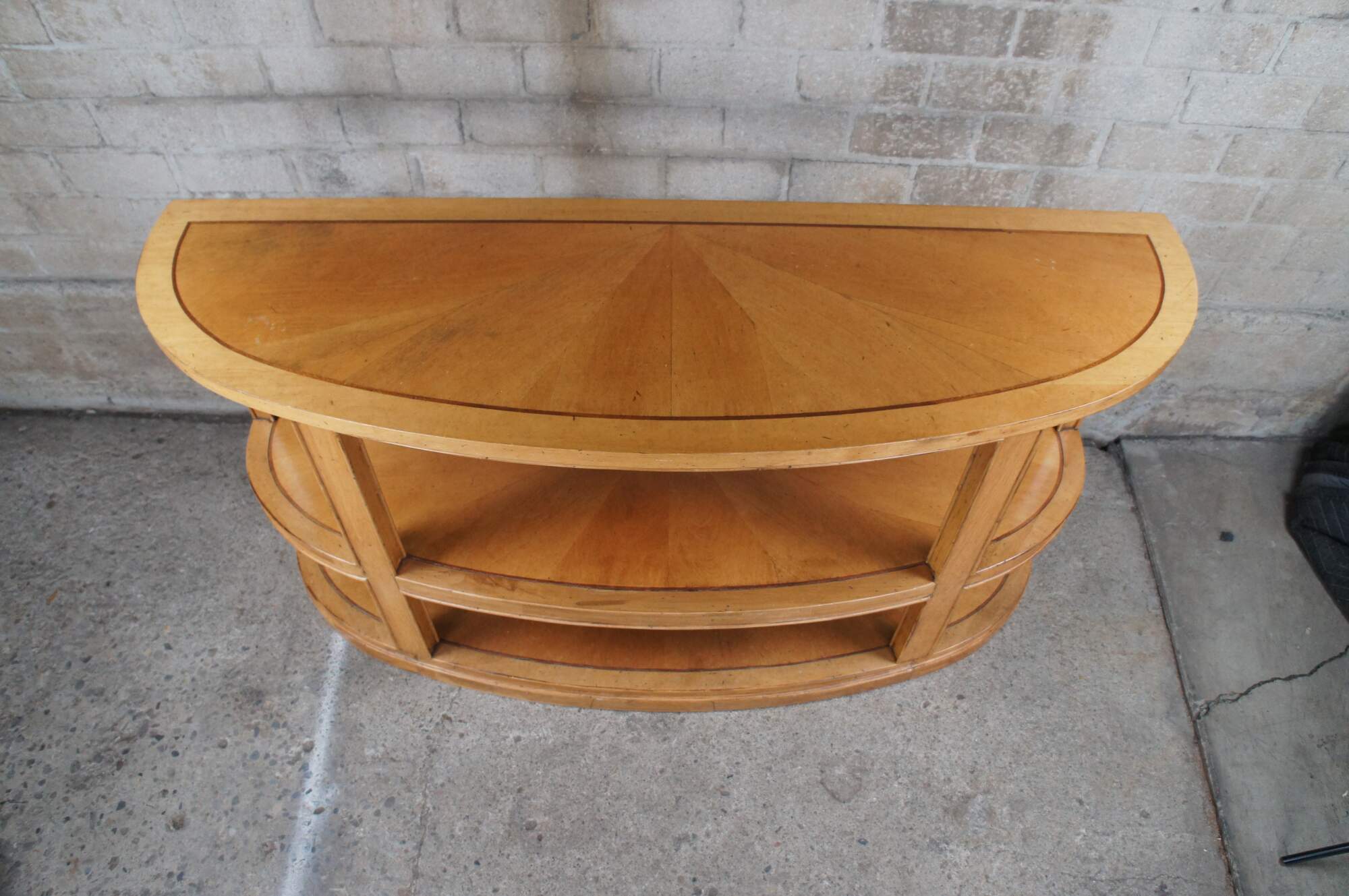 Kravet Furniture demilune console table. Features a tri tiered demilune form made from maple with inlaid border. The table surfaces have a matchbook veneer pattern showcasing a a beautiful sunburst design. Great for use as a entry or hall table, sofa table, entertainment / media console or TV stand.