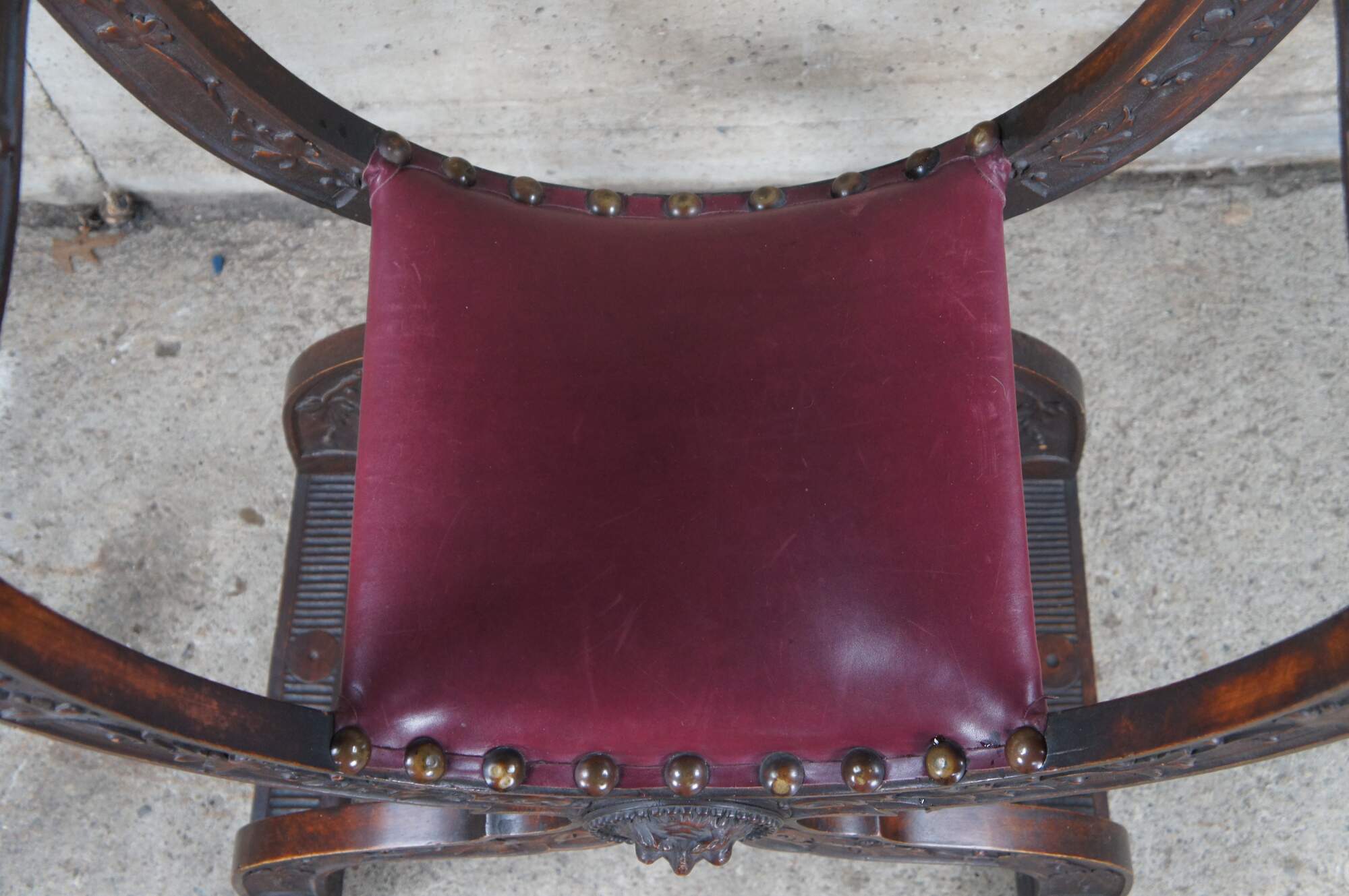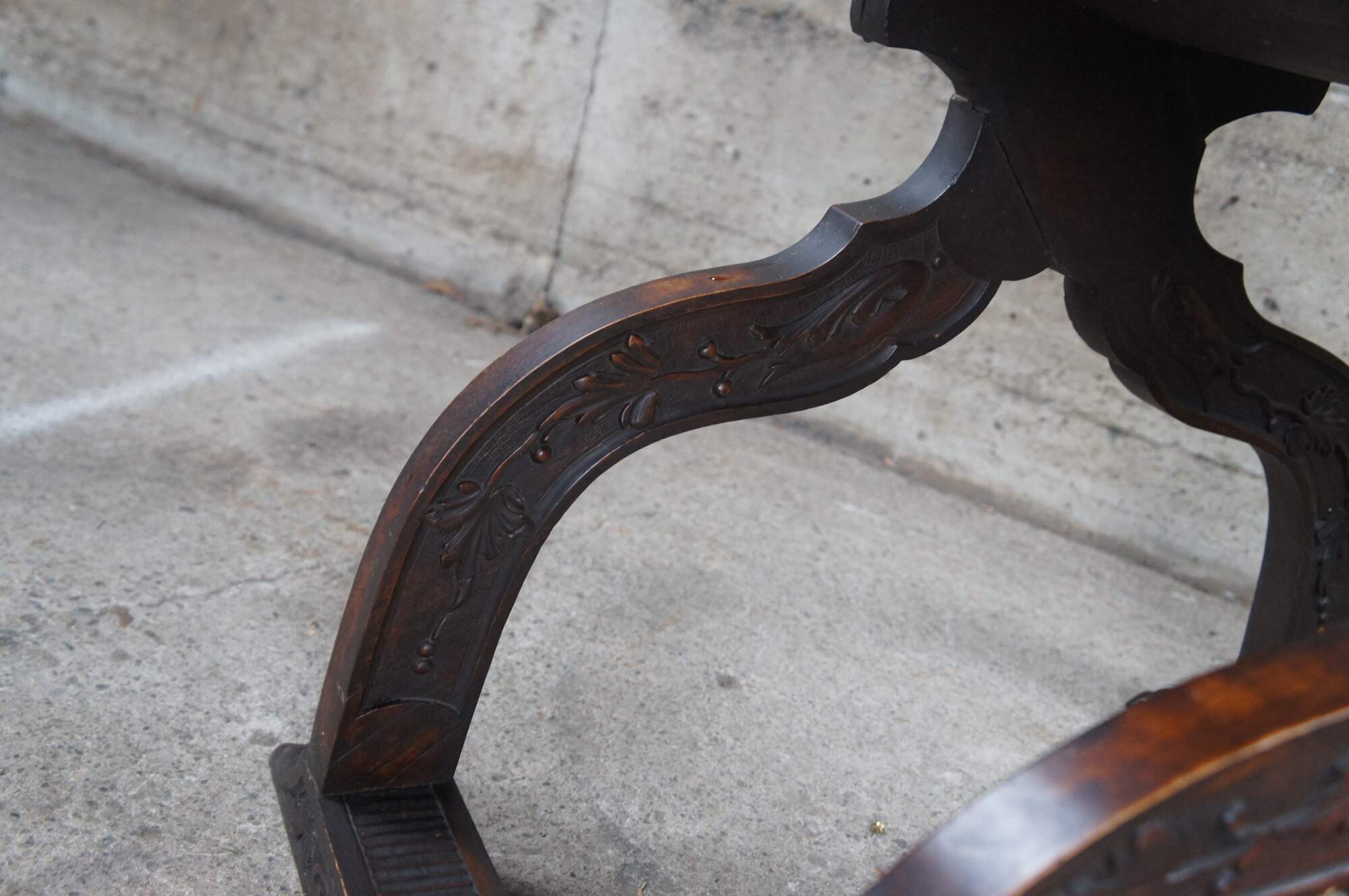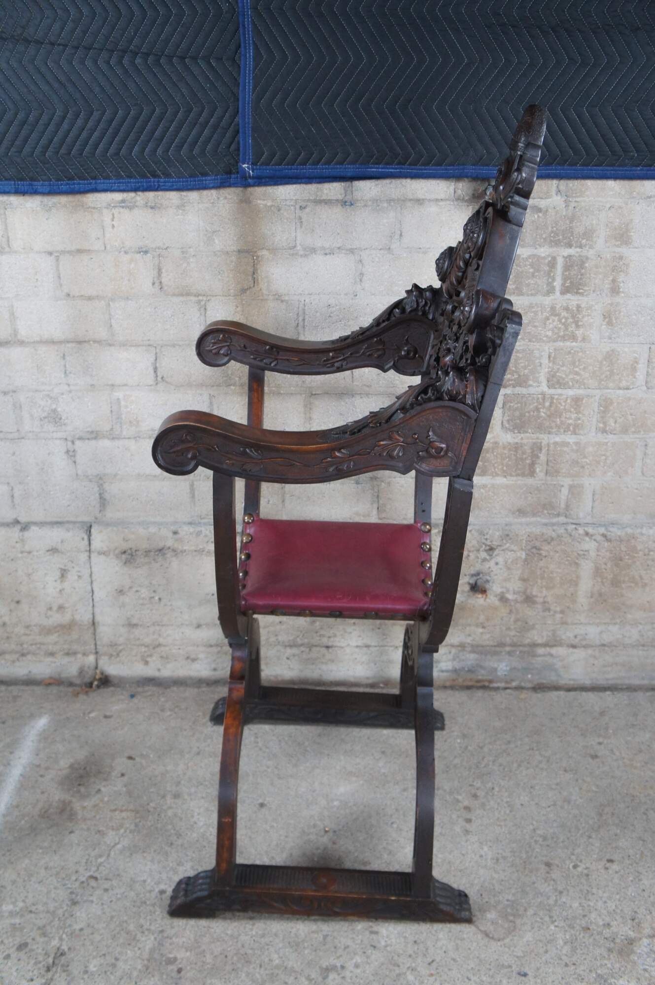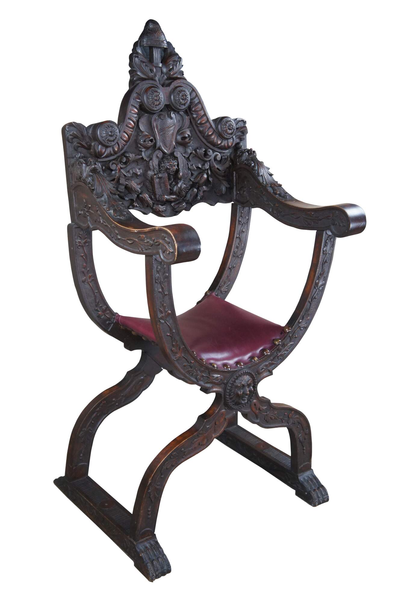 Exception mid 19th century Italian Renaissance Revival Savonarola Curule Arm Chair. Features a meticulously carved walnut frame with leather seat. The back is showcased by a winged lion holding a tablet beneath a shield. Both motifs are surrounded by neoclassical ribboning and carved foliate. The crest rail is arched with converging S scrolls with robust medallions and an Egg and Dart carved molding. The backing has a unique topper of tulips beneath what appears to be a hat or crown. Leading down from the back to the downswept arms are high relief northwind faces. Each breathing acanthus leaf from their mouth. Beneath the arms the "X" form supports are carved along the front with a vine and leaf motif. Chair center has circular beaded medallion with northwind face, reminiscent of the Sun. The contoured legs terminate to claw feet, each connected from front to back with acanthus and fluted detail. A truly remarkable chair that is really unparallel to any other example out there.