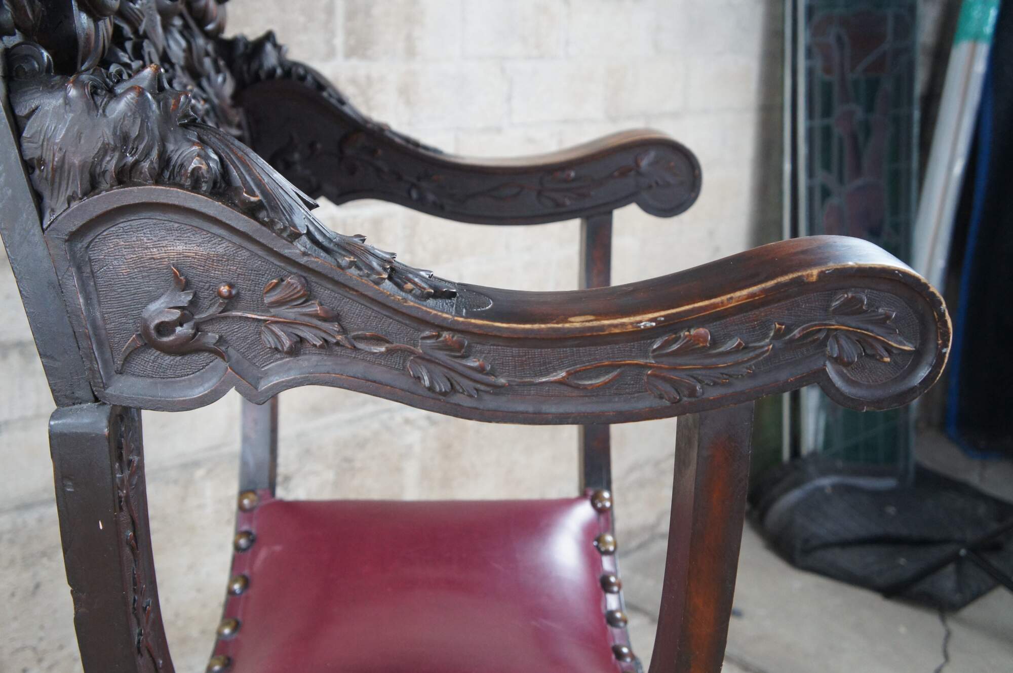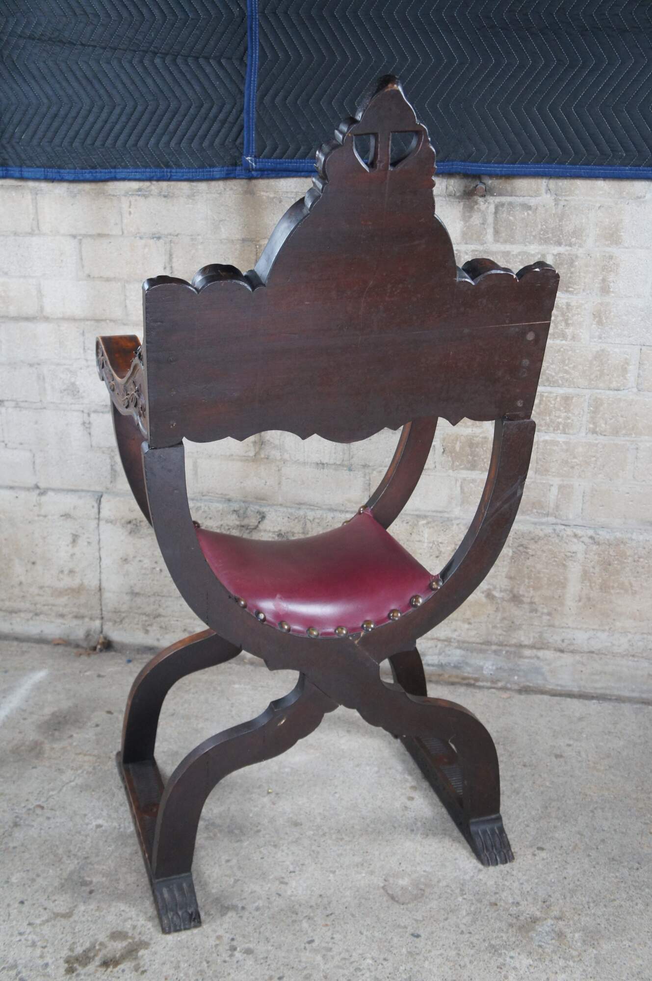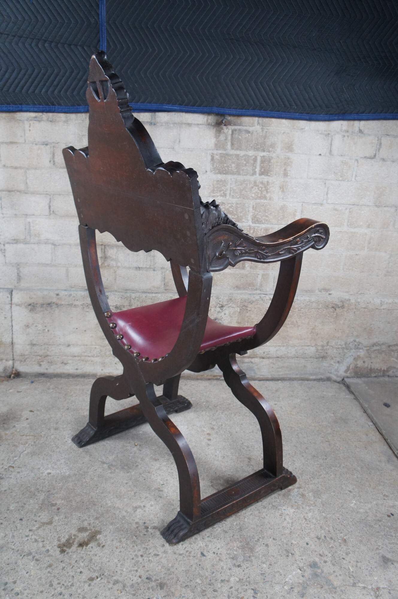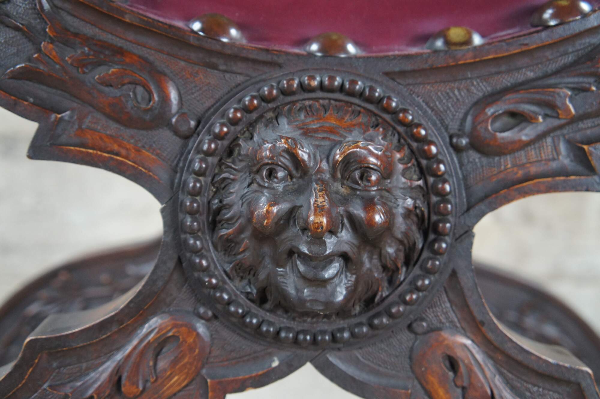 Exception mid 19th century Italian Renaissance Revival Savonarola Curule Arm Chair. Features a meticulously carved walnut frame with leather seat. The back is showcased by a winged lion holding a tablet beneath a shield. Both motifs are surrounded by neoclassical ribboning and carved foliate. The crest rail is arched with converging S scrolls with robust medallions and an Egg and Dart carved molding. The backing has a unique topper of tulips beneath what appears to be a hat or crown. Leading down from the back to the downswept arms are high relief northwind faces. Each breathing acanthus leaf from their mouth. Beneath the arms the "X" form supports are carved along the front with a vine and leaf motif. Chair center has circular beaded medallion with northwind face, reminiscent of the Sun. The contoured legs terminate to claw feet, each connected from front to back with acanthus and fluted detail. A truly remarkable chair that is really unparallel to any other example out there.