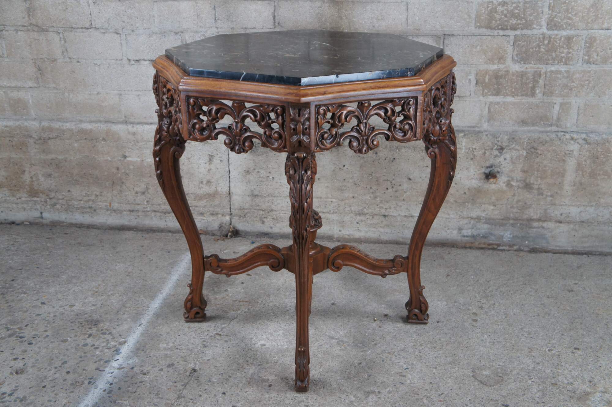 Antique Italian Renaissance center (centre) or side table. Features an octagonal frame carved from walnut with a pierced foliate apron over four acanthus carved downswept legs leading to footed and scrolled feet. The legs are connected by thick foliate carved "S" scroll stretchers connected at the center by a beautiful trophy urn with flowers. Table top is raised marble with black, white and beige veins. A stunning addition to any space