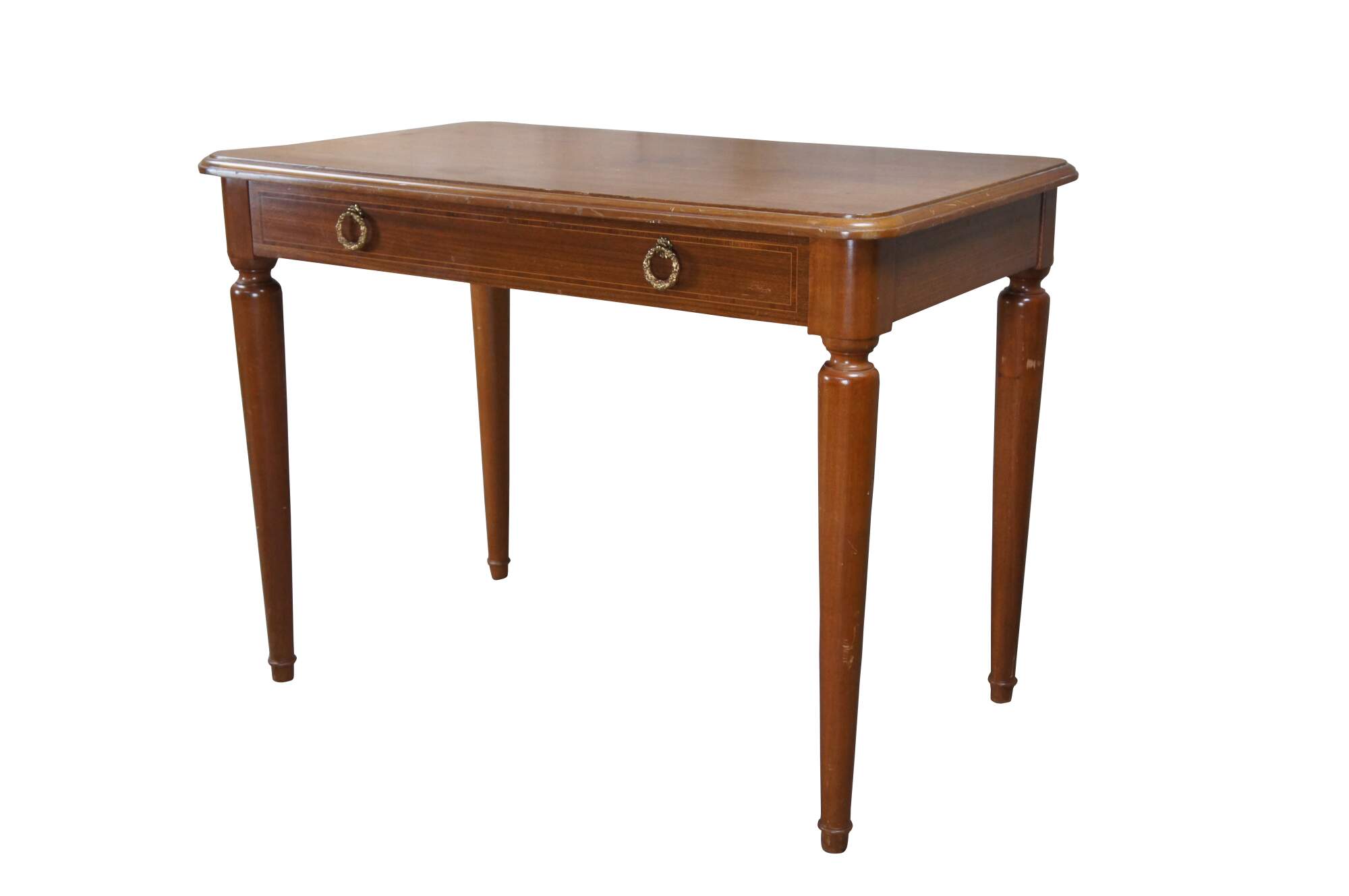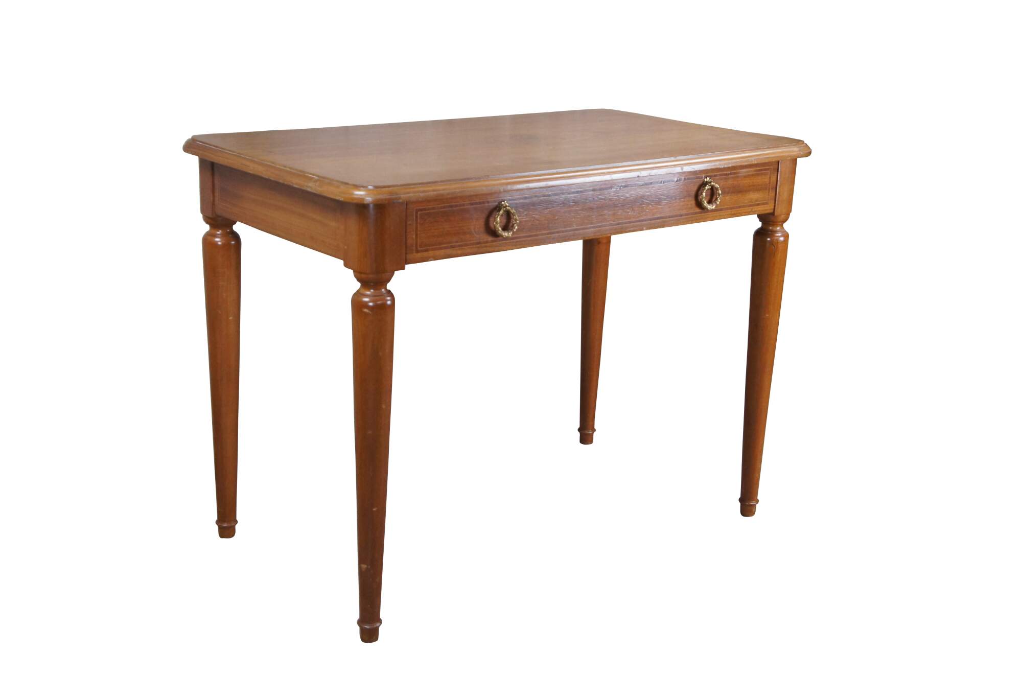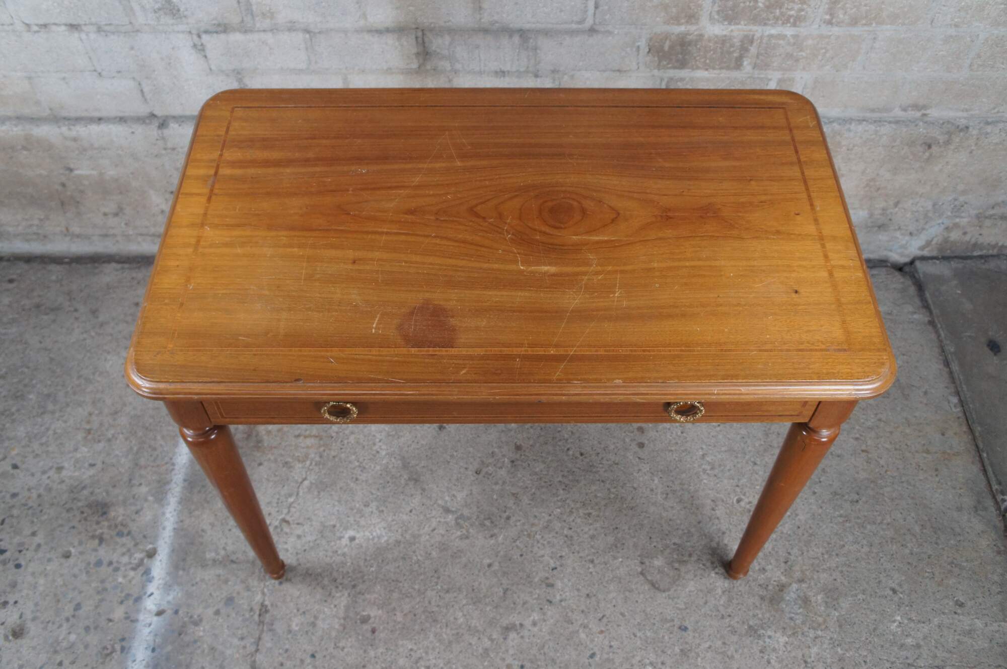 Antique 1930s French Louis XVI style cherry desk with dovetailed drawer. Made from cherry with crossbanded inlay and ormolu drawer pulls. The desk is supported by turned and tapered legs.