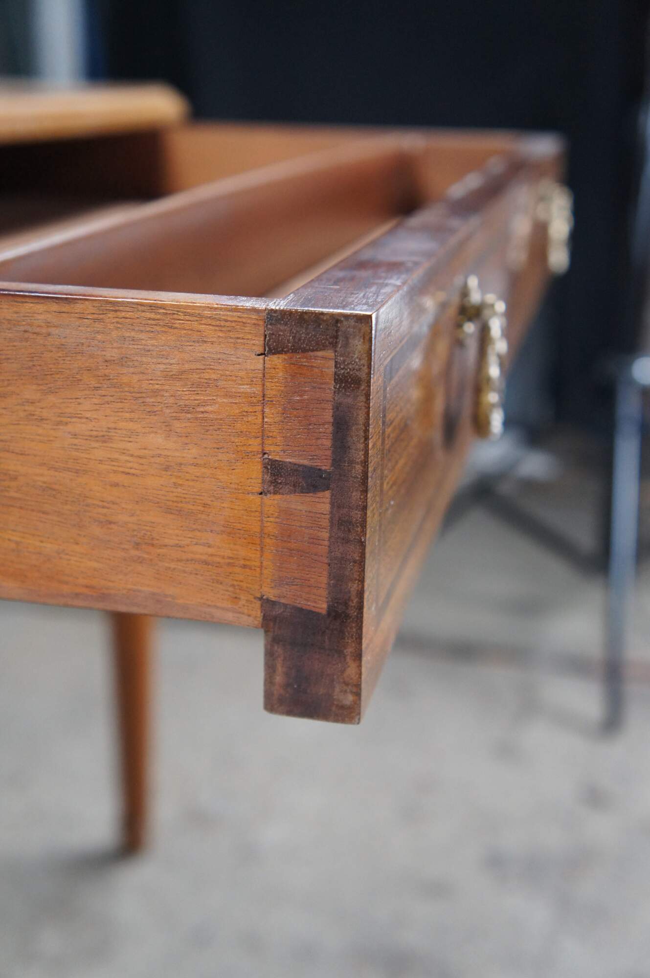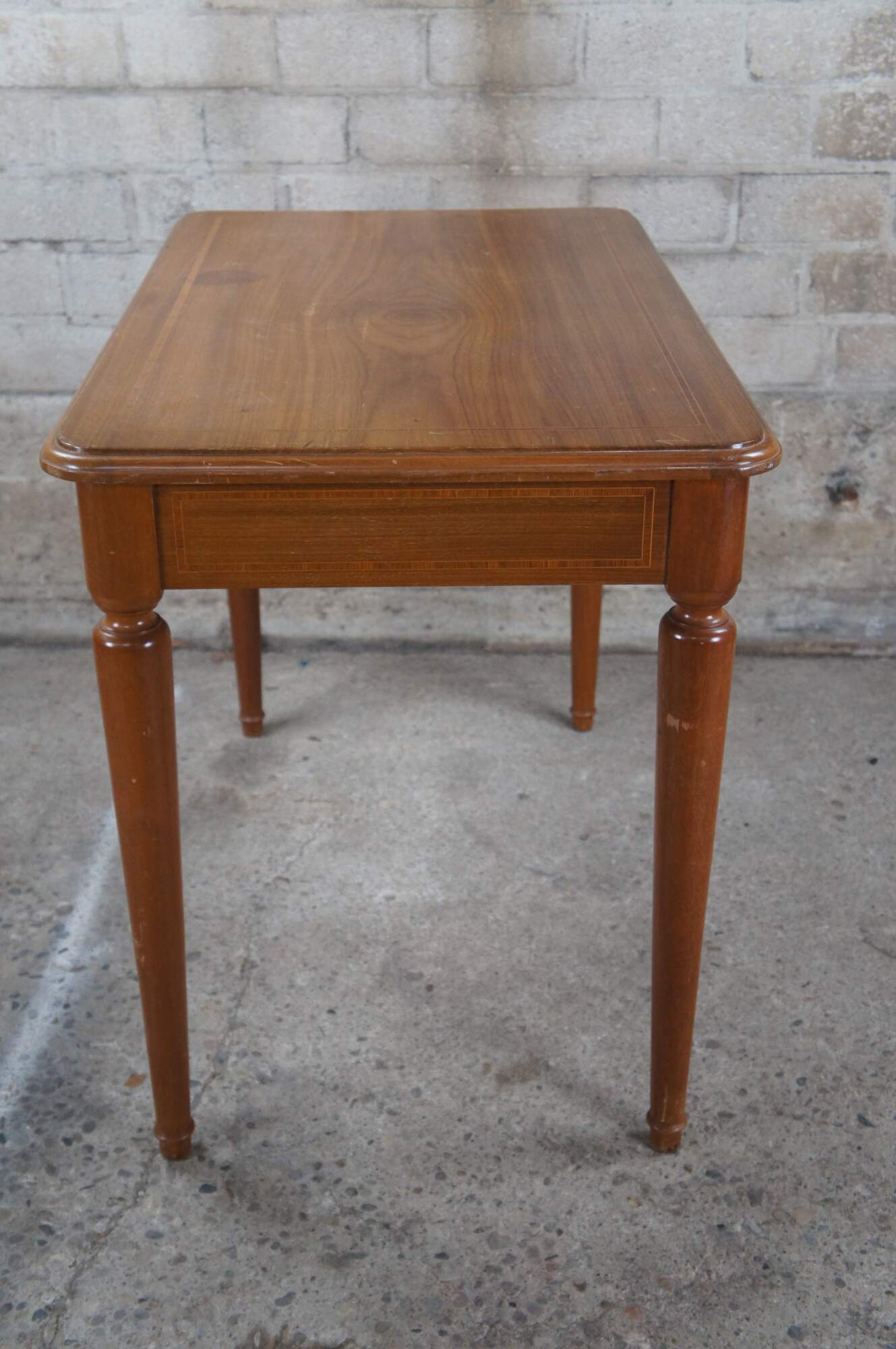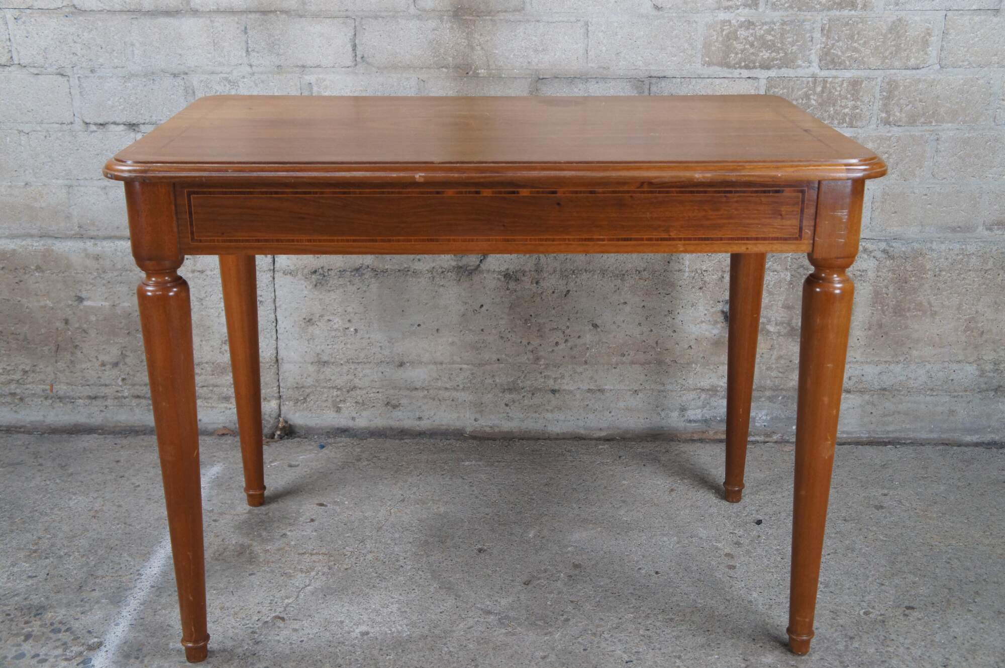 Antique 1930s French Louis XVI style cherry desk with dovetailed drawer. Made from cherry with crossbanded inlay and ormolu drawer pulls. The desk is supported by turned and tapered legs.