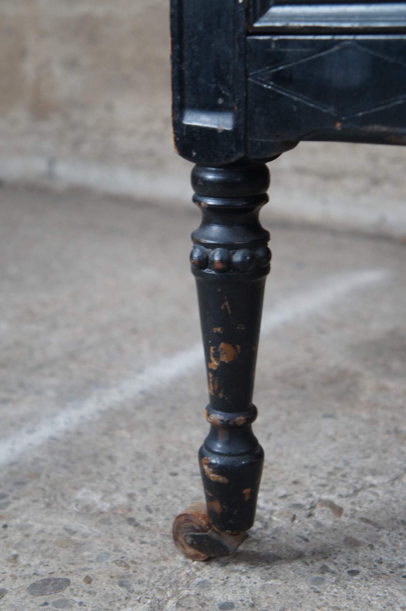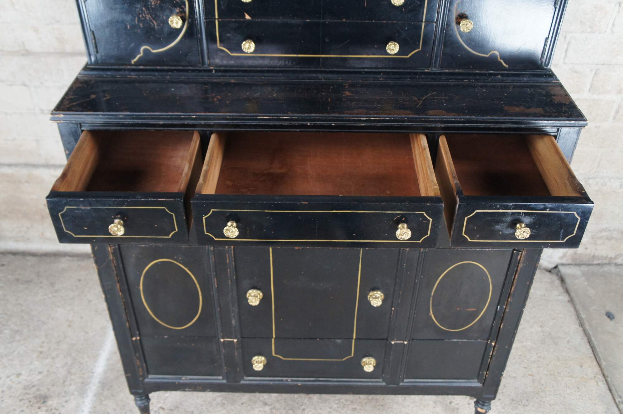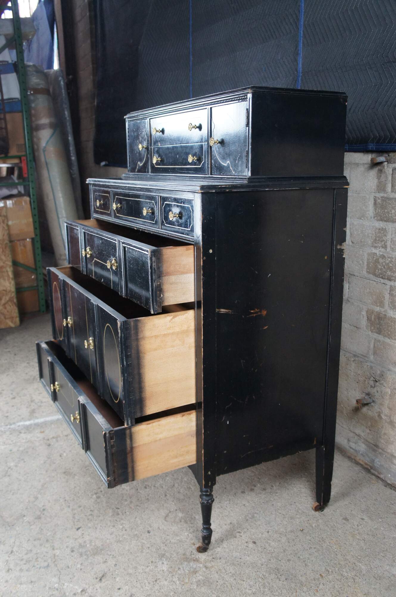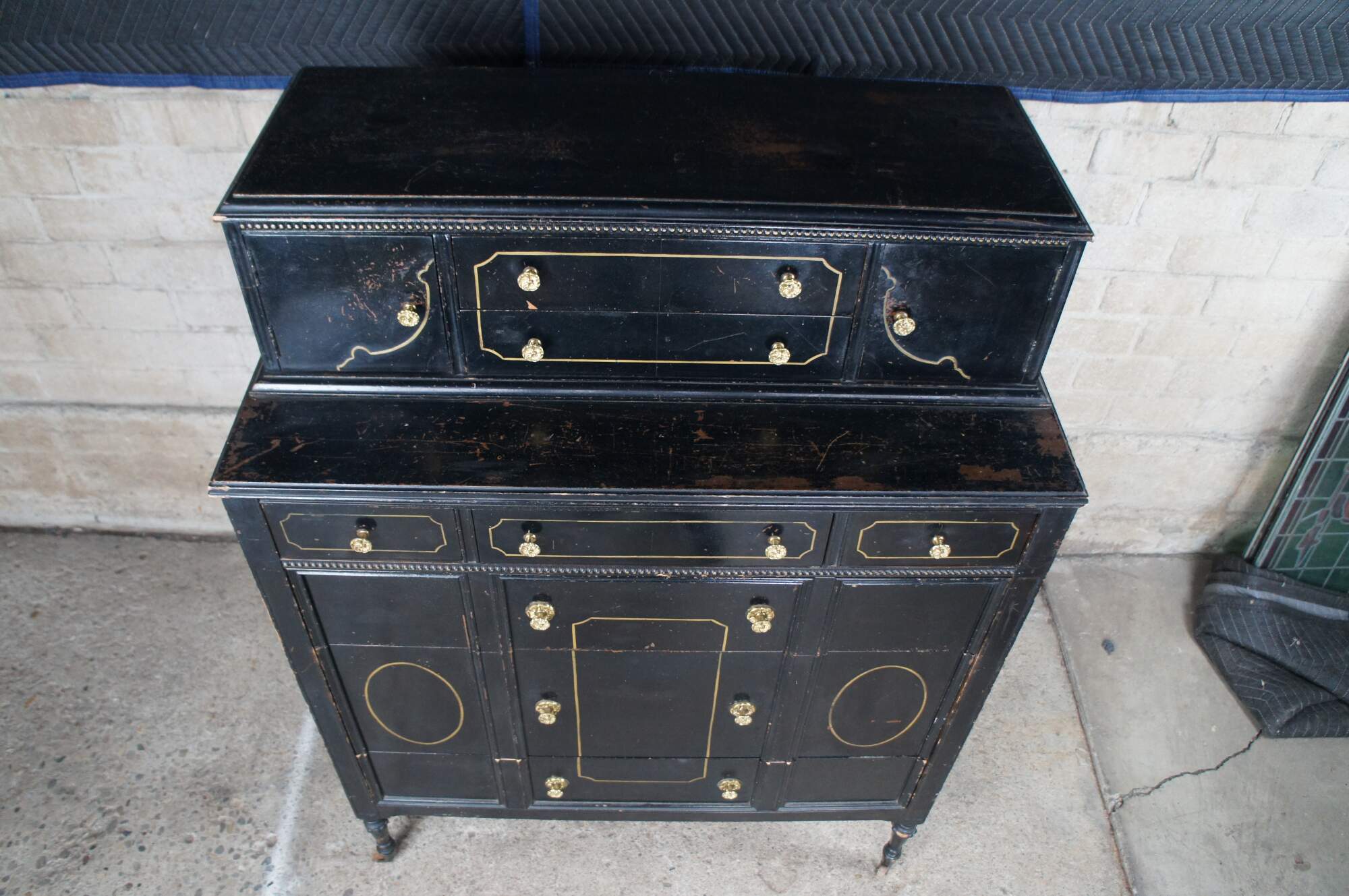 Late Victorian style mahogany painted tall boy chest. Finished in black with gold painted accents. Features four dovetailed drawers and a stepback top with two smaller central drawers flanked by outer cabinets. The drawers / cabinets have gold finished metal pulls. The cabinet is supported by turned beaded legs with castors.