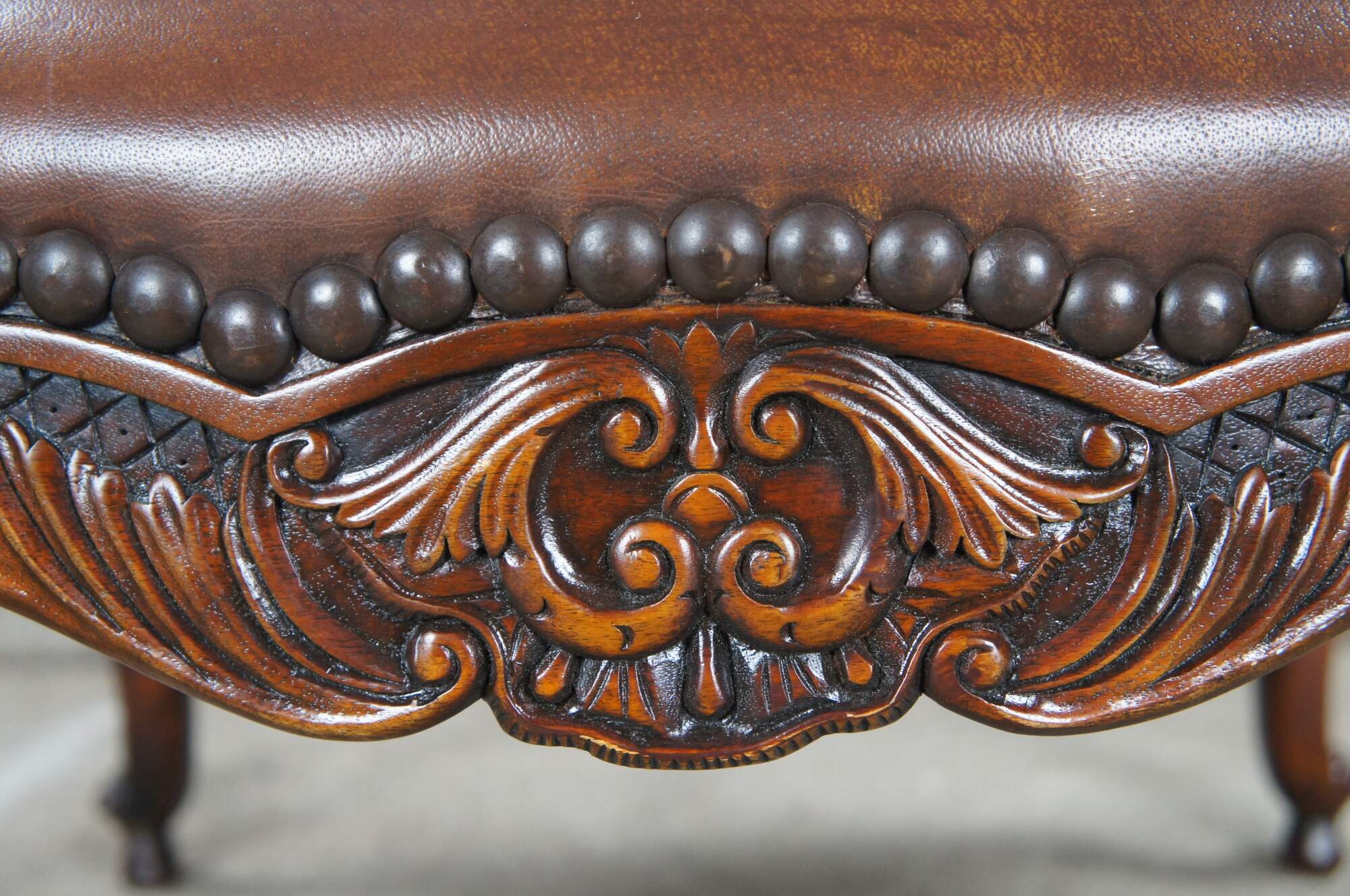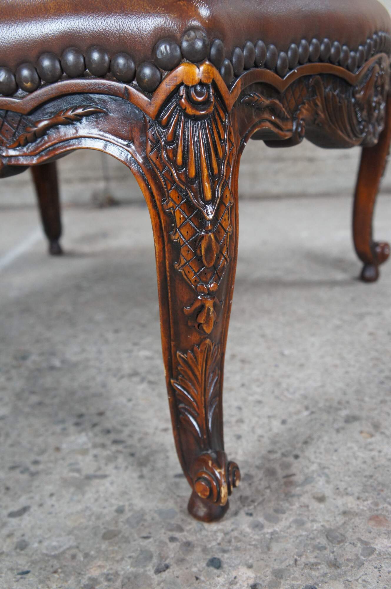 Pair of Late 20th century Ottomans / Foot stools by Theodore Alexander. French Country / Baroque inspiration with carved mahogany frames. Upholstered in brown tooled leather with nailhead trim. Includes serpentine aprons with carved lattice and foliate. Legs are downswept cabriole with scalloped knees, scrolled and footed.