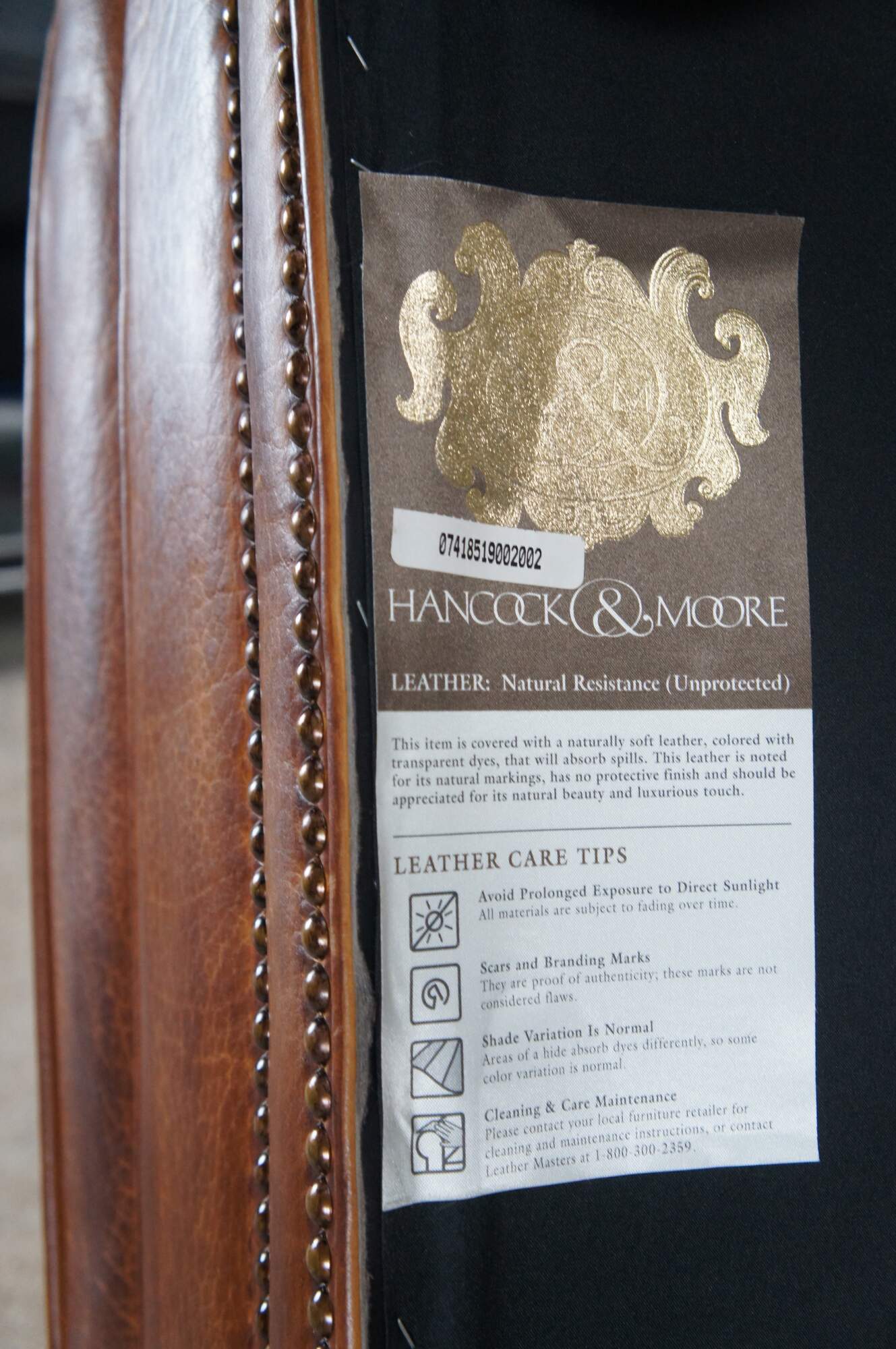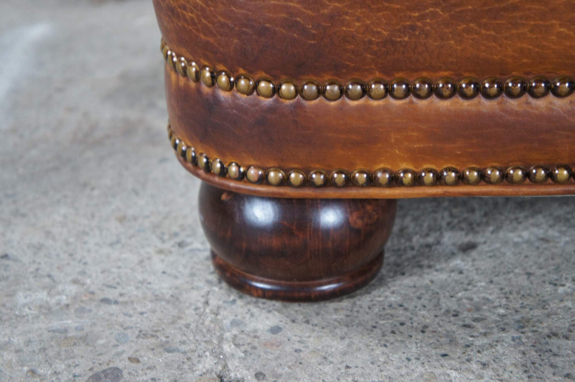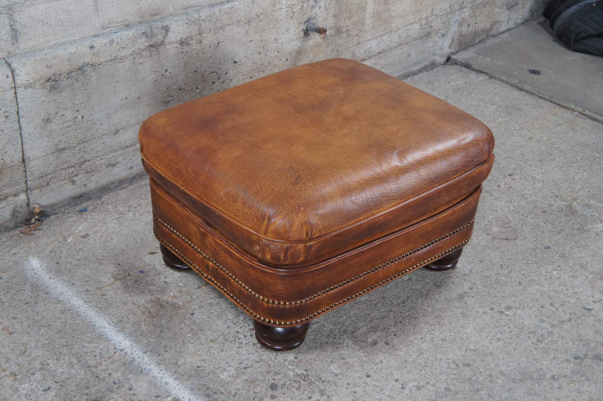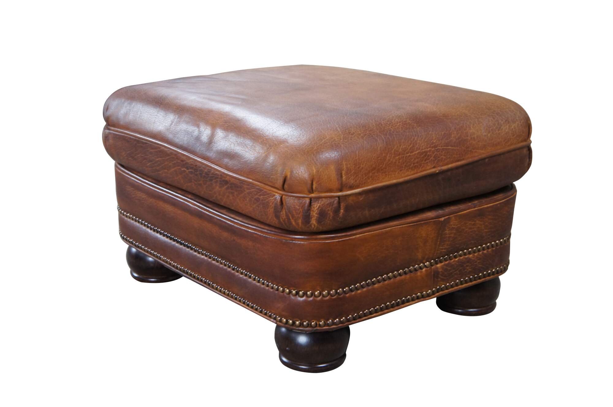 Beautiful pair of Hancock & Moore Austin Traditional Ottomans. Upholstered a rich top grain brown leather with brass nailhead trim. The rectangular form features a cushioned top and robust bun feet.