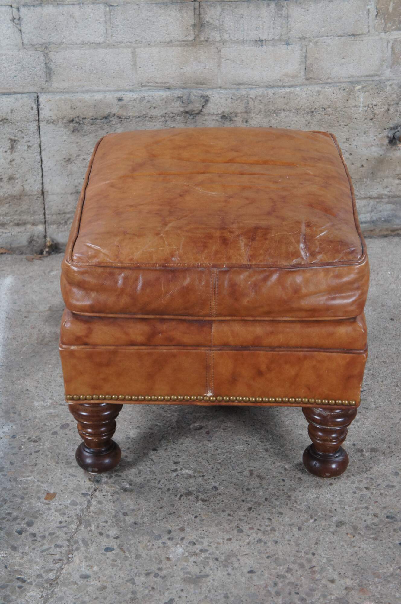 Late 20th Century leather upholstered ottoman or footstool by Wesley Hall. Features a rectangular frame with burnt orange leather, brass nailhead trim and turned mahogany feet.