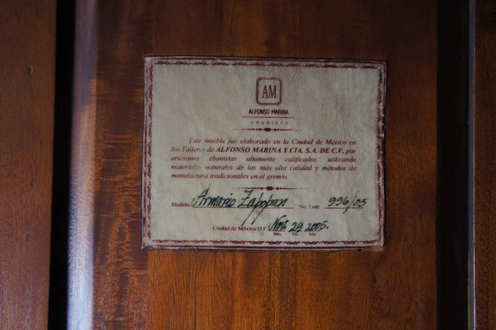 A breathtaking wardrobe by Alfonso Marina. Drawing inspiration from 18th Century designs with French Louis XIII and Spanish Colonial styling. The armoire is constructed from rosewood and mahogany with fruitwood marquetry and herringbone inlay. Features beautiful raised and molded quatrefoil panels. Double doors open to a central shelf with two dovetailed drawers and two adjustable shelves. The cabinet is supported by carved claw feet. Model Armario Zapopan, 996/05. MSRP $21,825
