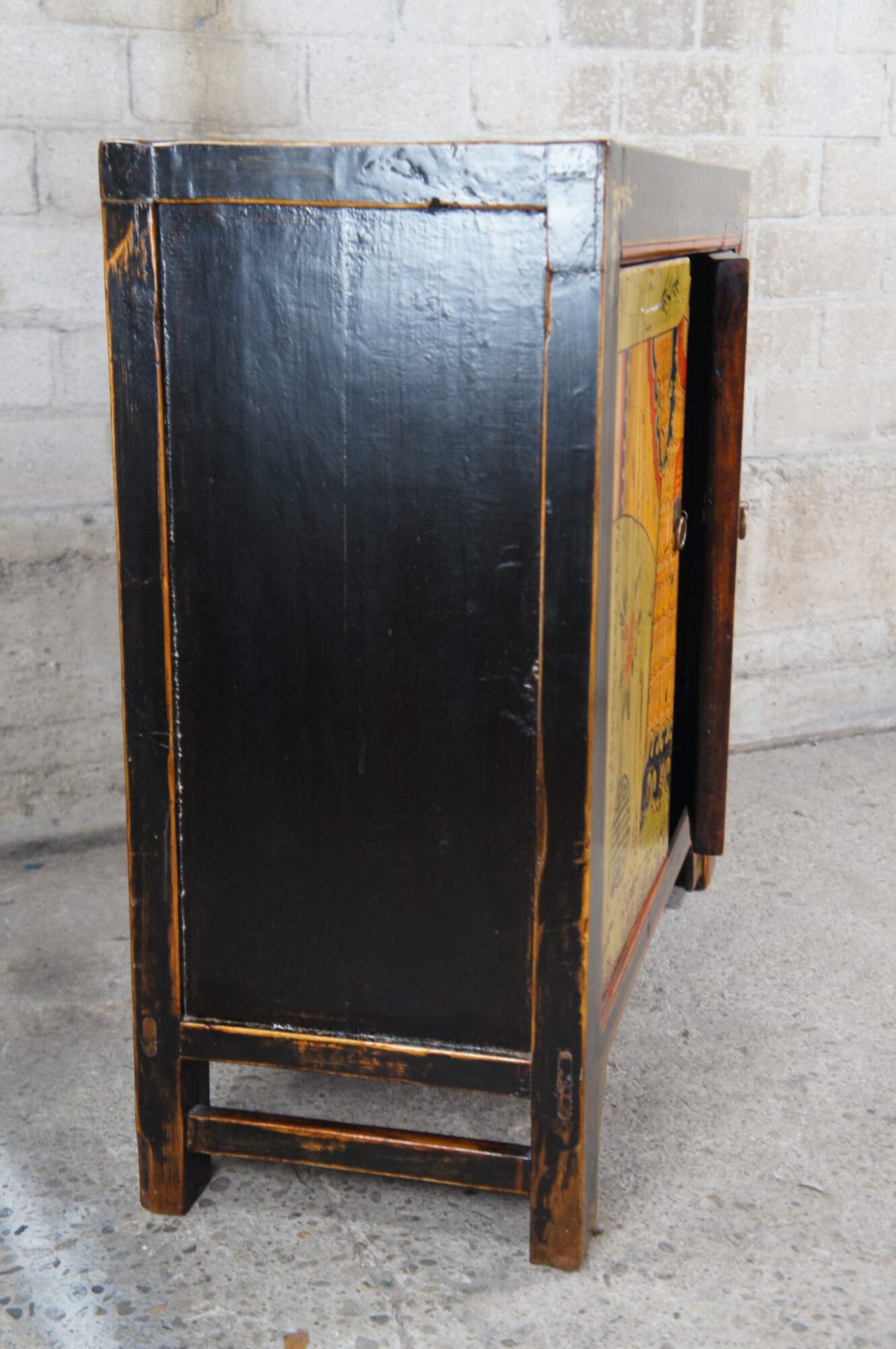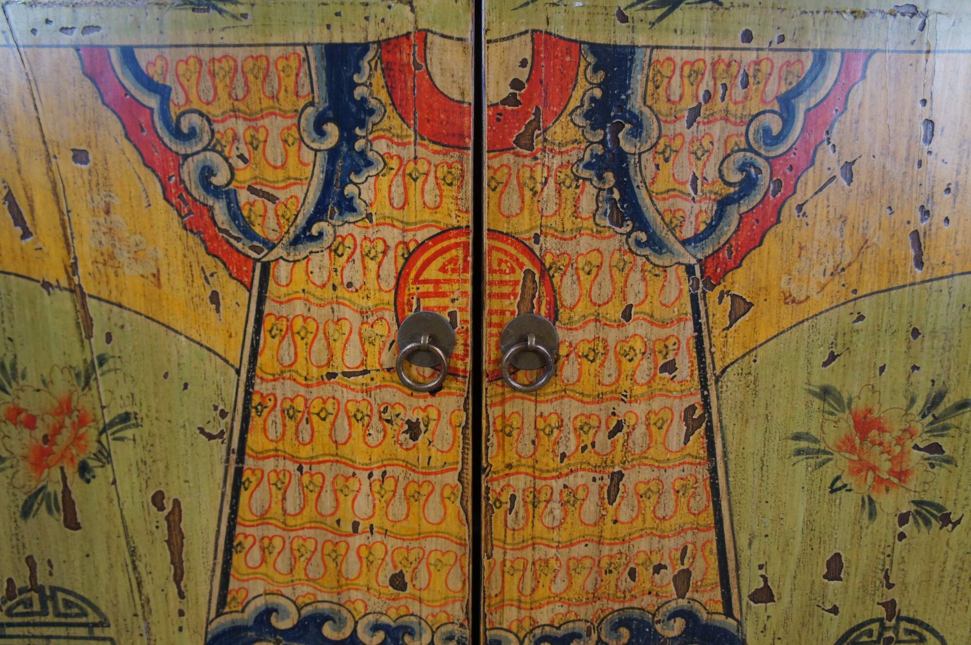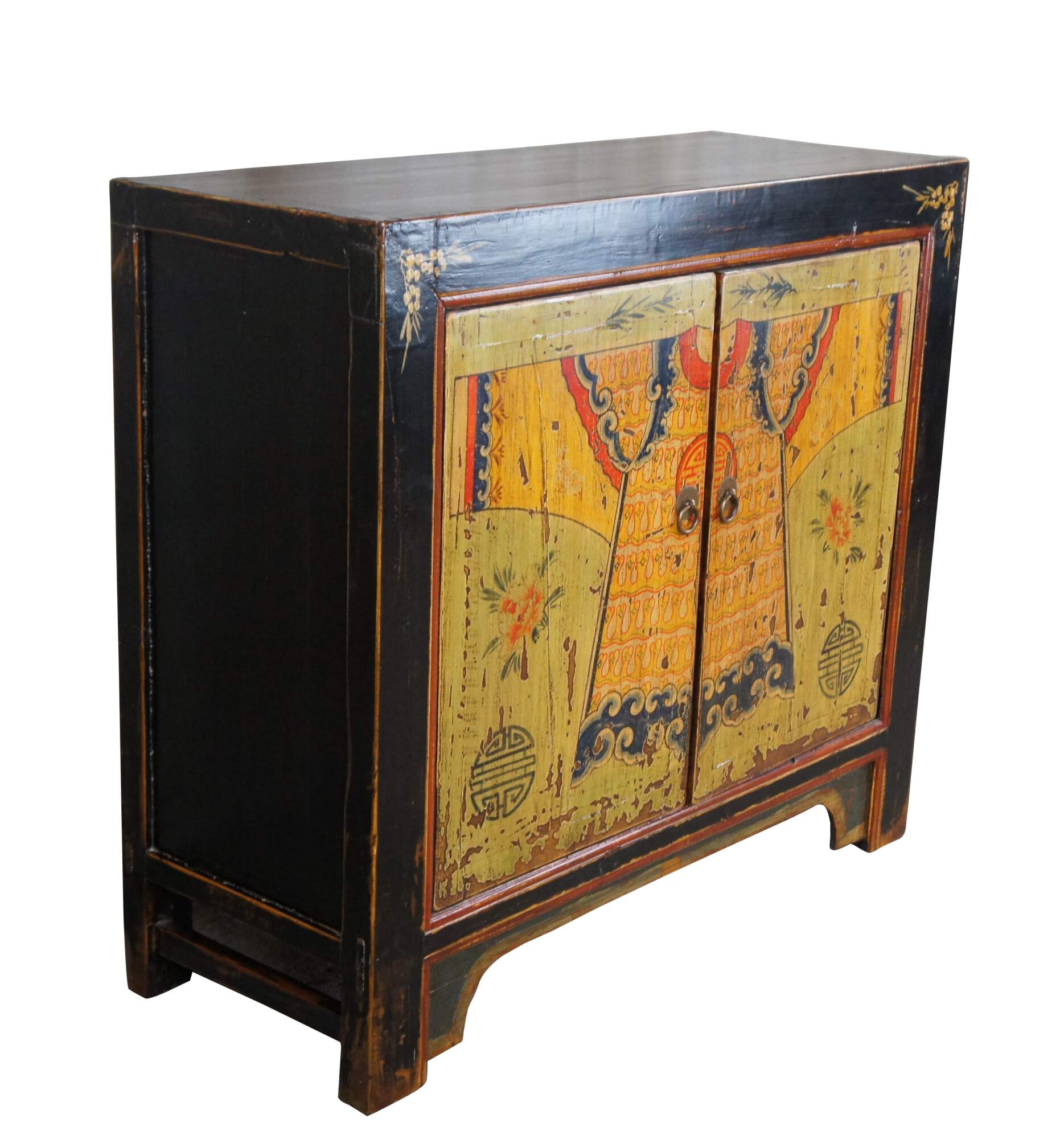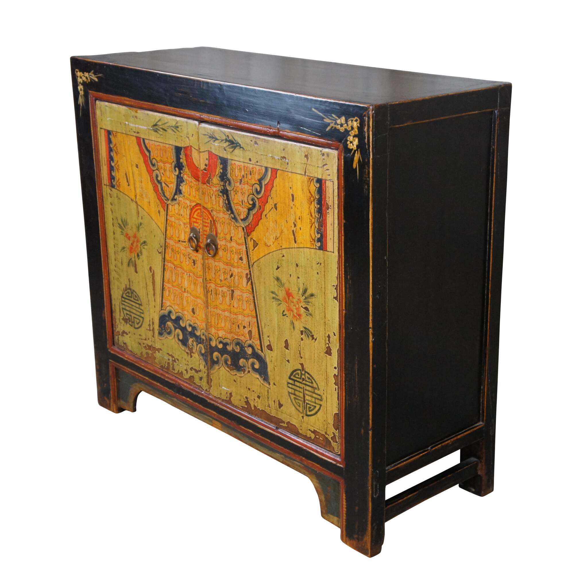 Chinese lacquered and painted two door chest. Features a rectangular frame made from Elm in Beijing. Constructed via centuries old mortise and ten design. The front of the chest showcases a painted motif with a traditional Changshan robe. Changshan is a type of Chinese robe, also known as changpao or dagua, that comes from the Qing dynasty qizhuang, the traditional dress of the Manchu people. The chest is marked along the back with the original wax import stamp. Great for use as a low console or tv / media cabinet.