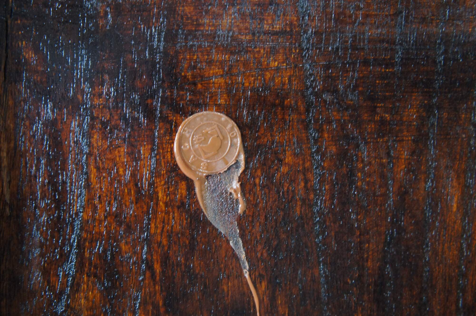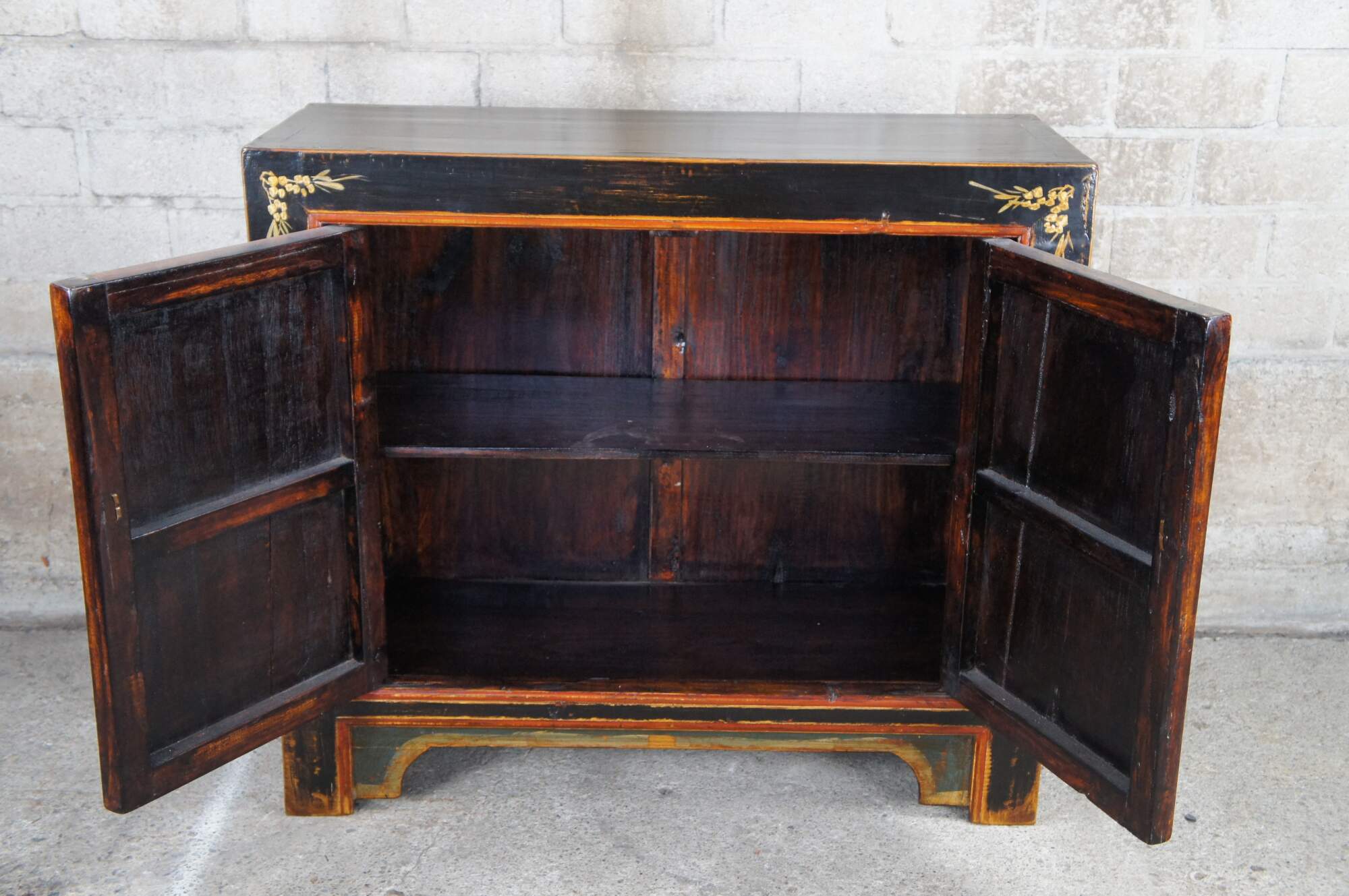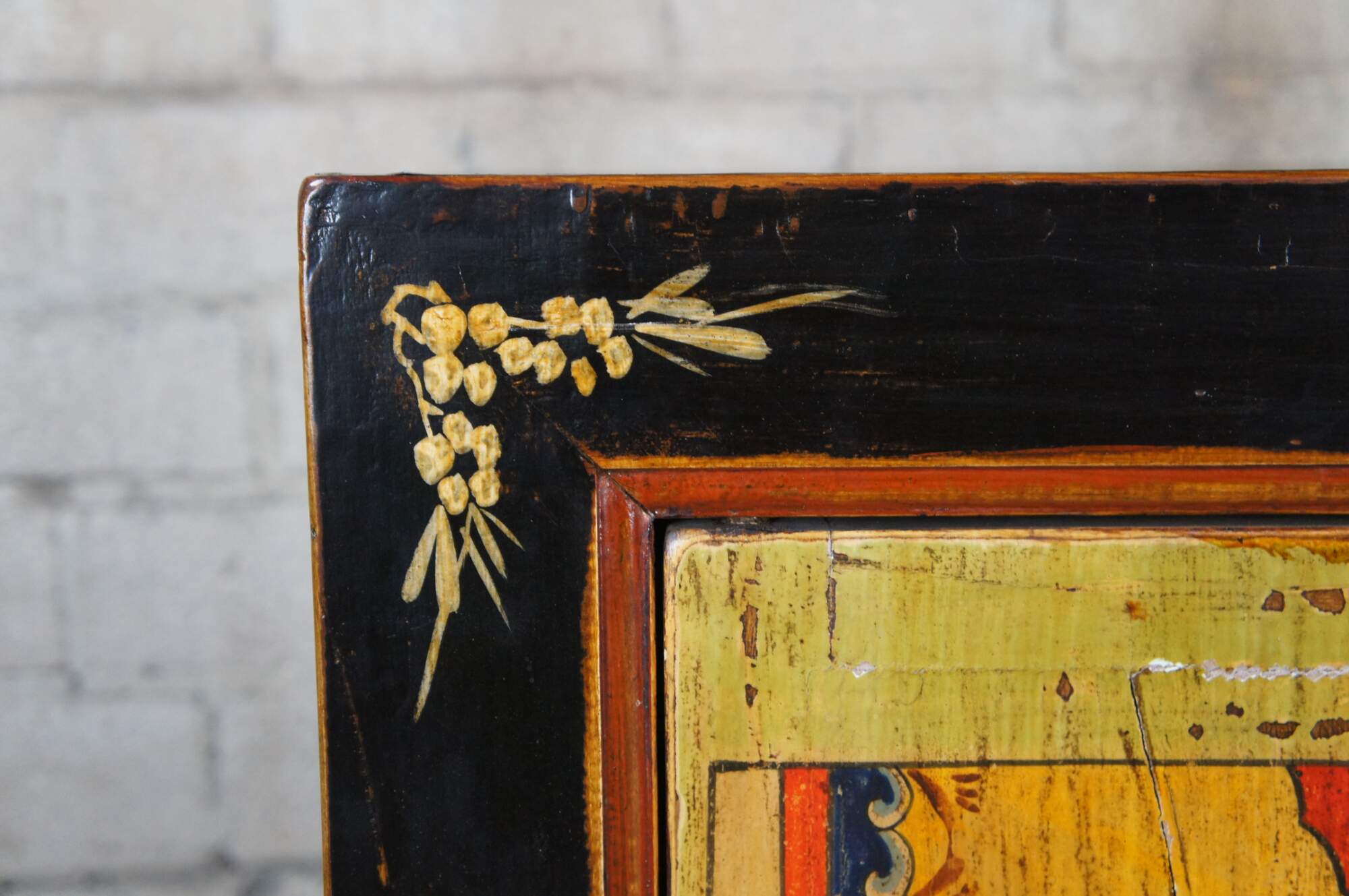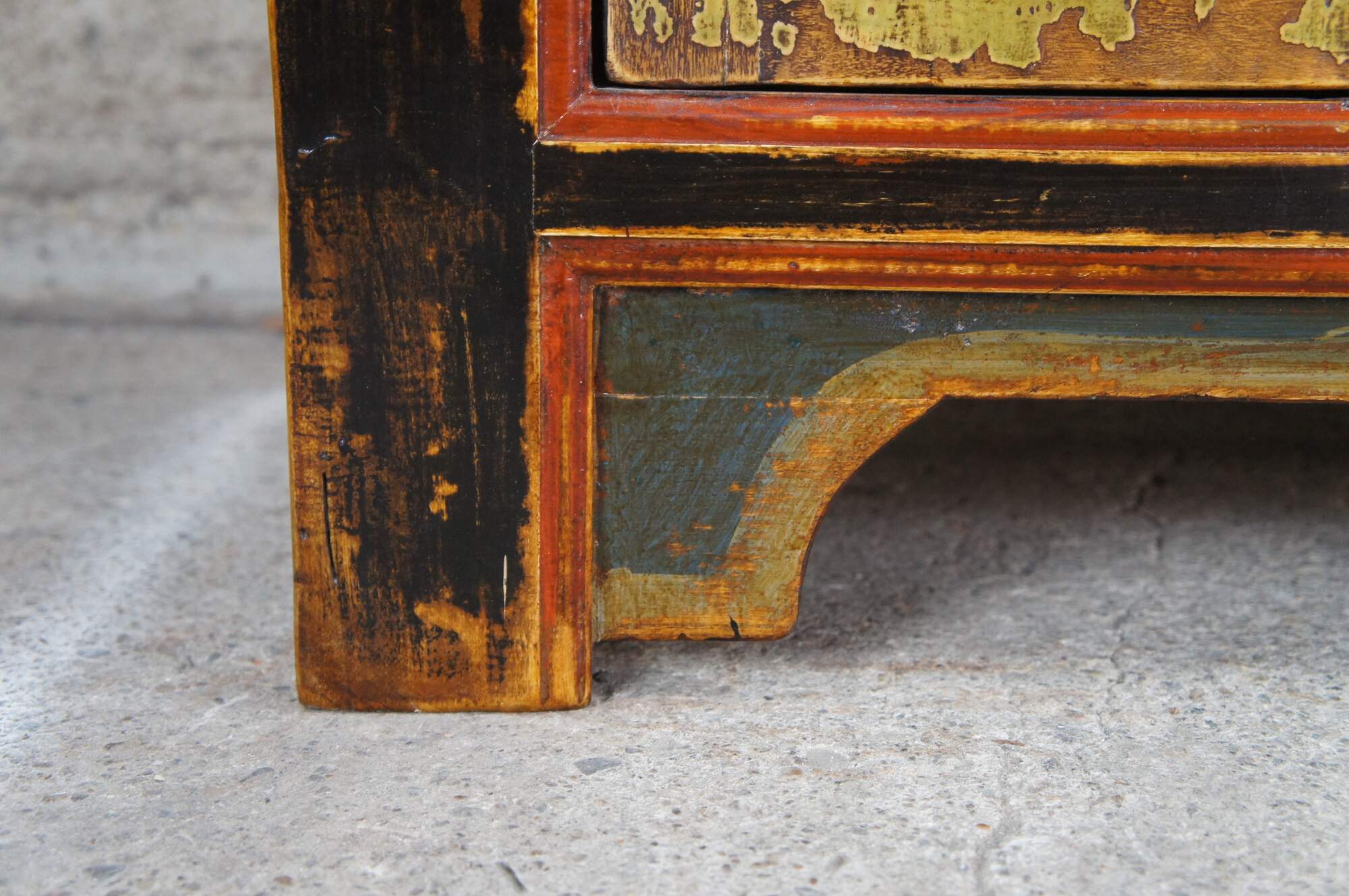 Chinese lacquered and painted two door chest. Features a rectangular frame made from Elm in Beijing. Constructed via centuries old mortise and ten design. The front of the chest showcases a painted motif with a traditional Changshan robe. Changshan is a type of Chinese robe, also known as changpao or dagua, that comes from the Qing dynasty qizhuang, the traditional dress of the Manchu people. The chest is marked along the back with the original wax import stamp. Great for use as a low console or tv / media cabinet.
