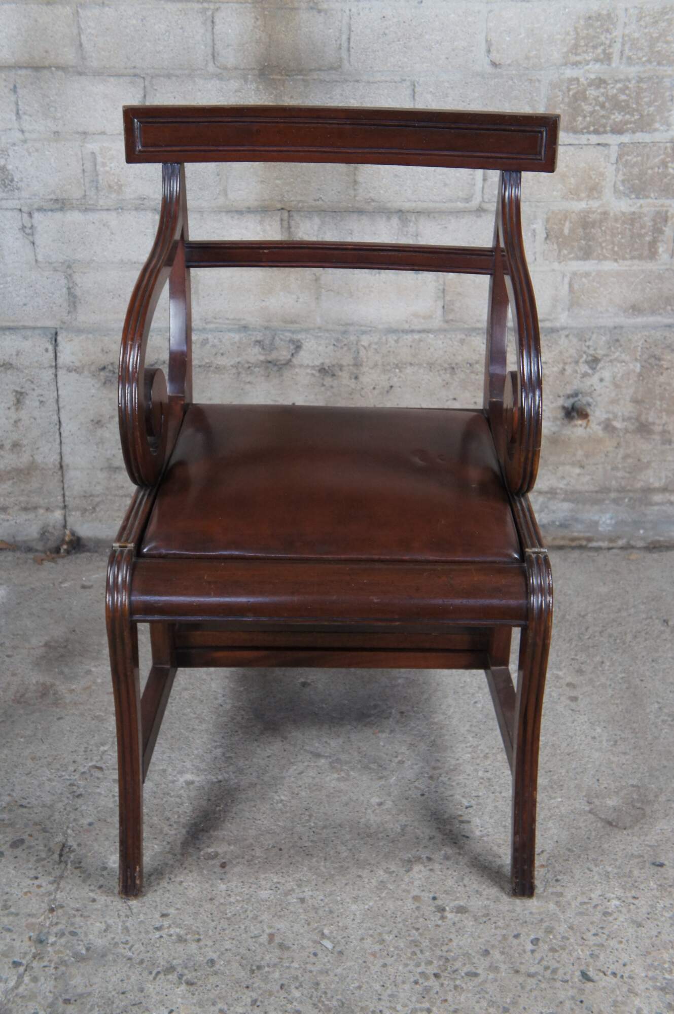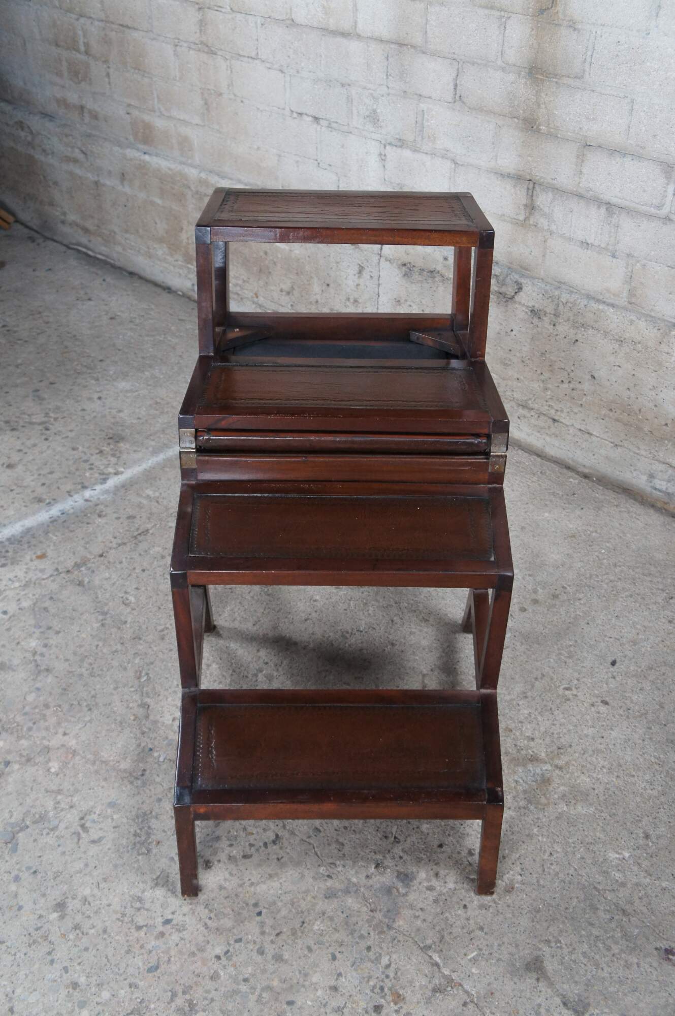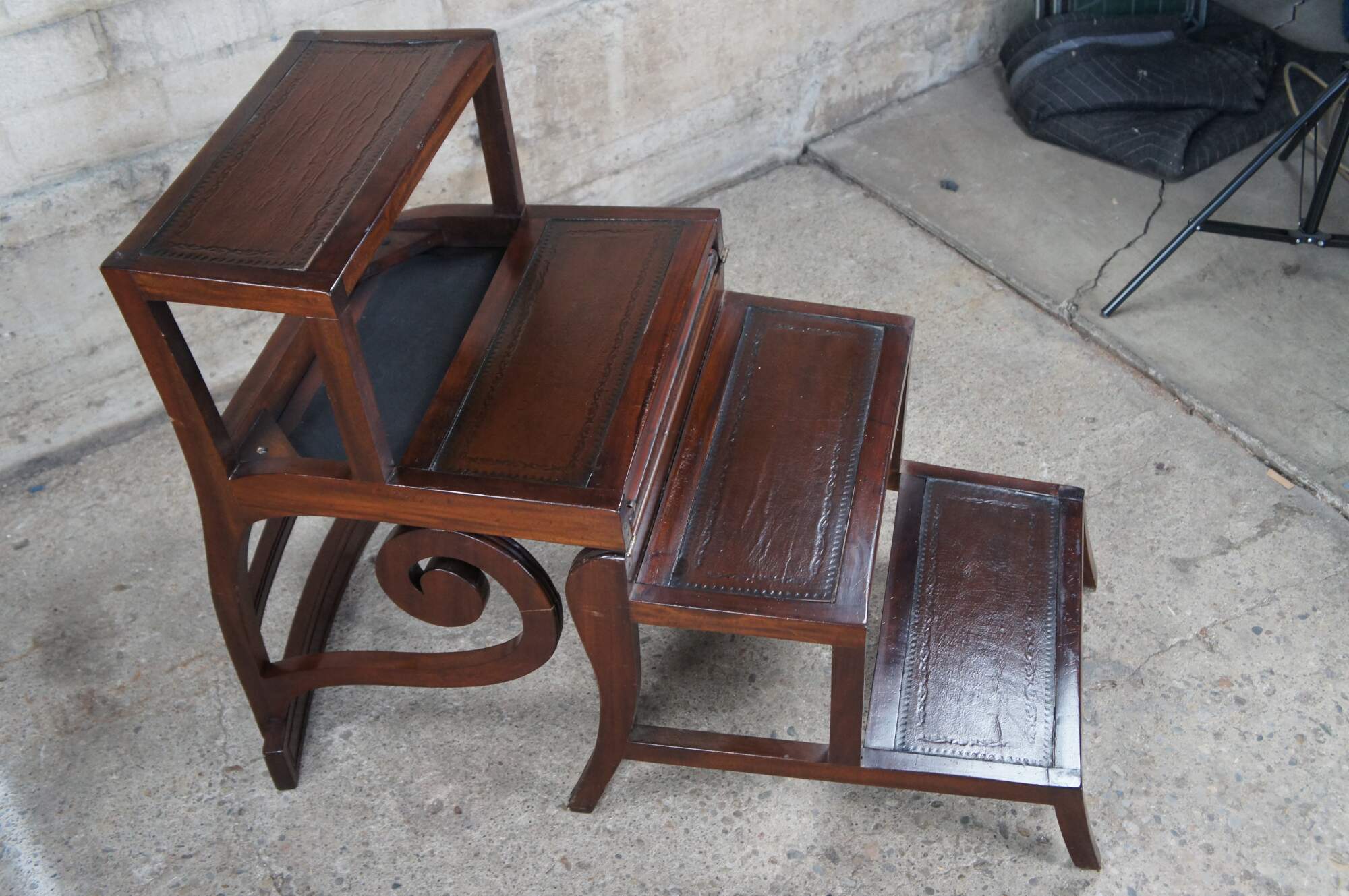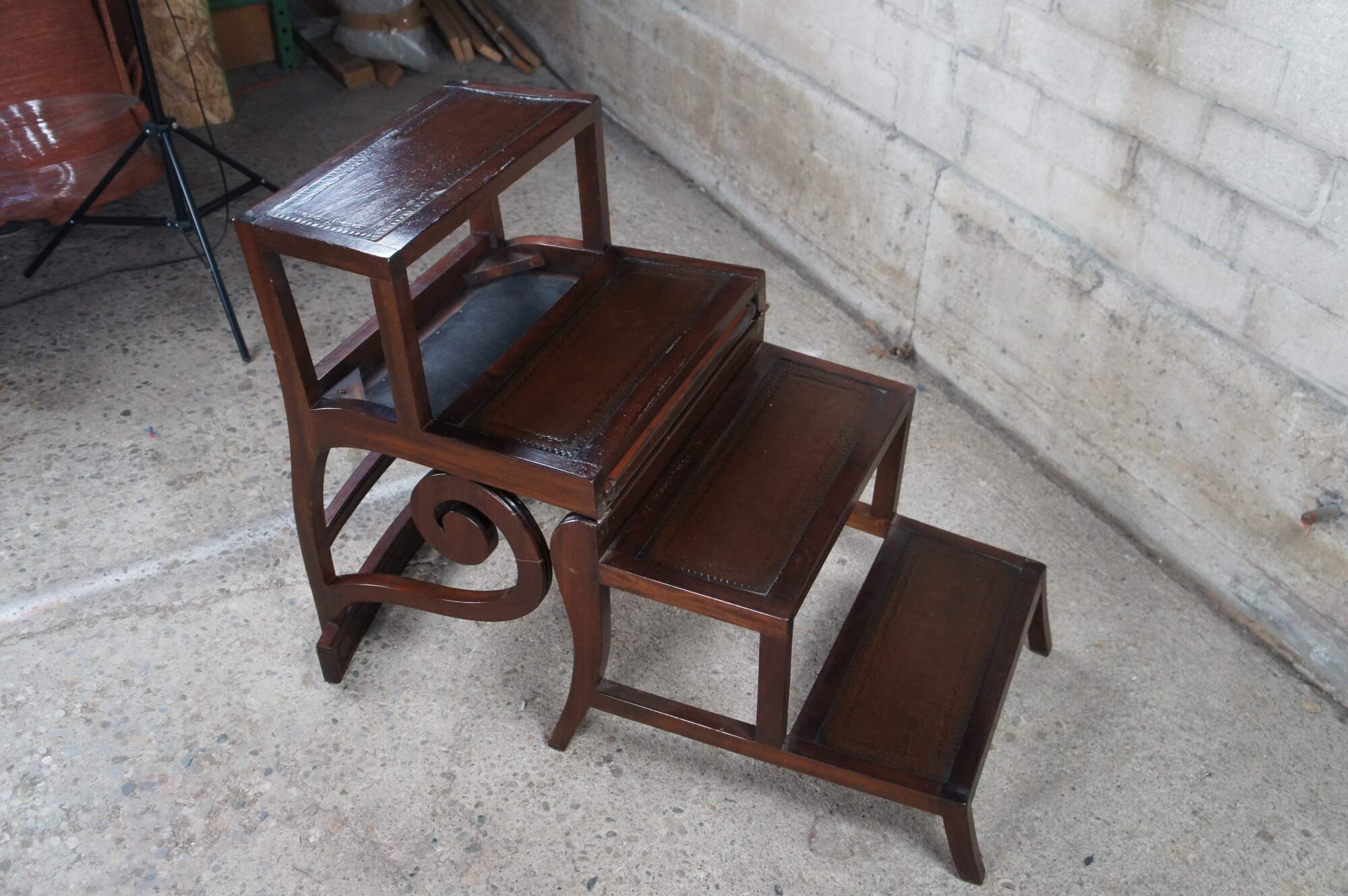 An exceptional English Regency inspired metamorphic library step ladder by Theodore Alexander. Features a mahogany frame with a contoured back over scrolled arms and a leather seat. To use as a step ladder the chair back hinges forward revealing four steps with tooled leather inset surfaces. An iconic design that will offers dual function making it perfect for the library, office or kitchen.