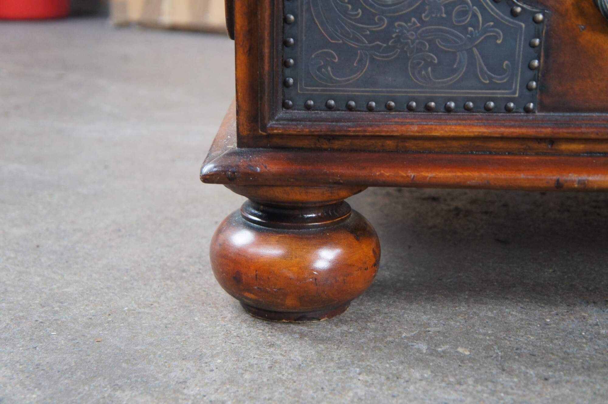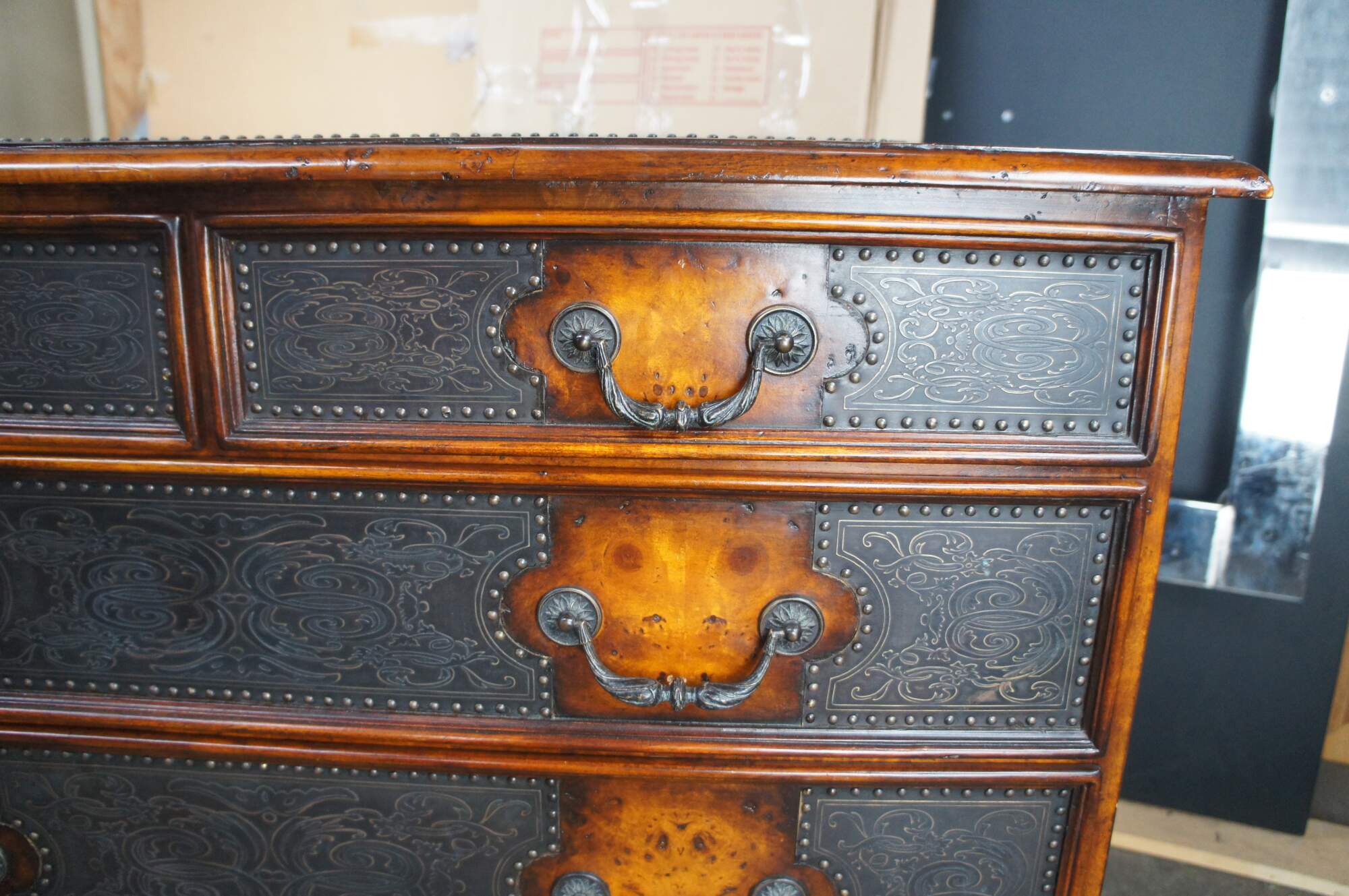 Theodore Alexander Armoury Collection Chest of Drawers. A modern take on 18th Century William and Mary styling. Made from Burr Walnut with etched brass panels and nailhead trim. Features 2 over 3 dovetailed drawer format and robust bun feet. A stately addition to any space.