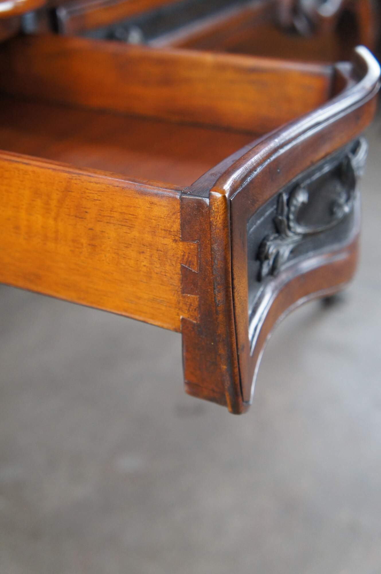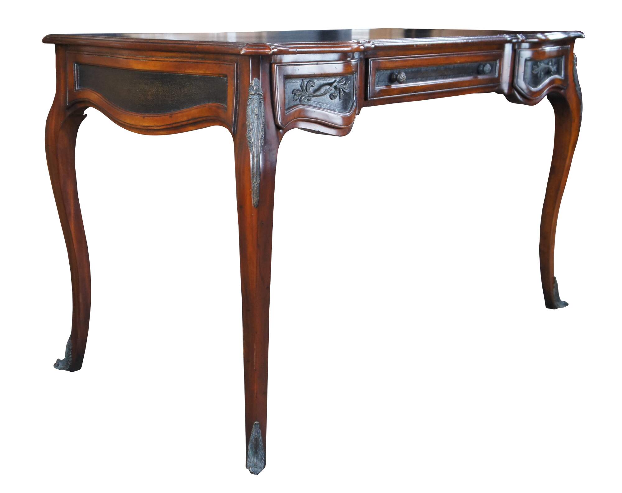 Theodore Alexander "Chateau du Vallois" French Provincial Writing Desk. Features a serpentine form made from mahogany with tooled leather surfaces. Includes three dovetailed drawers and shapely carbriole legs with bronze mounts.