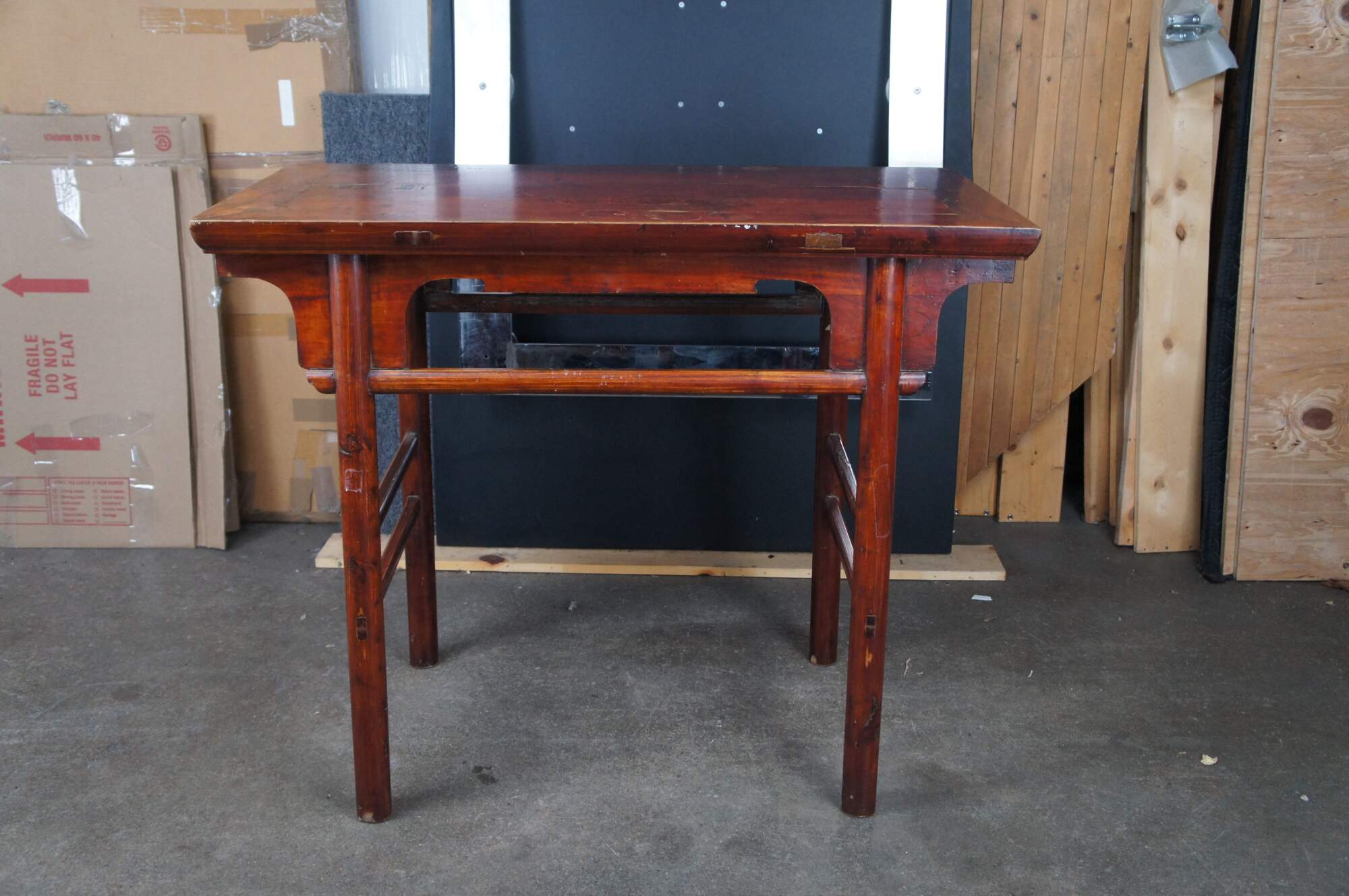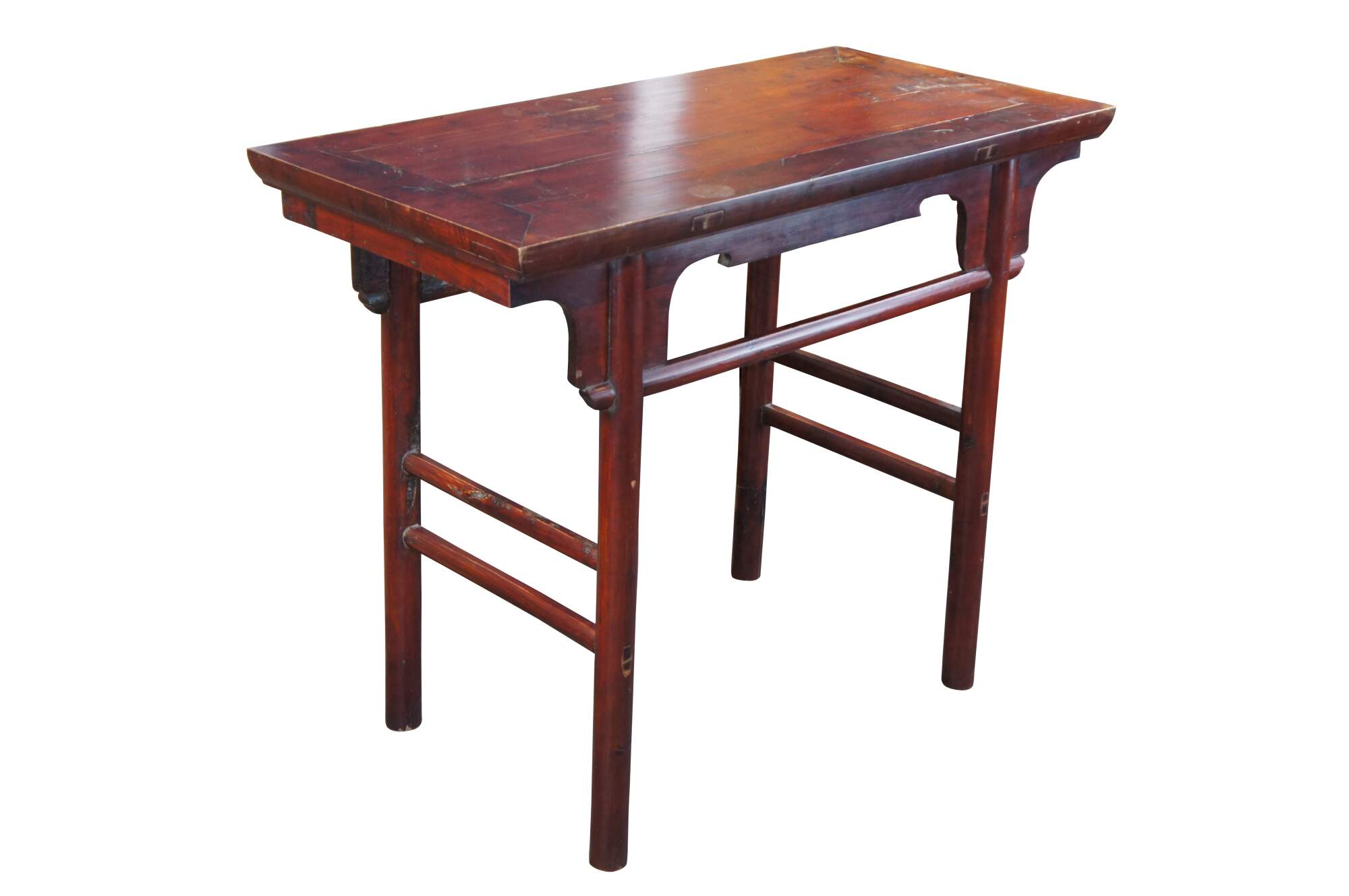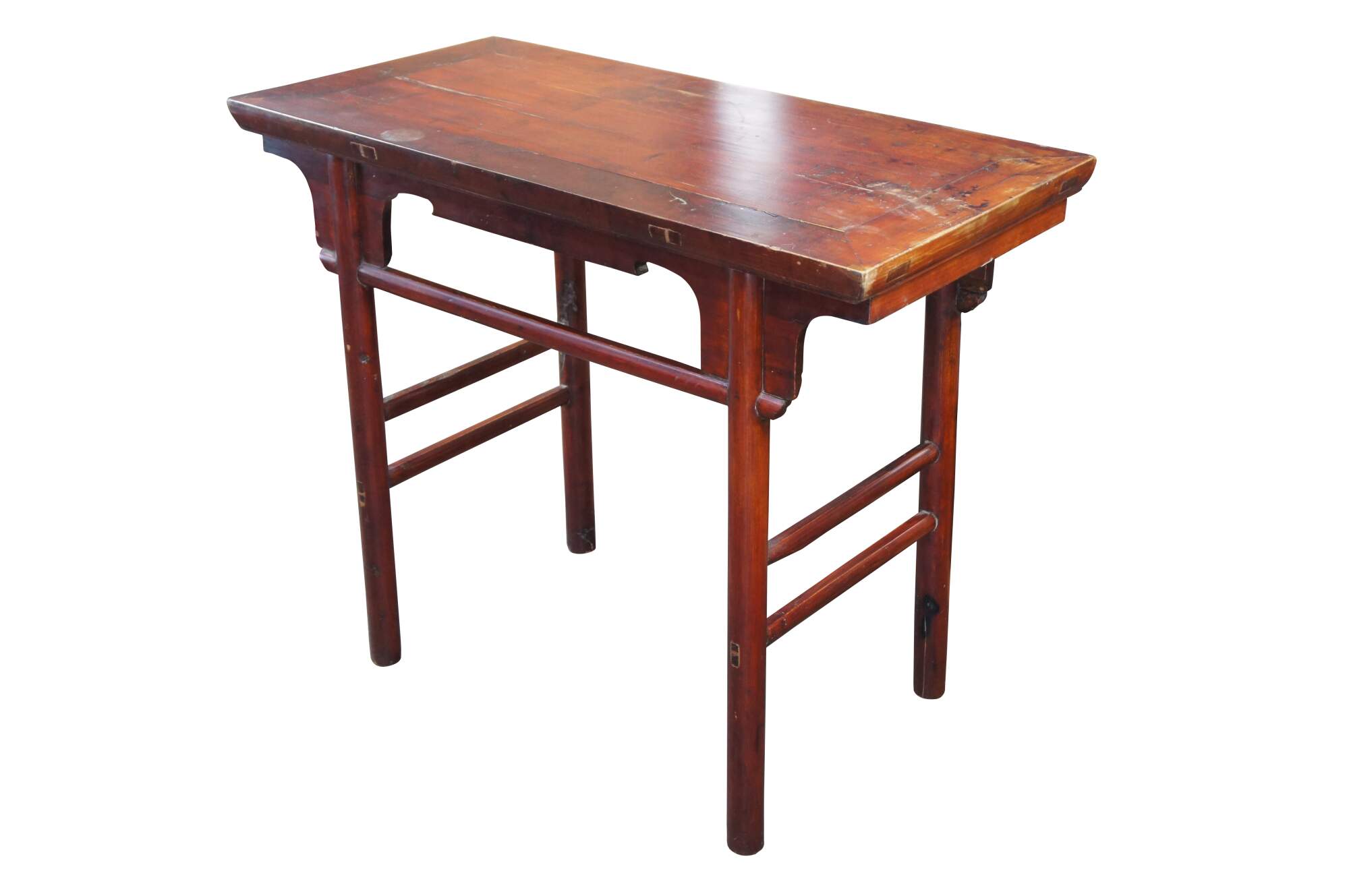 An antique 19th Century Chinese Qing Dynasty (Ming Style) Altar Table. Made from elm with traditional mortise and tenon construction. Features a shapely apron and contoured spandrels over long legs connected by stretchers from front to back. Finish has a reddish tone. A great entryway / hallway console table. Perfect for display of sculptures, candlesticks, a clock or your favorite coffee table book.