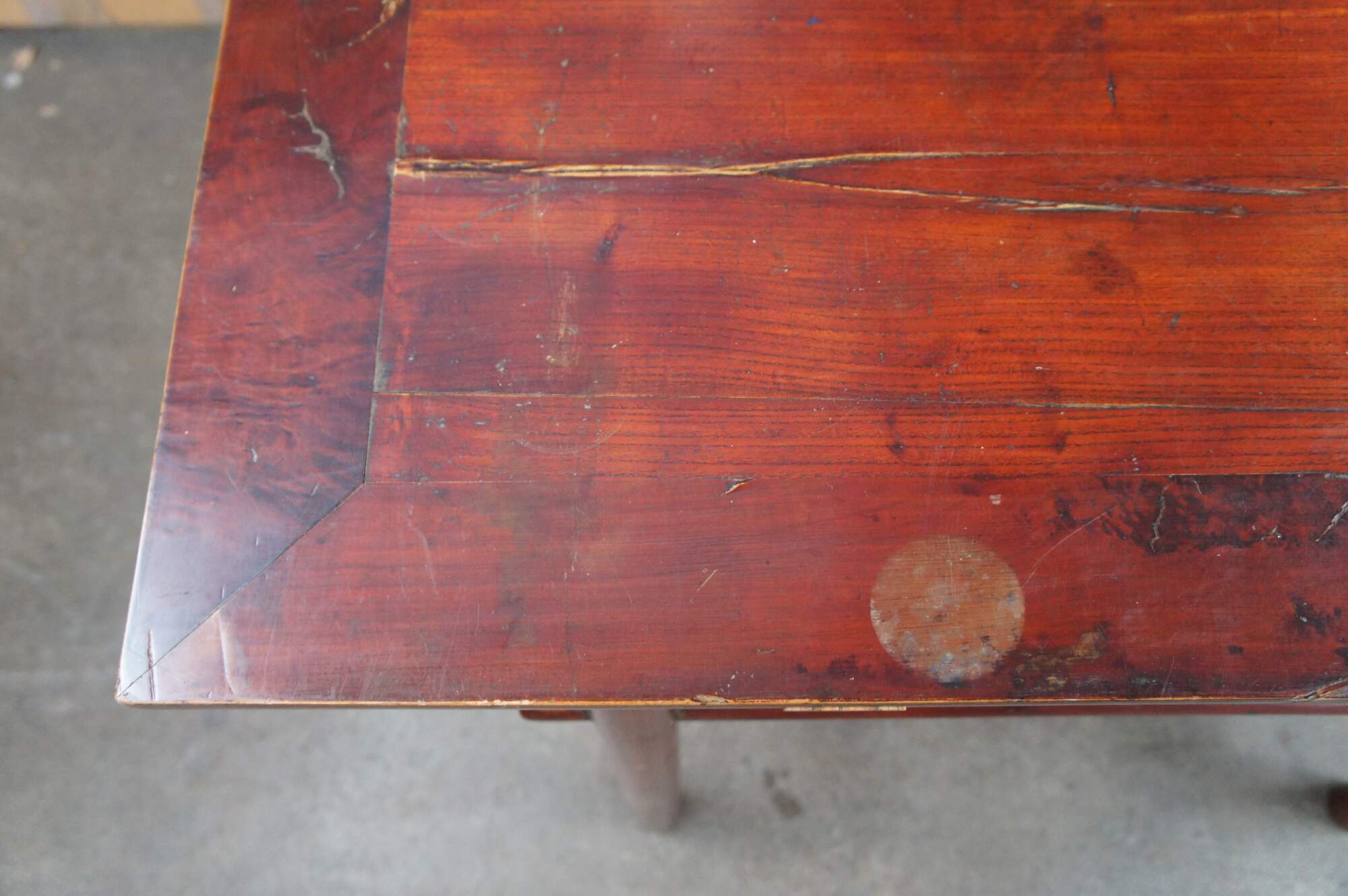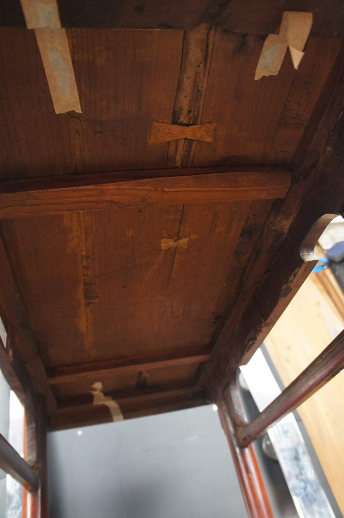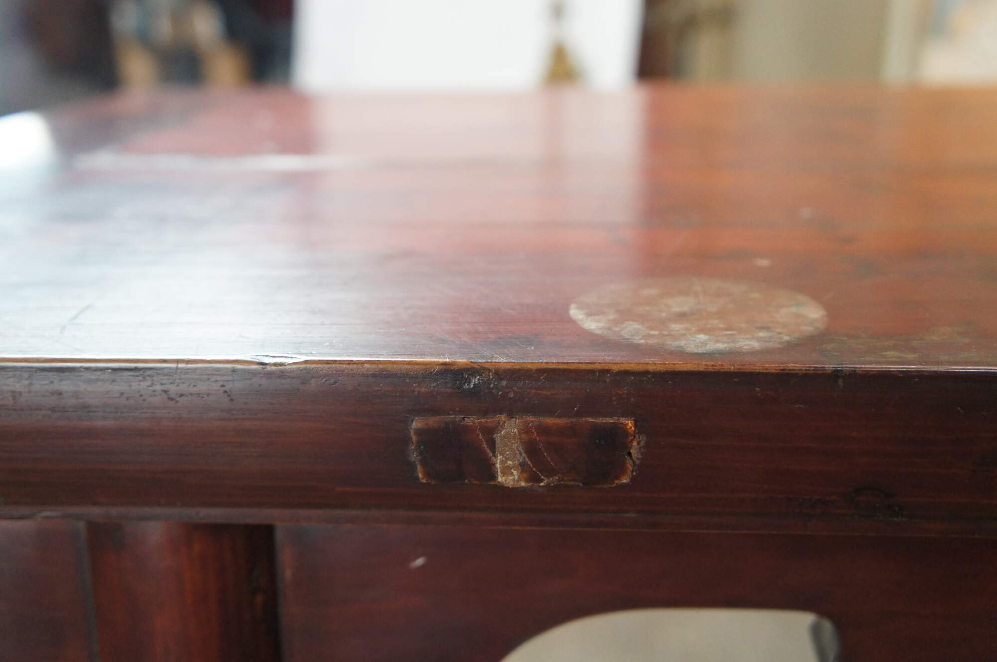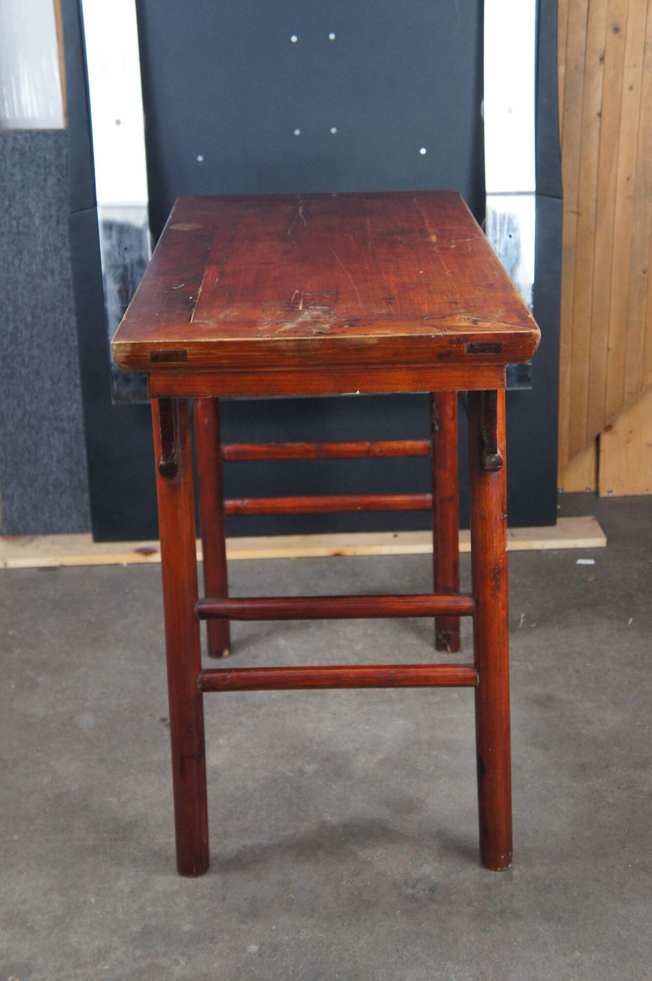 An antique 19th Century Chinese Qing Dynasty (Ming Style) Altar Table. Made from elm with traditional mortise and tenon construction. Features a shapely apron and contoured spandrels over long legs connected by stretchers from front to back. Finish has a reddish tone. A great entryway / hallway console table. Perfect for display of sculptures, candlesticks, a clock or your favorite coffee table book.