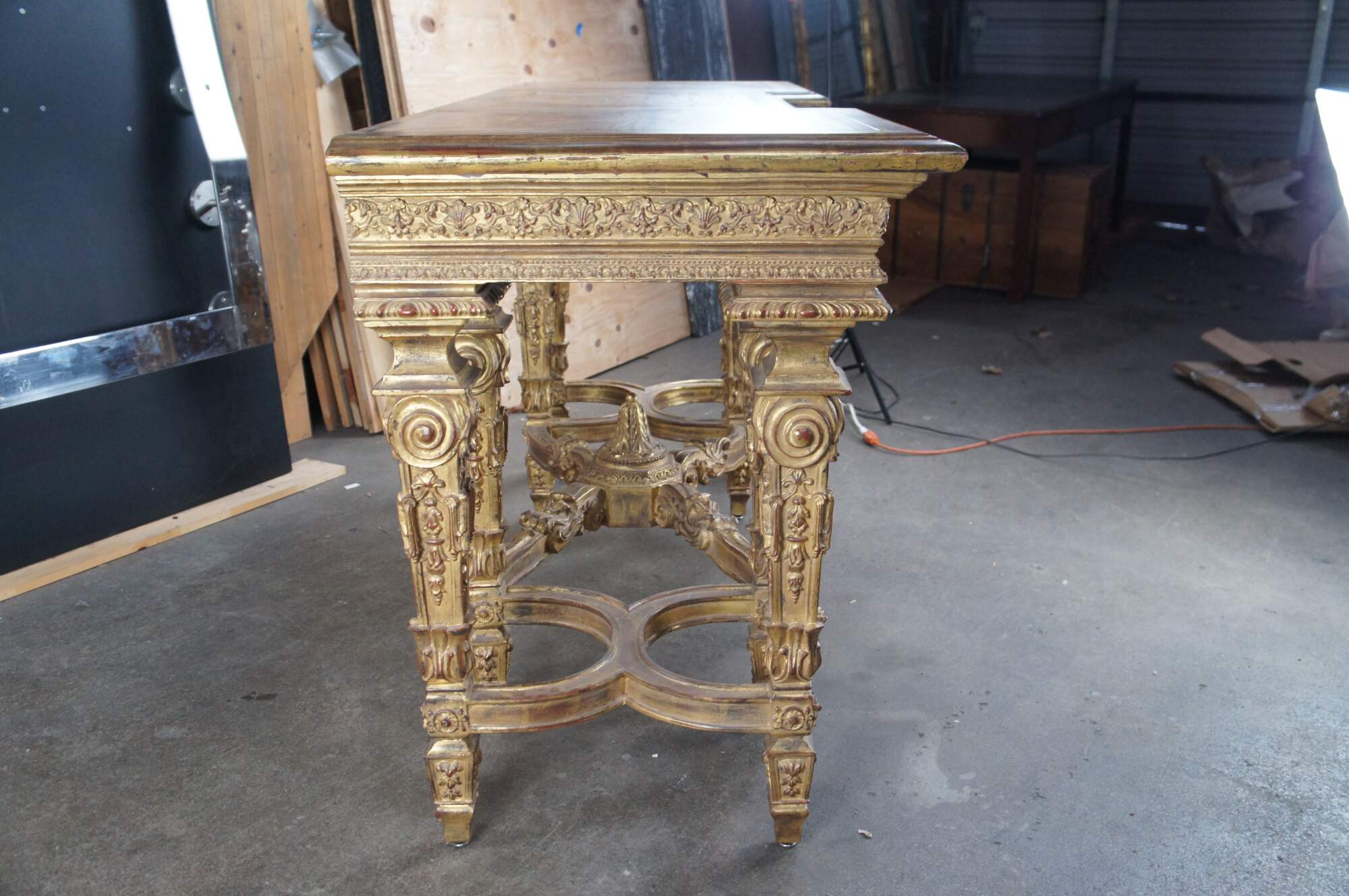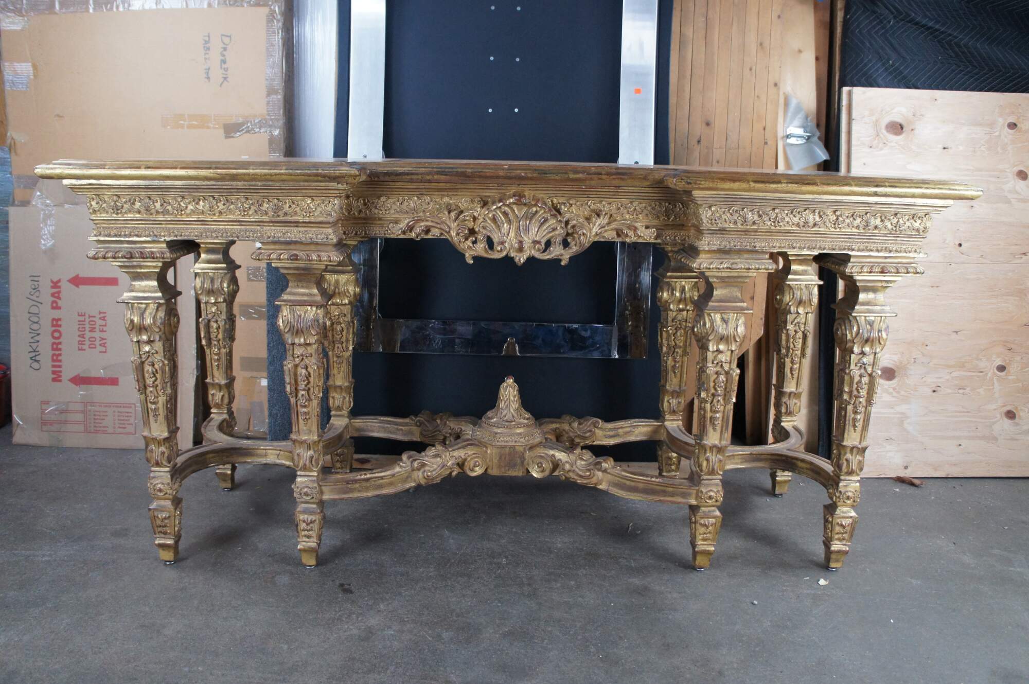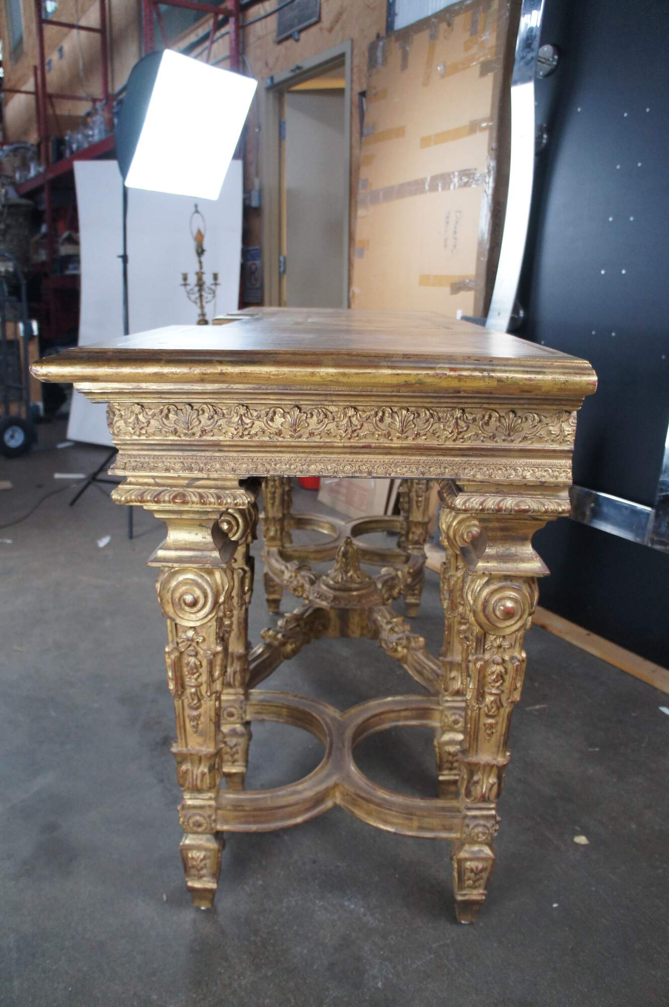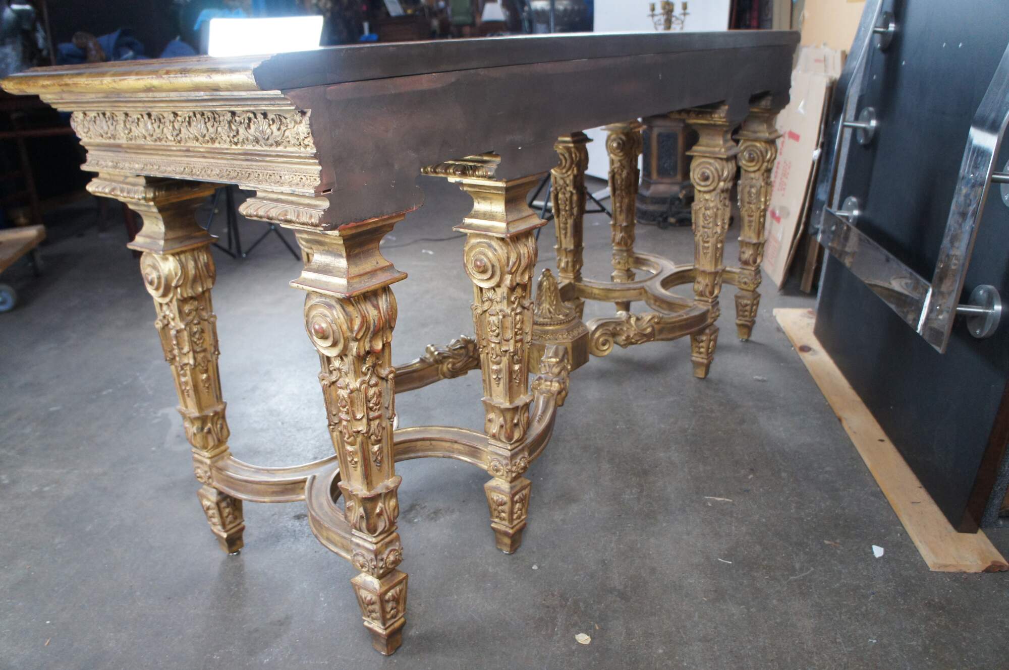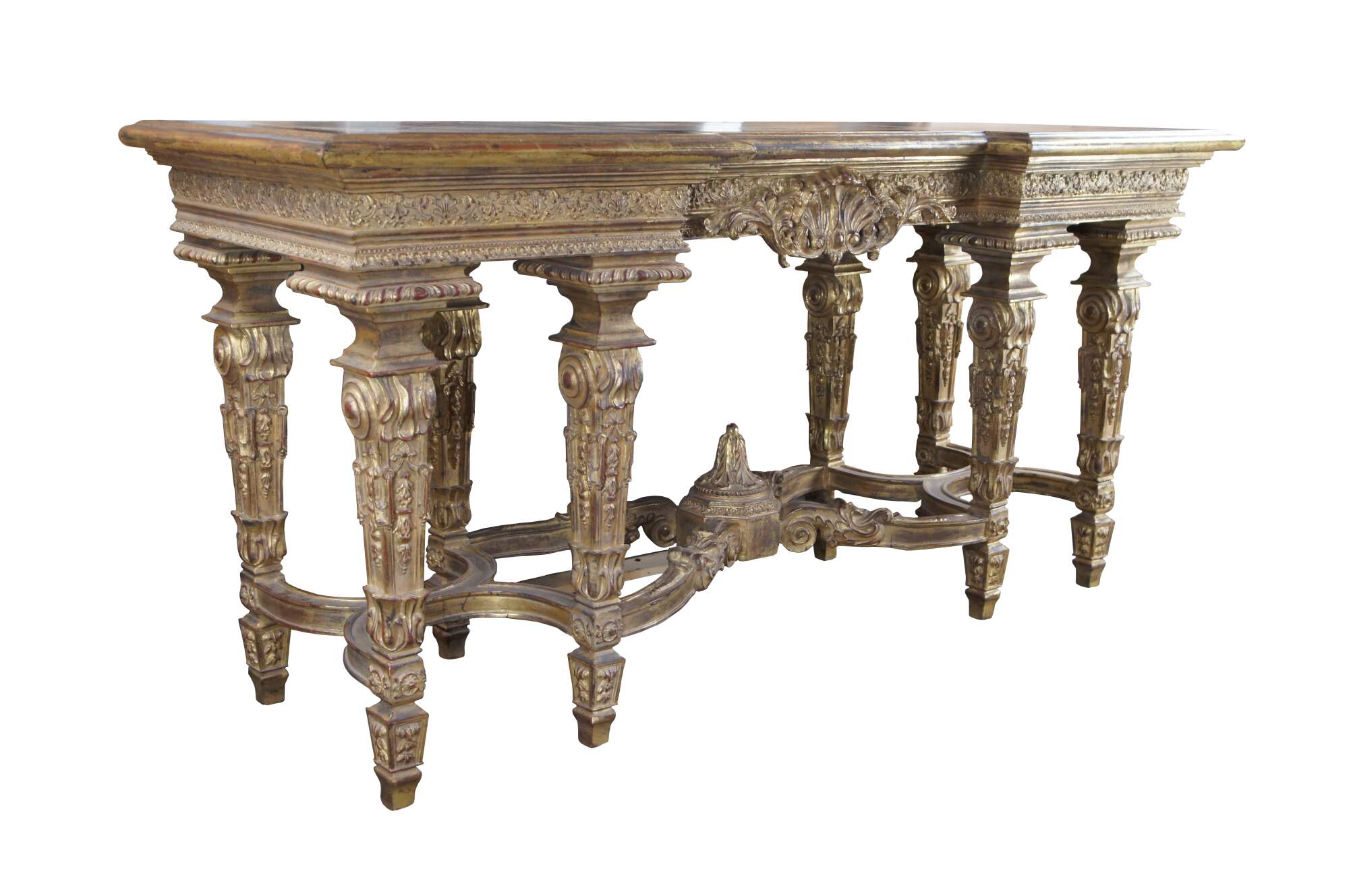 A monumental Italian Louis XIV style "Belle Epoque" giltwood console table. Belle Epoque (The Age of Excellence) takes inspiration from the very beginning of the French Golden Age of furniture in the 18th Century. The period itself began in France, mid-19th century, then spread to England, the continent and finally, to America. It ended in the early 1910s. This beautiful example features an ornate giltwood frame decorated with a scalloped center, intricate foliate motif, gadrooning and fanciful aprons. The top showcases a marbled painted geometric design. Long Legs are square tapered with scrolled design element over embellishments, acanthus flare, foliate and medallions. The four legs are connected on each side from front to back with an x-form stretcher, and joined at the center by an ornately scrolled stretcher leading to central acanthus finial. A true work of art.