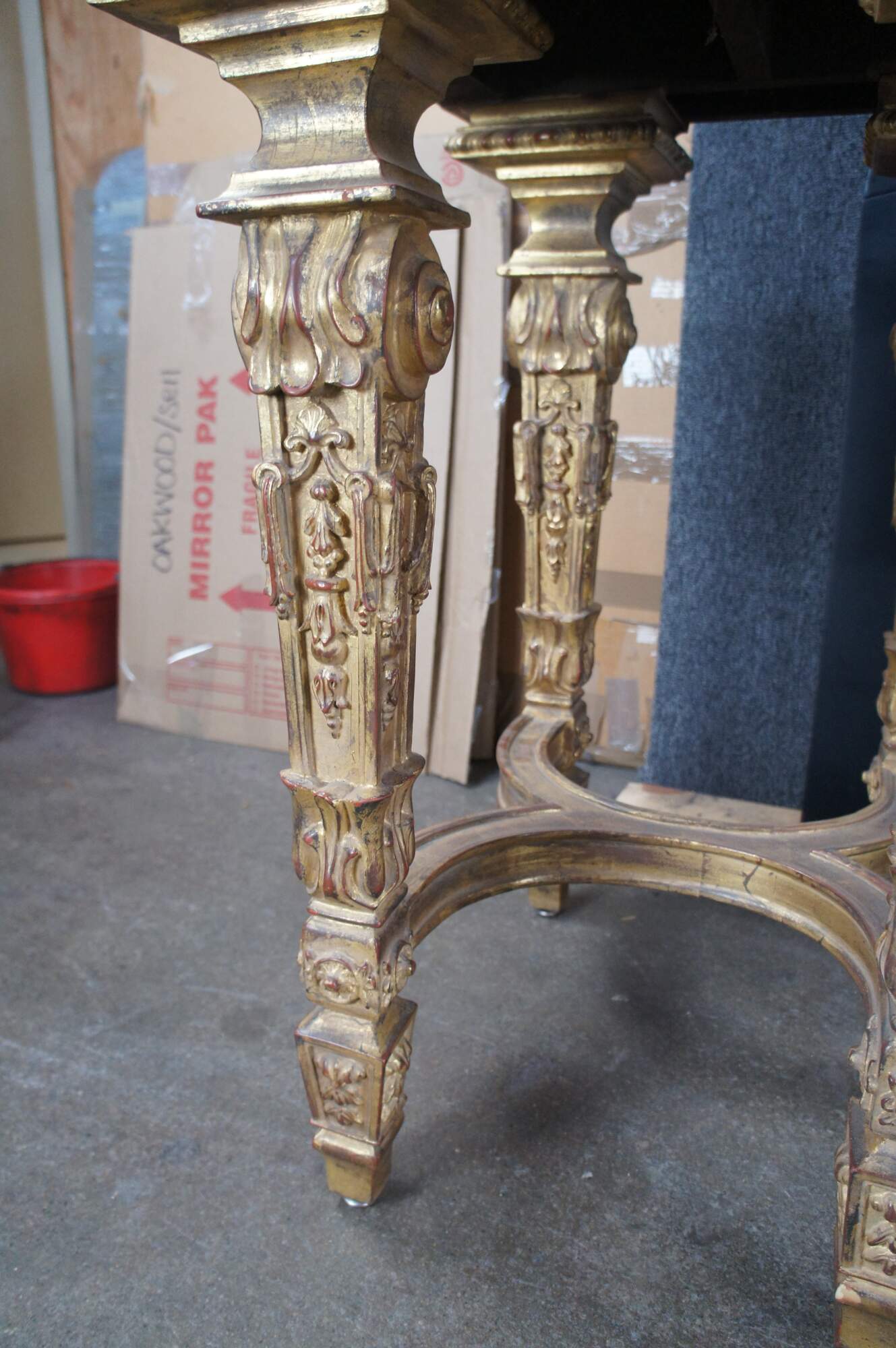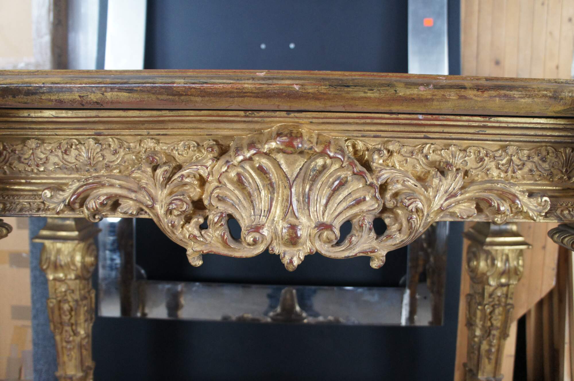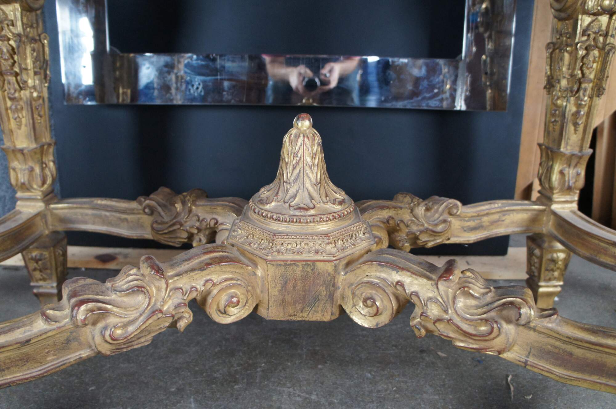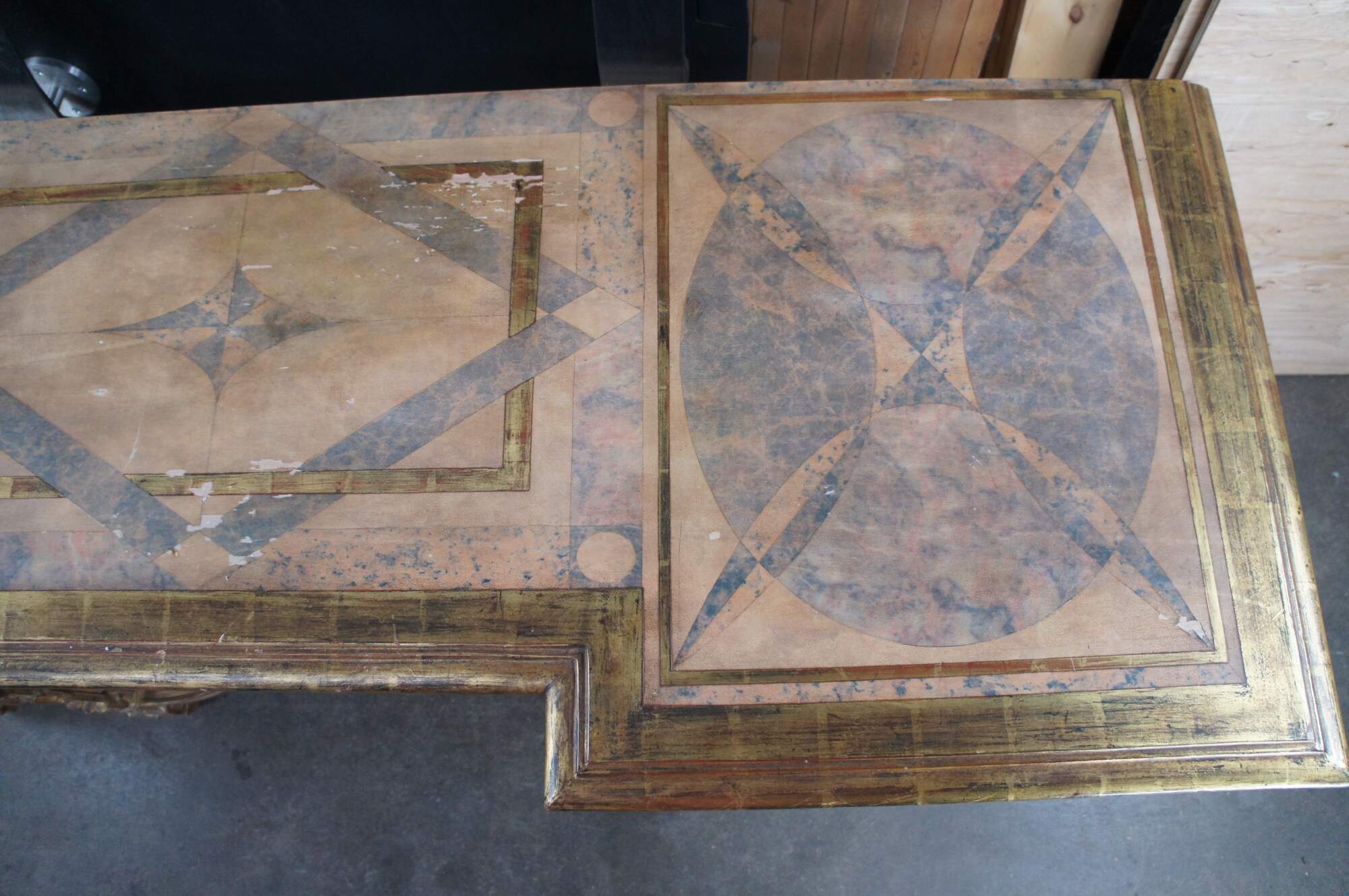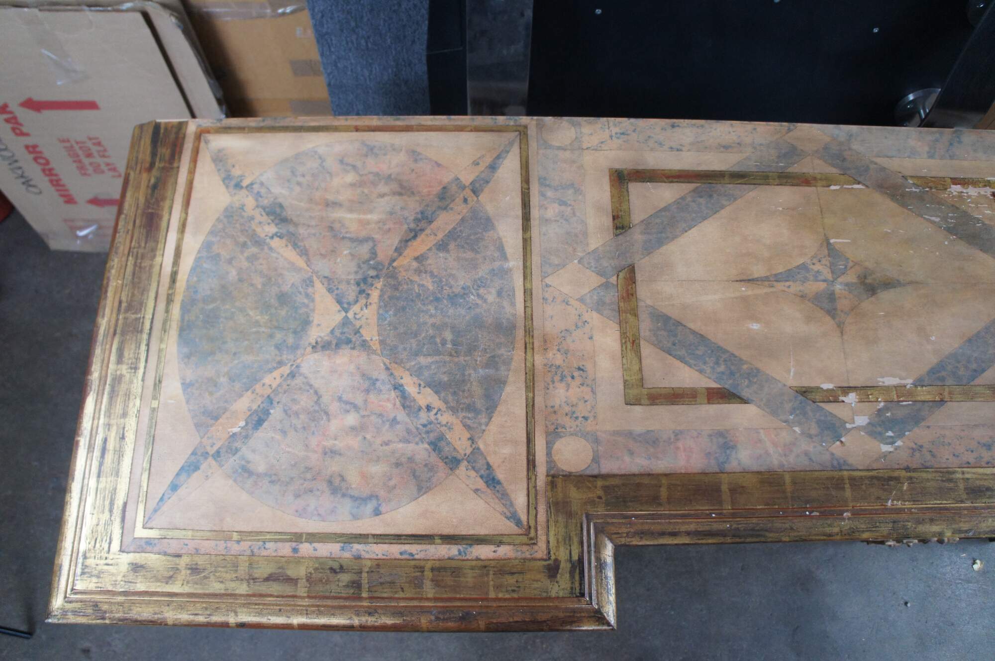 A monumental Italian Louis XIV style "Belle Epoque" giltwood console table. Belle Epoque (The Age of Excellence) takes inspiration from the very beginning of the French Golden Age of furniture in the 18th Century. The period itself began in France, mid-19th century, then spread to England, the continent and finally, to America. It ended in the early 1910s. This beautiful example features an ornate giltwood frame decorated with a scalloped center, intricate foliate motif, gadrooning and fanciful aprons. The top showcases a marbled painted geometric design. Long Legs are square tapered with scrolled design element over embellishments, acanthus flare, foliate and medallions. The four legs are connected on each side from front to back with an x-form stretcher, and joined at the center by an ornately scrolled stretcher leading to central acanthus finial. A true work of art.