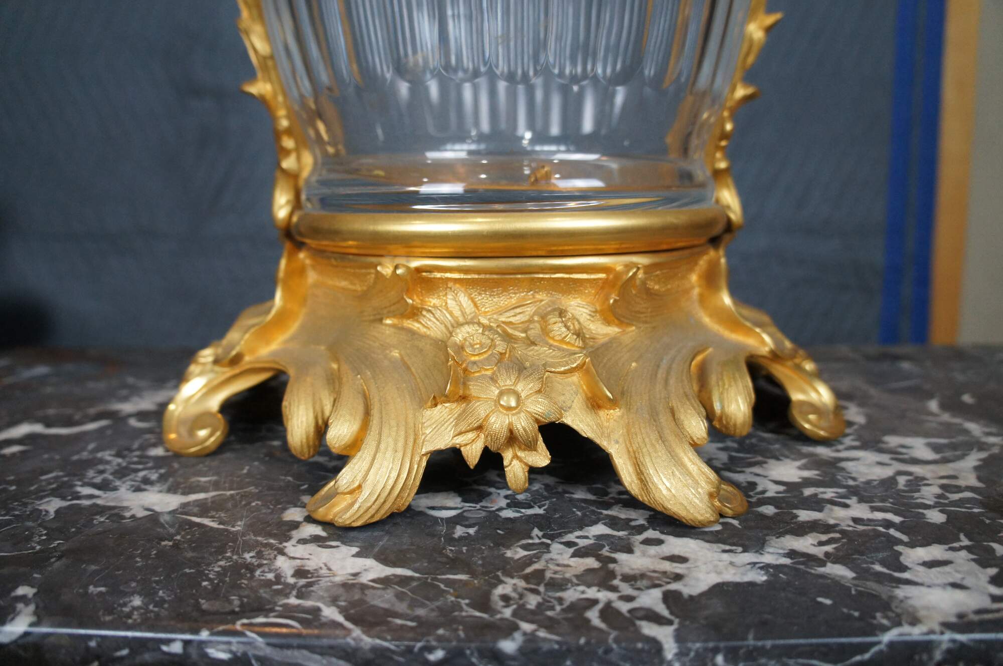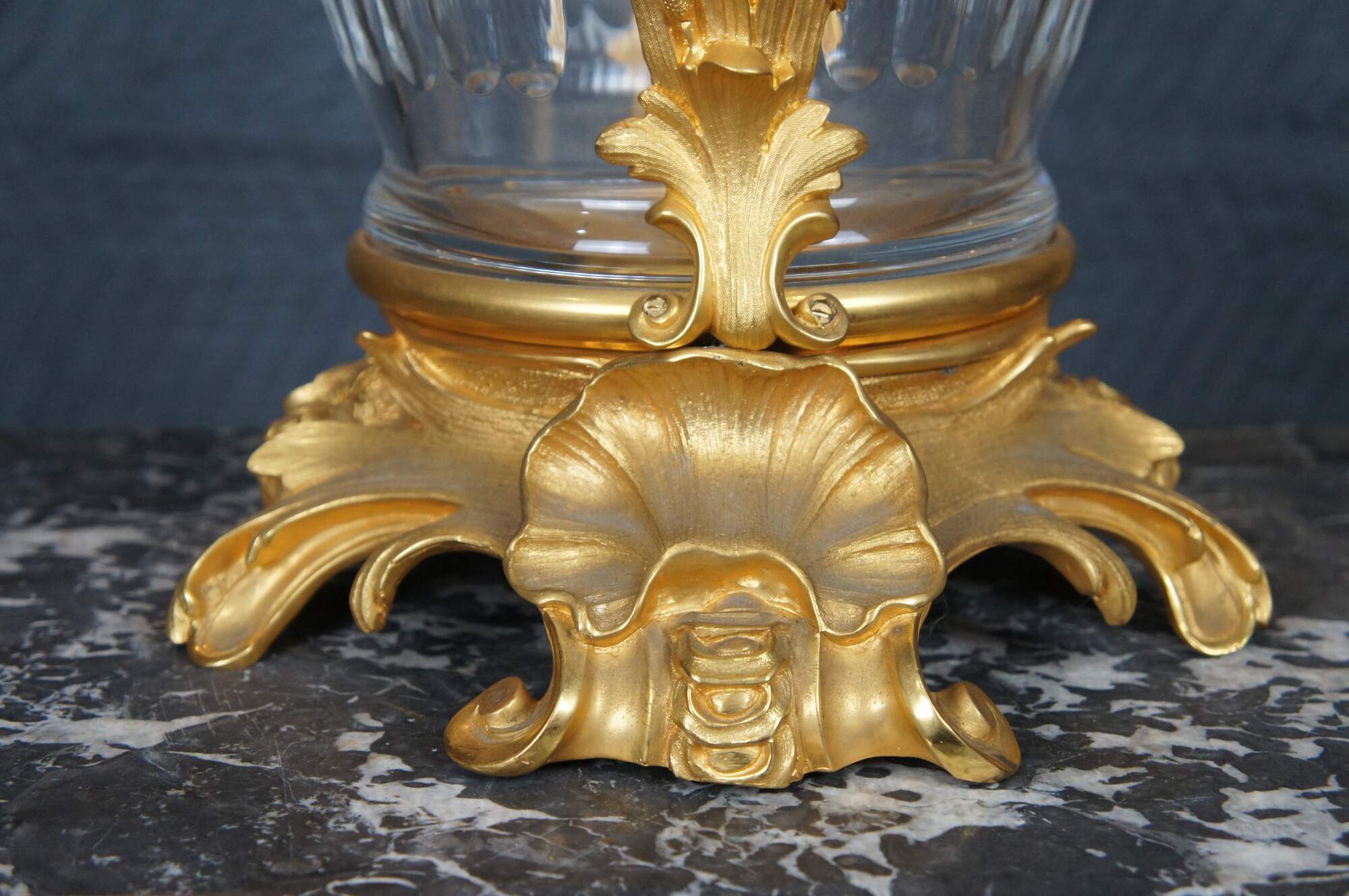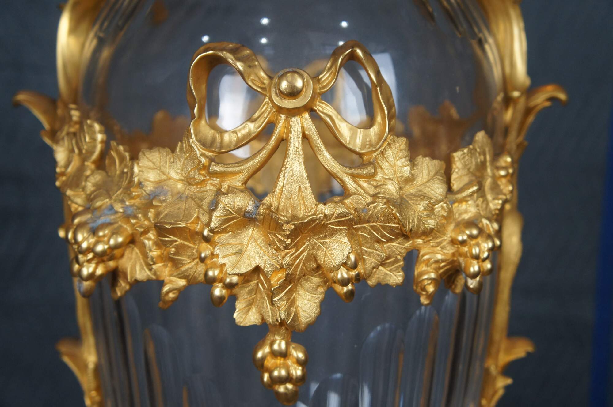 Late 20th Century Eric Stepnewski Centerpiece / Vase. Crafted from chiseled brass ormolu finished in 24k gold and crystal. Features a fluted cut crystal body decorated by 2 cherubs holding a trident and garlands of vines with grapes