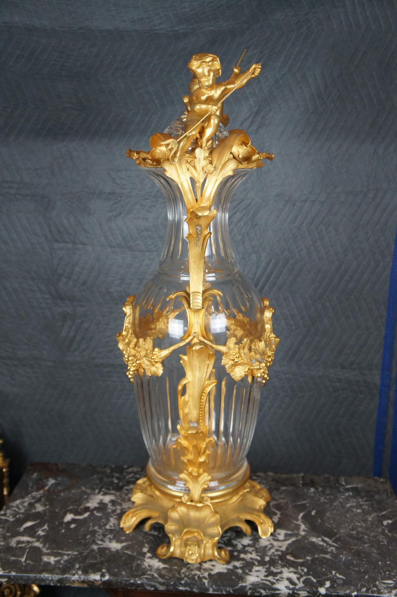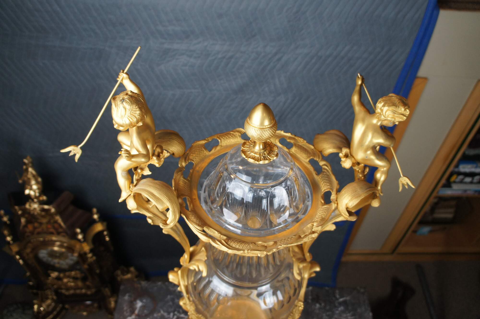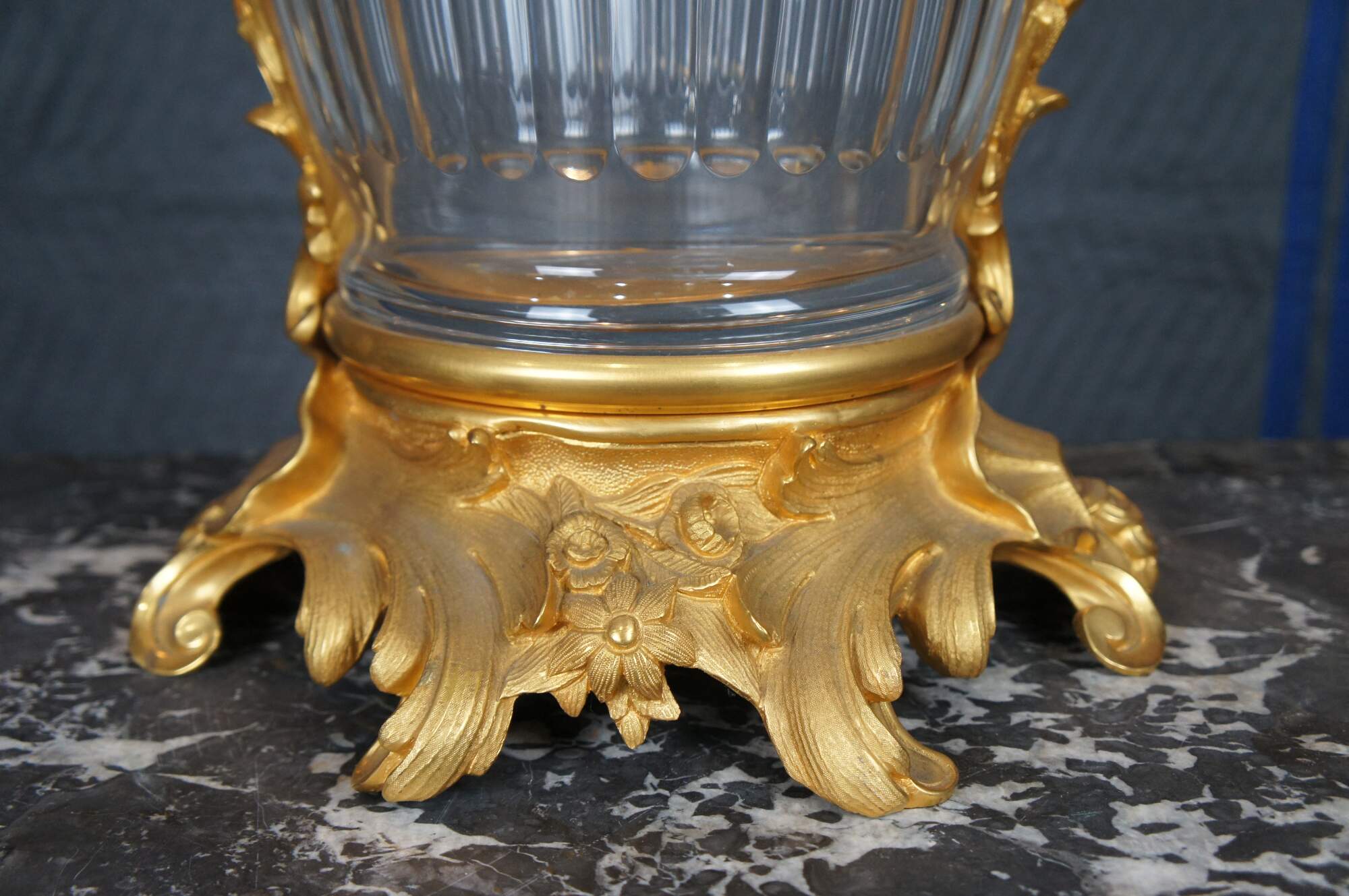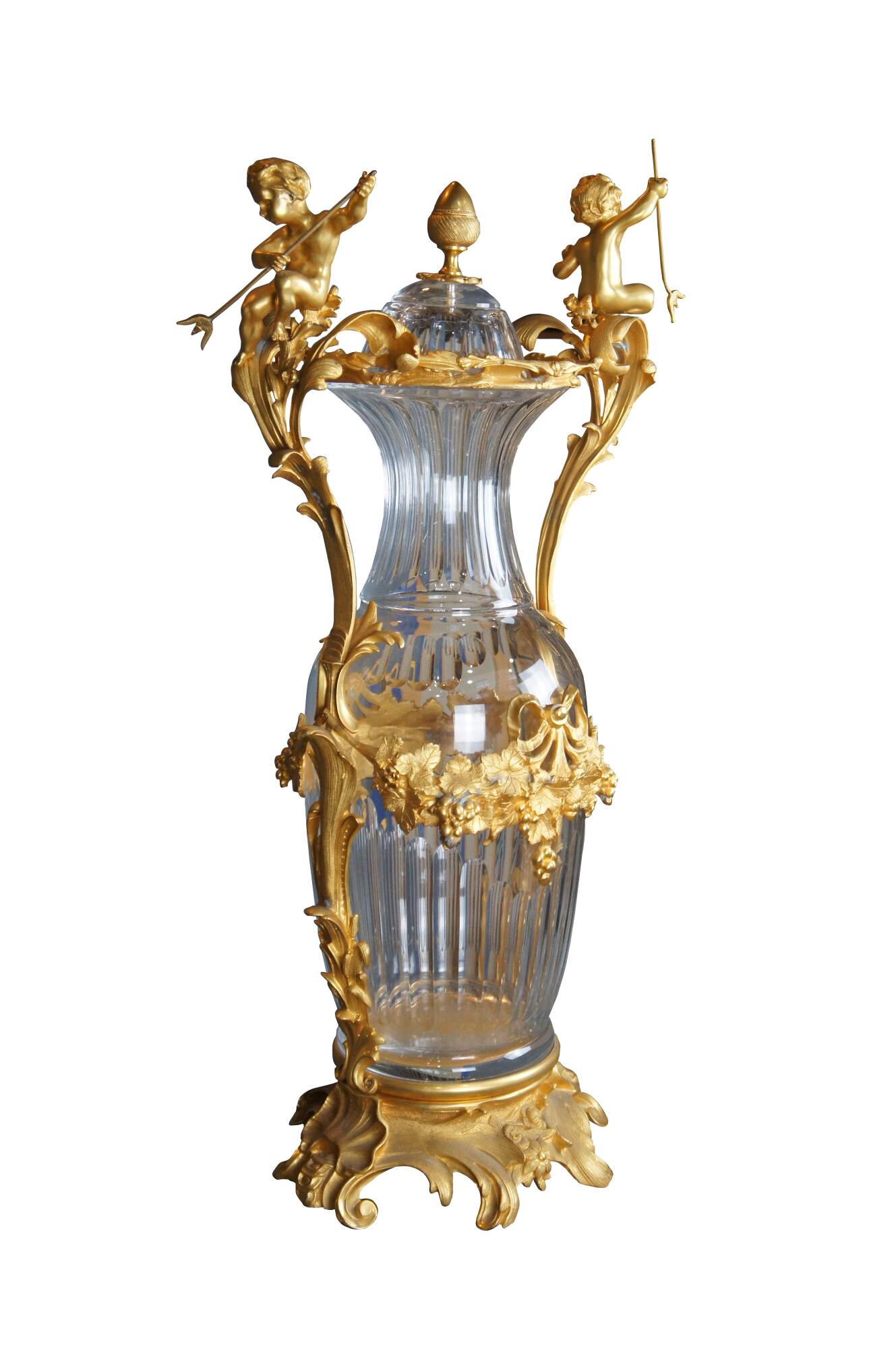 Late 20th Century Eric Stepnewski Centerpiece / Vase. Crafted from chiseled brass ormolu finished in 24k gold and crystal. Features a fluted cut crystal body decorated by 2 cherubs holding a trident and garlands of vines with grapes