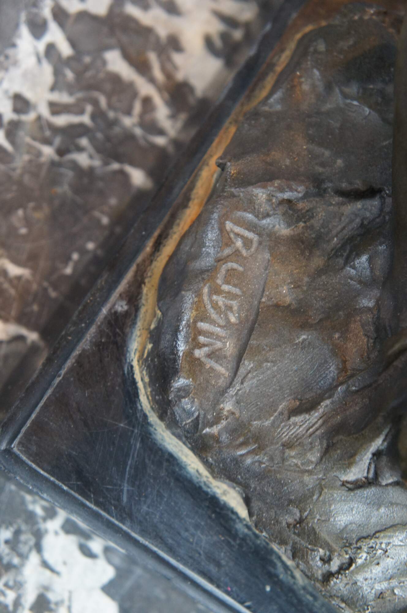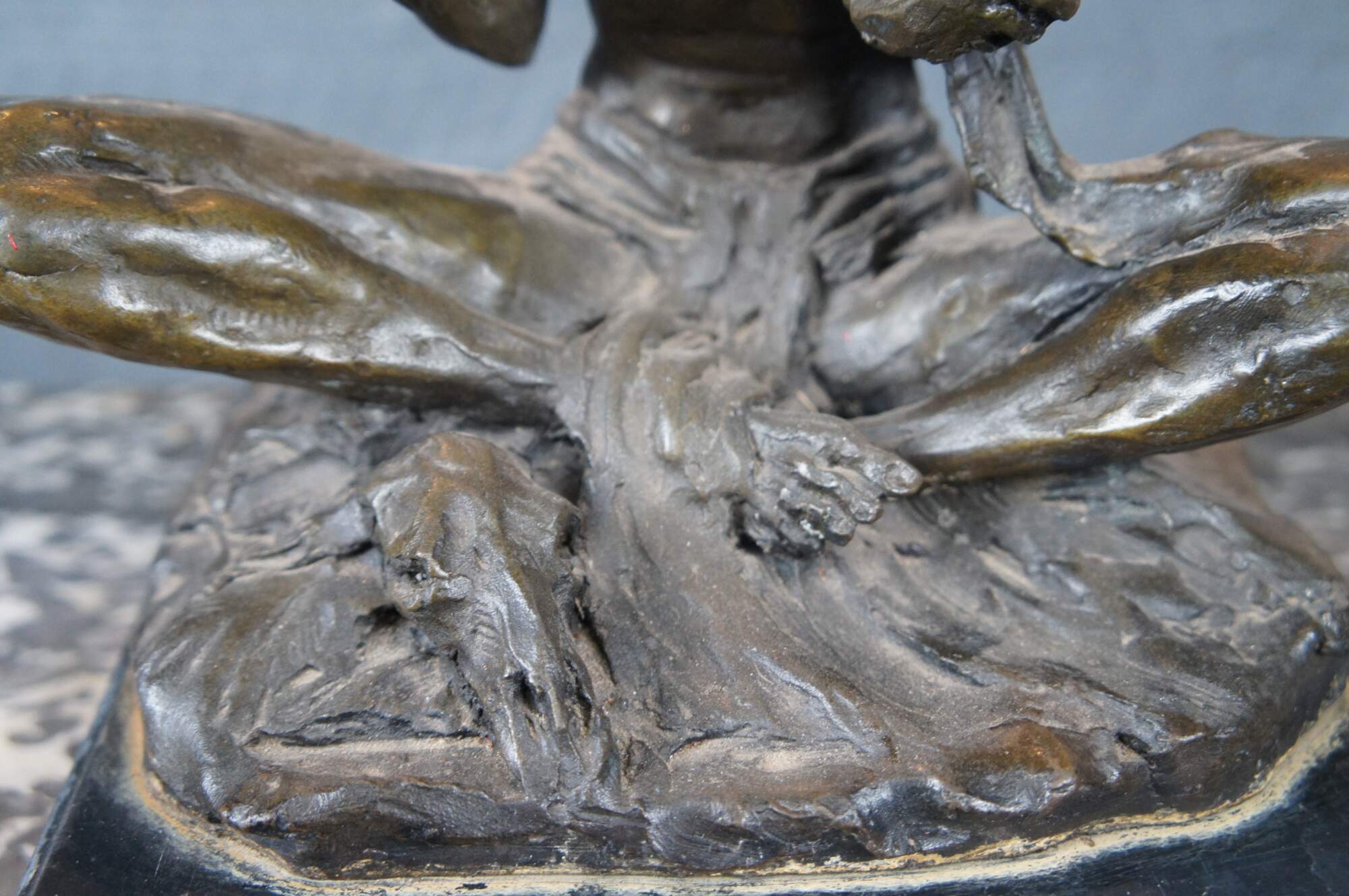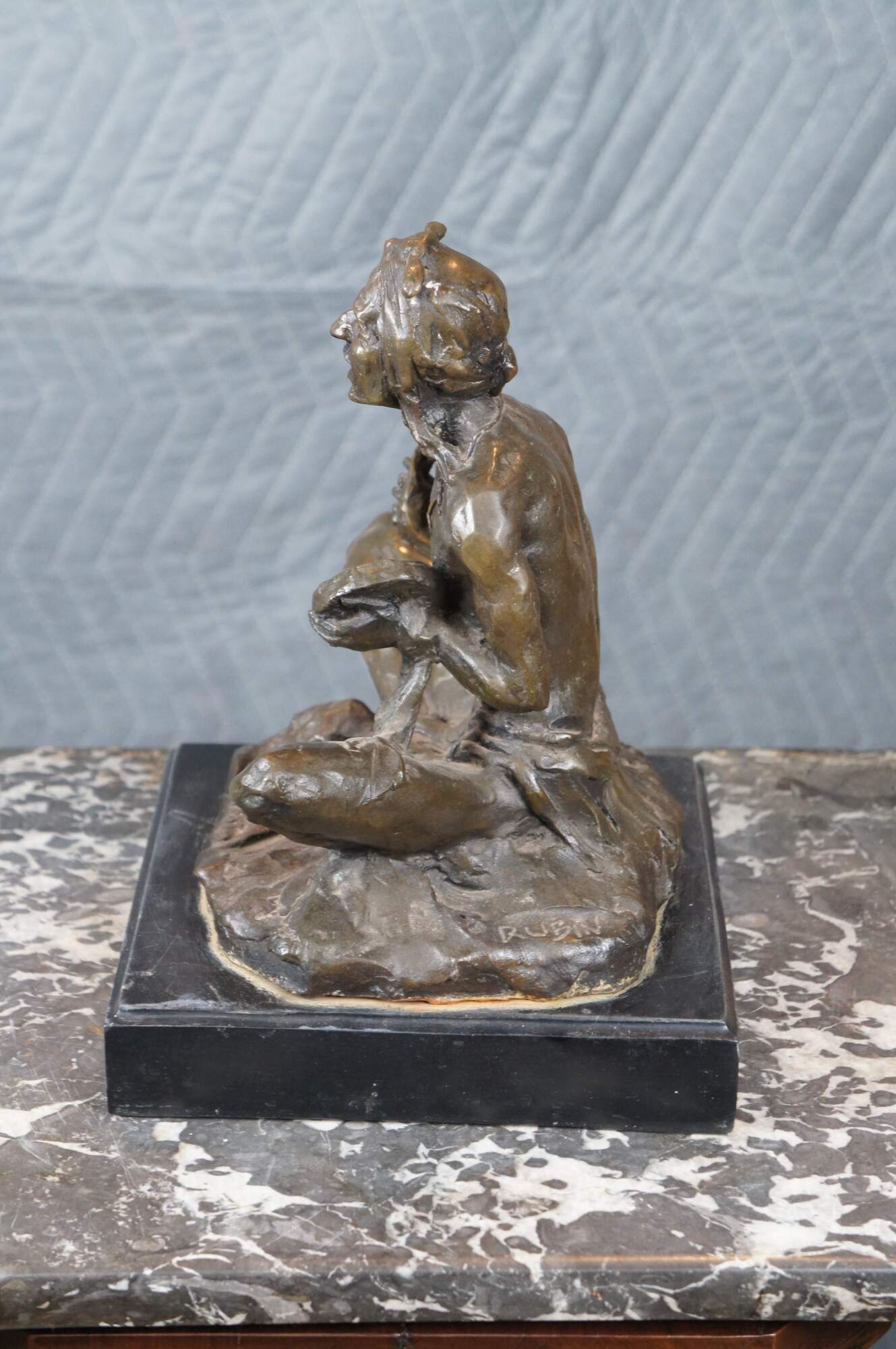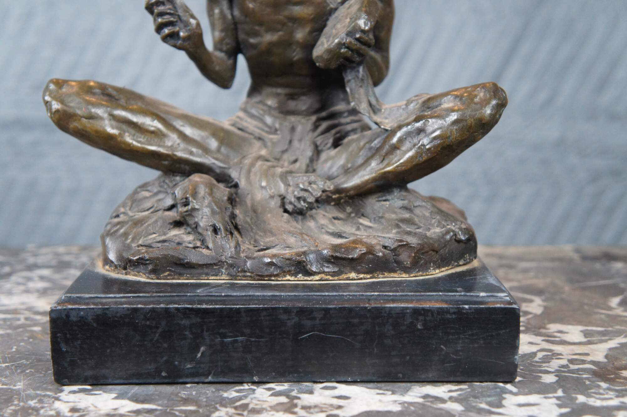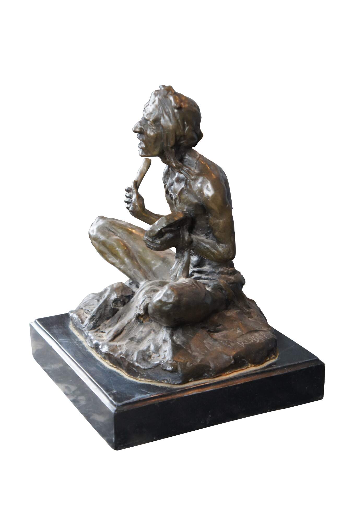 A 20th Century bronze featuring a Native American Chief sitting Indian style while playing the drum and singing. The chief is sitting next to a cow scull and raised over a plinth base. Signed by Jon Rubin.