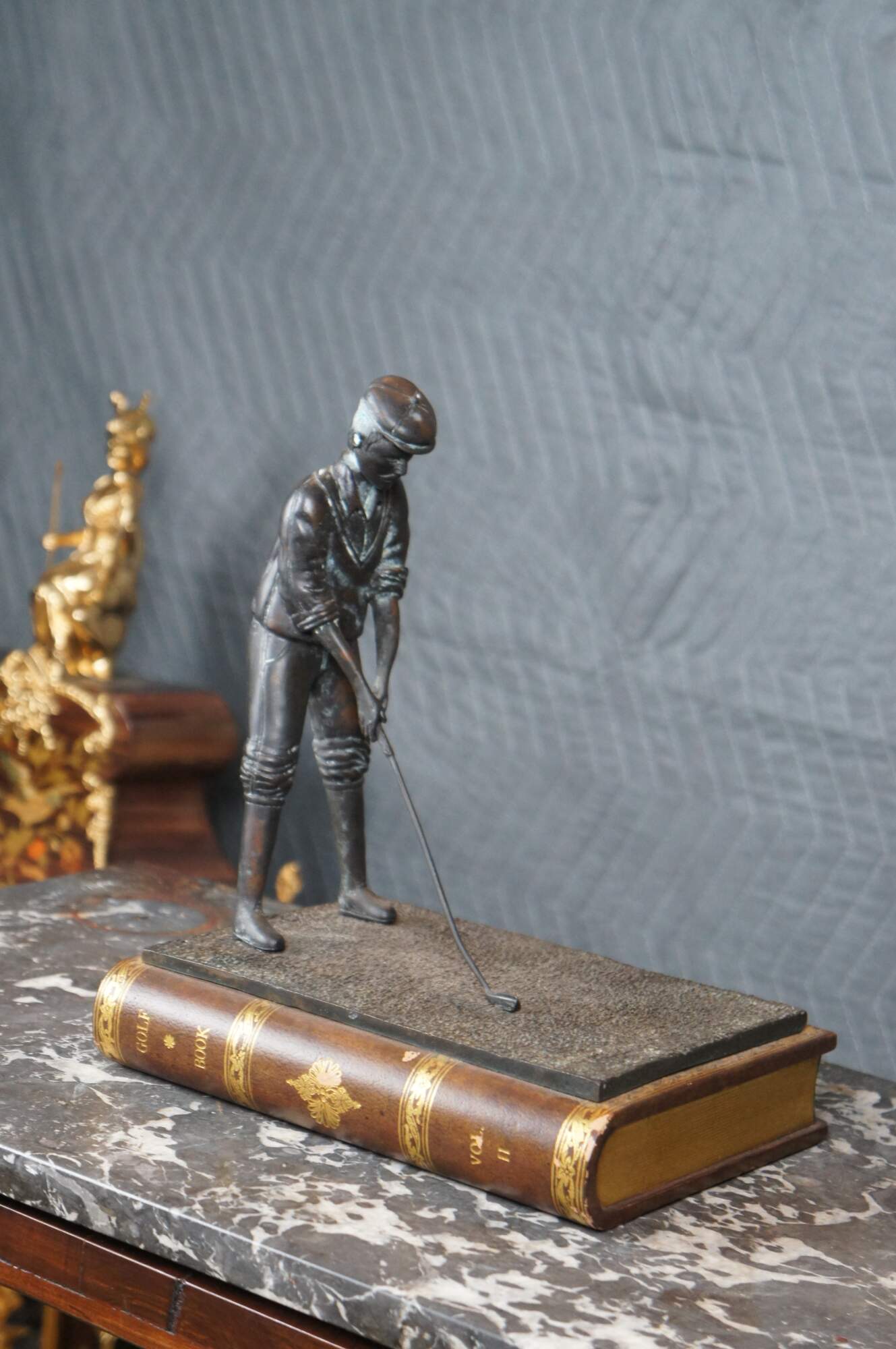 Late 20th Century Maitland Smith Bronze Golfer on Book Sculpture / bookend. Features a right handed gentleman adressing the ball over a tooled leather book marked "Golf Book". The book has faux gilded pages.