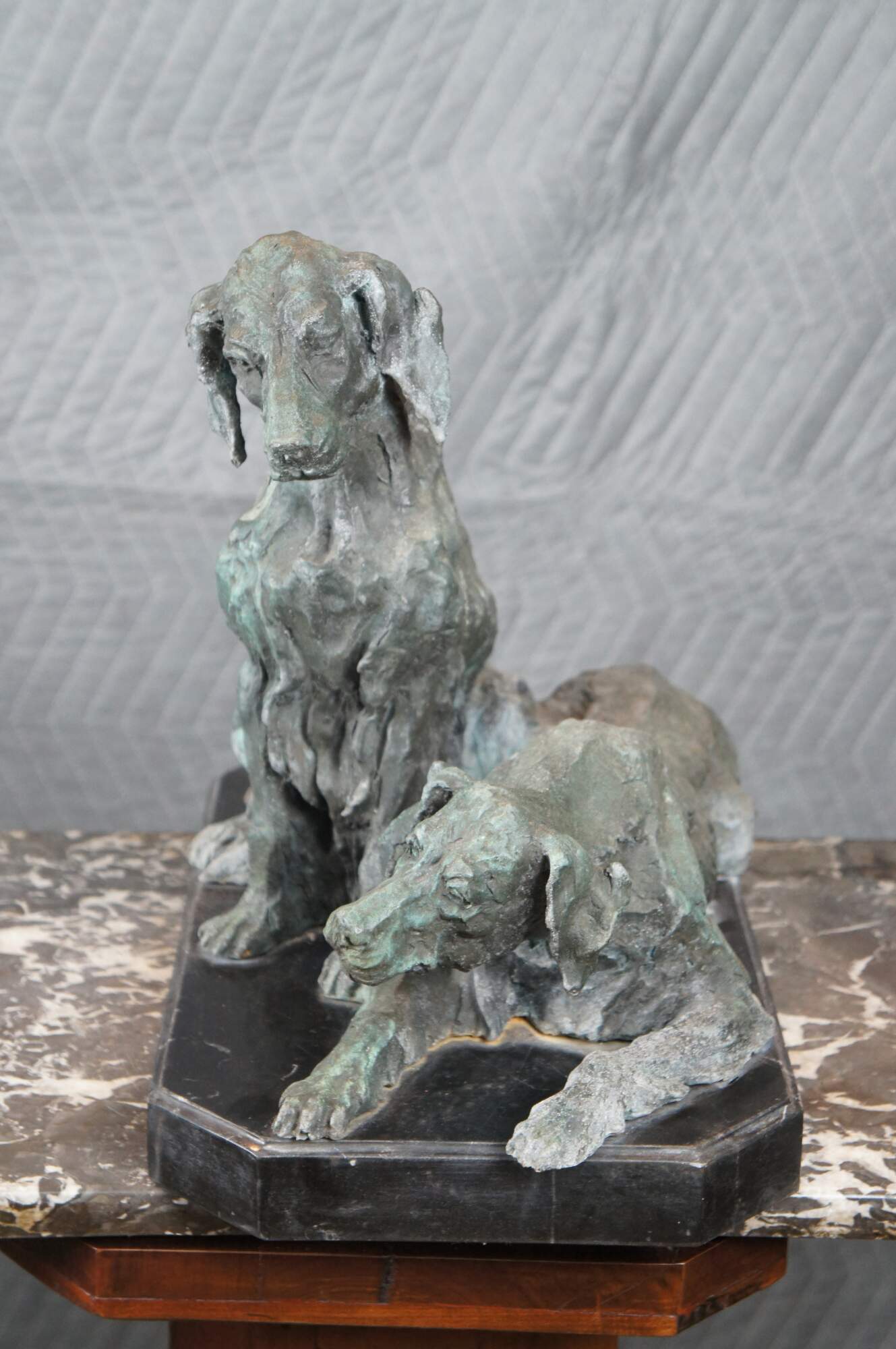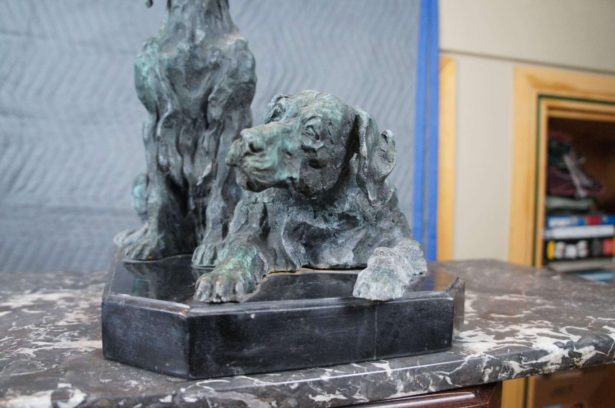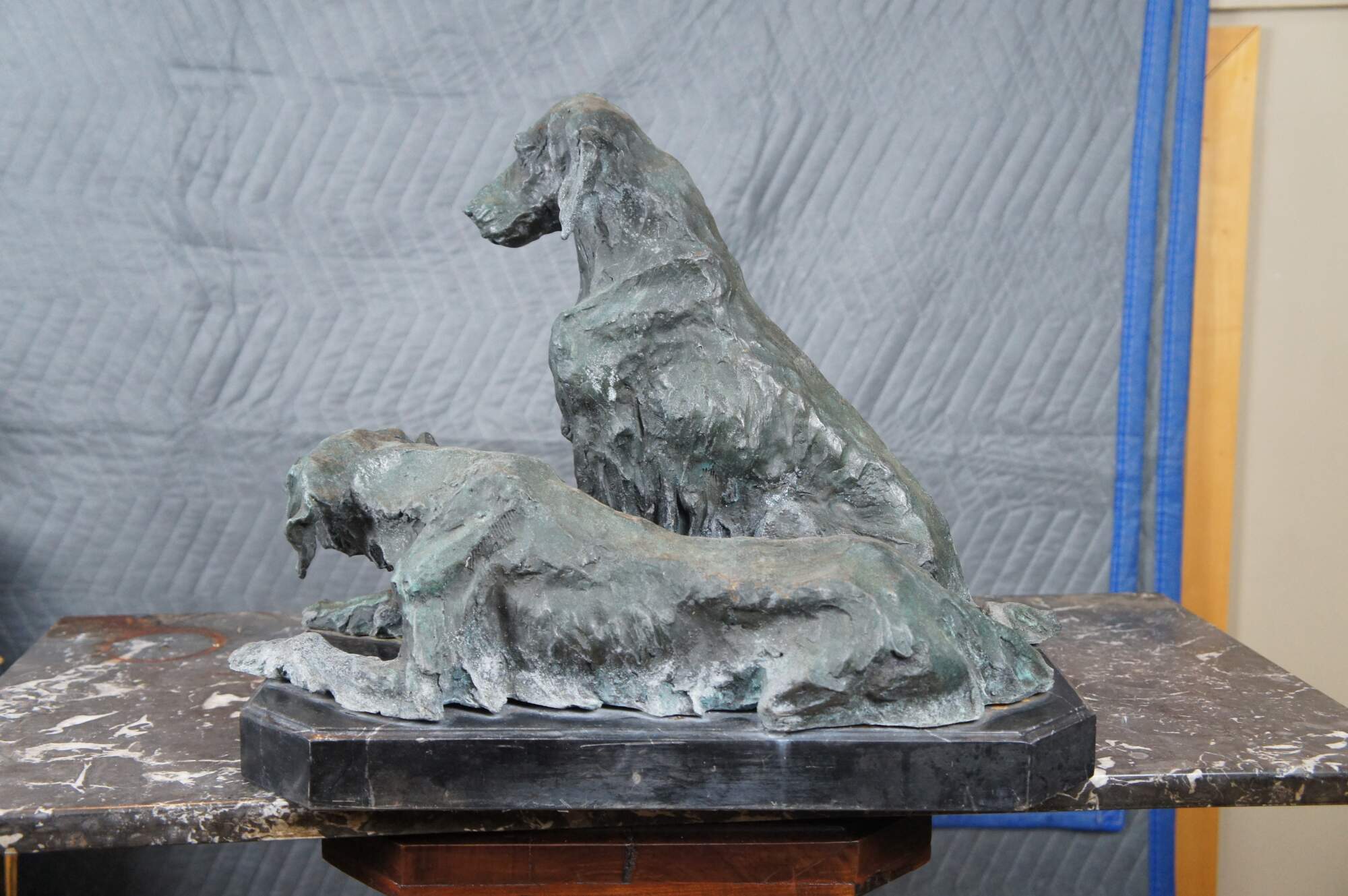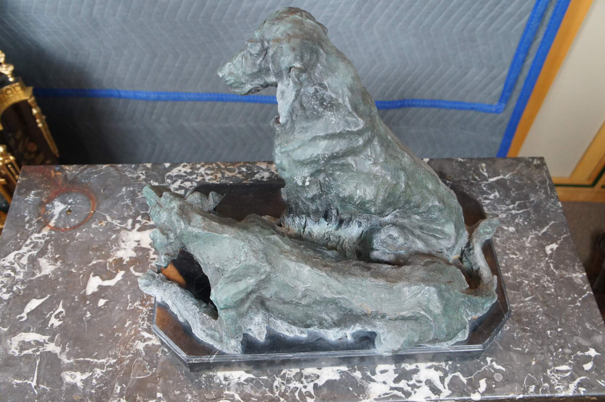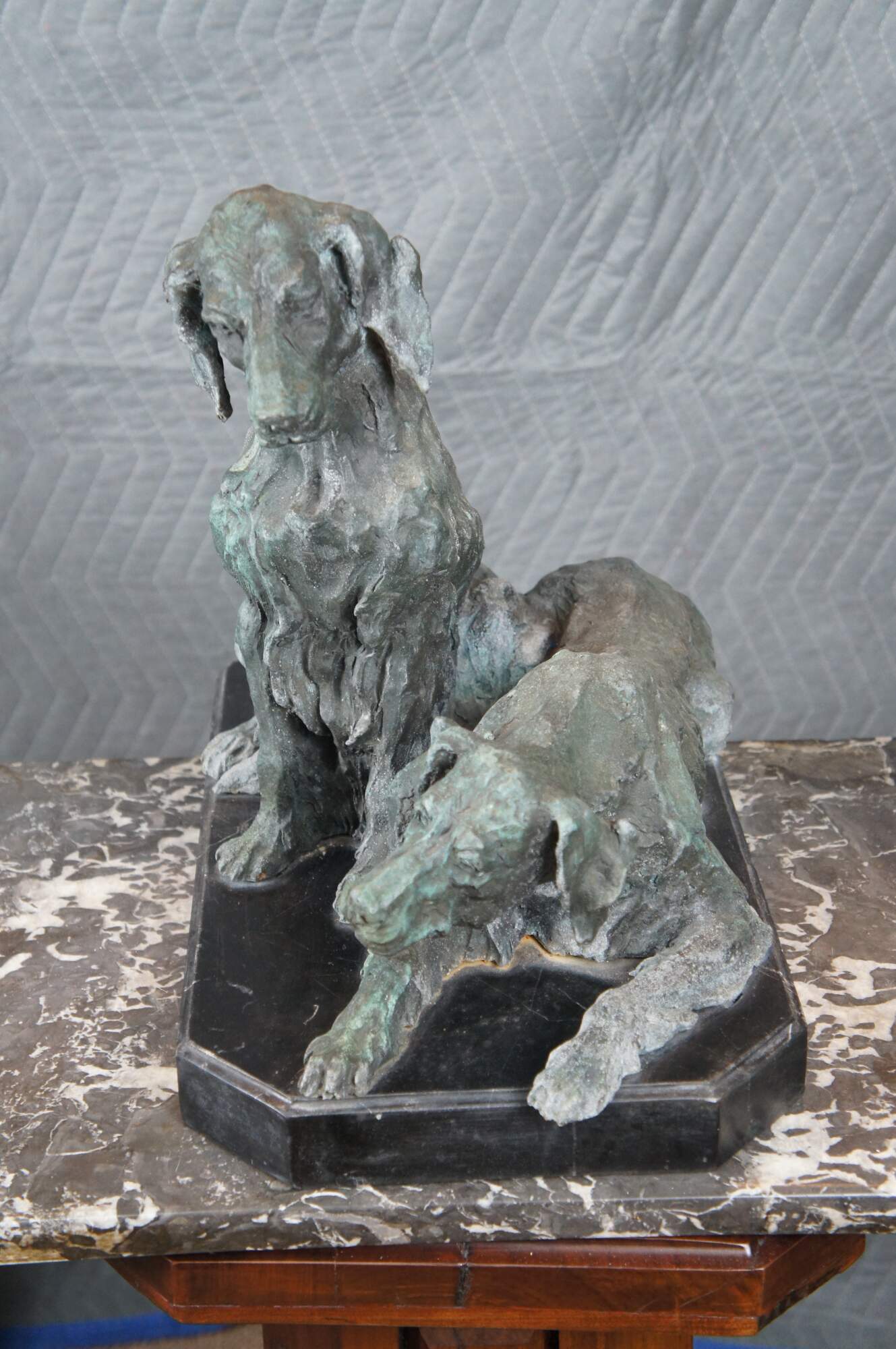 Late 20th Century bronze sculpture featuring two retrievers hunting dogs, one resting and the other kneeling. The bronze is done in French manner After Pierre Jules Mene Statue. Features a verdigris patina and rests upon a marble plinth base.
