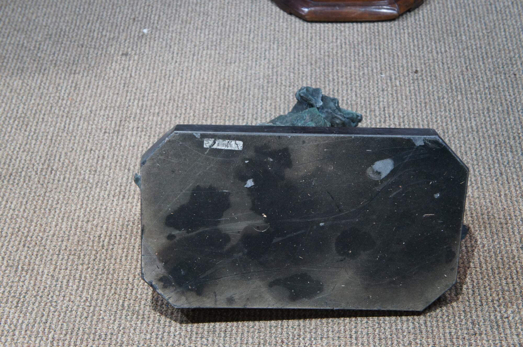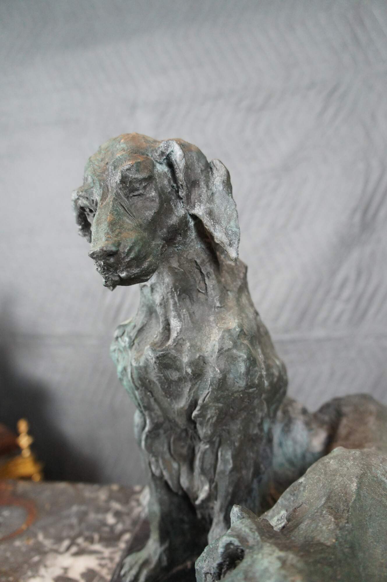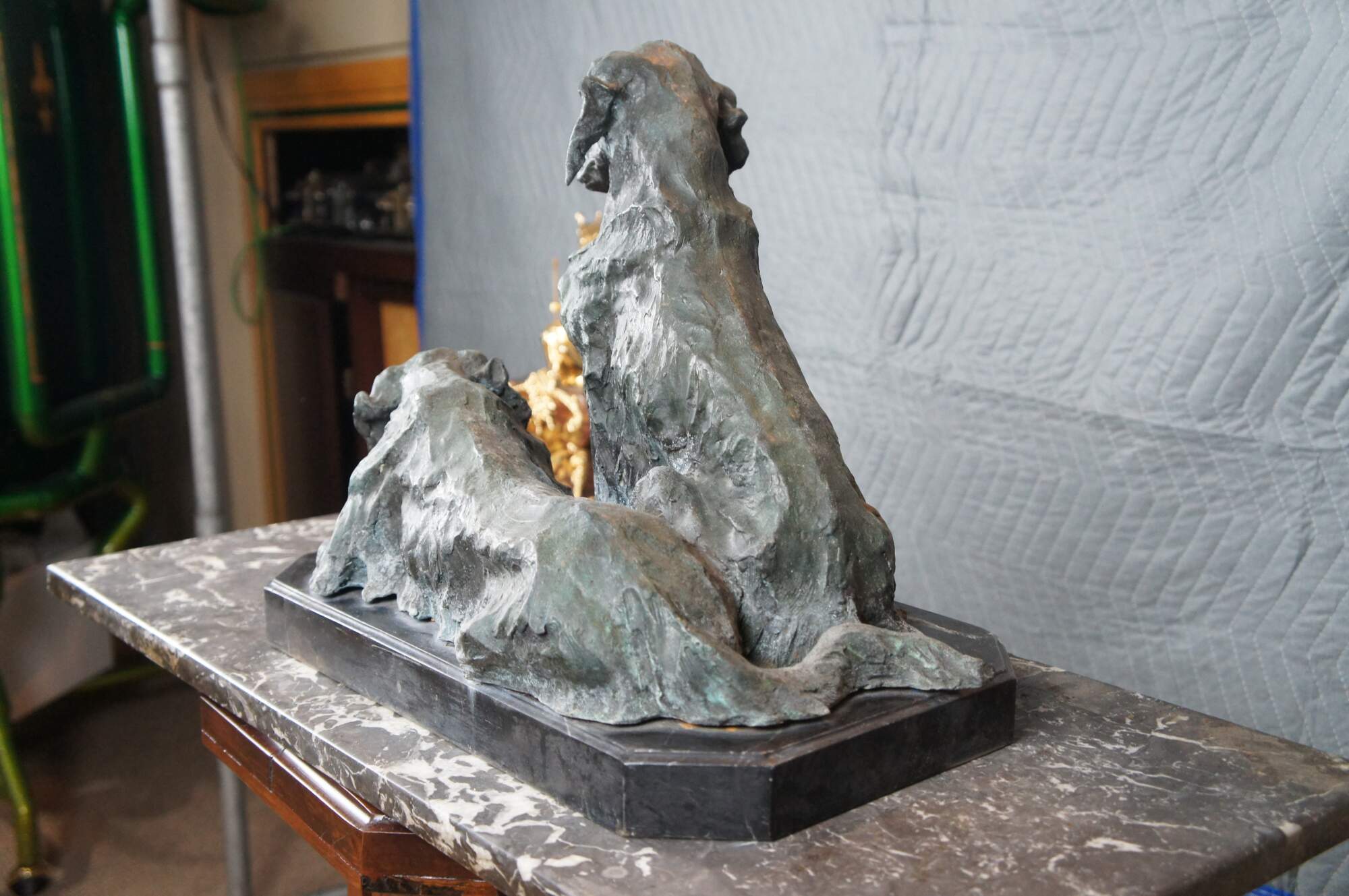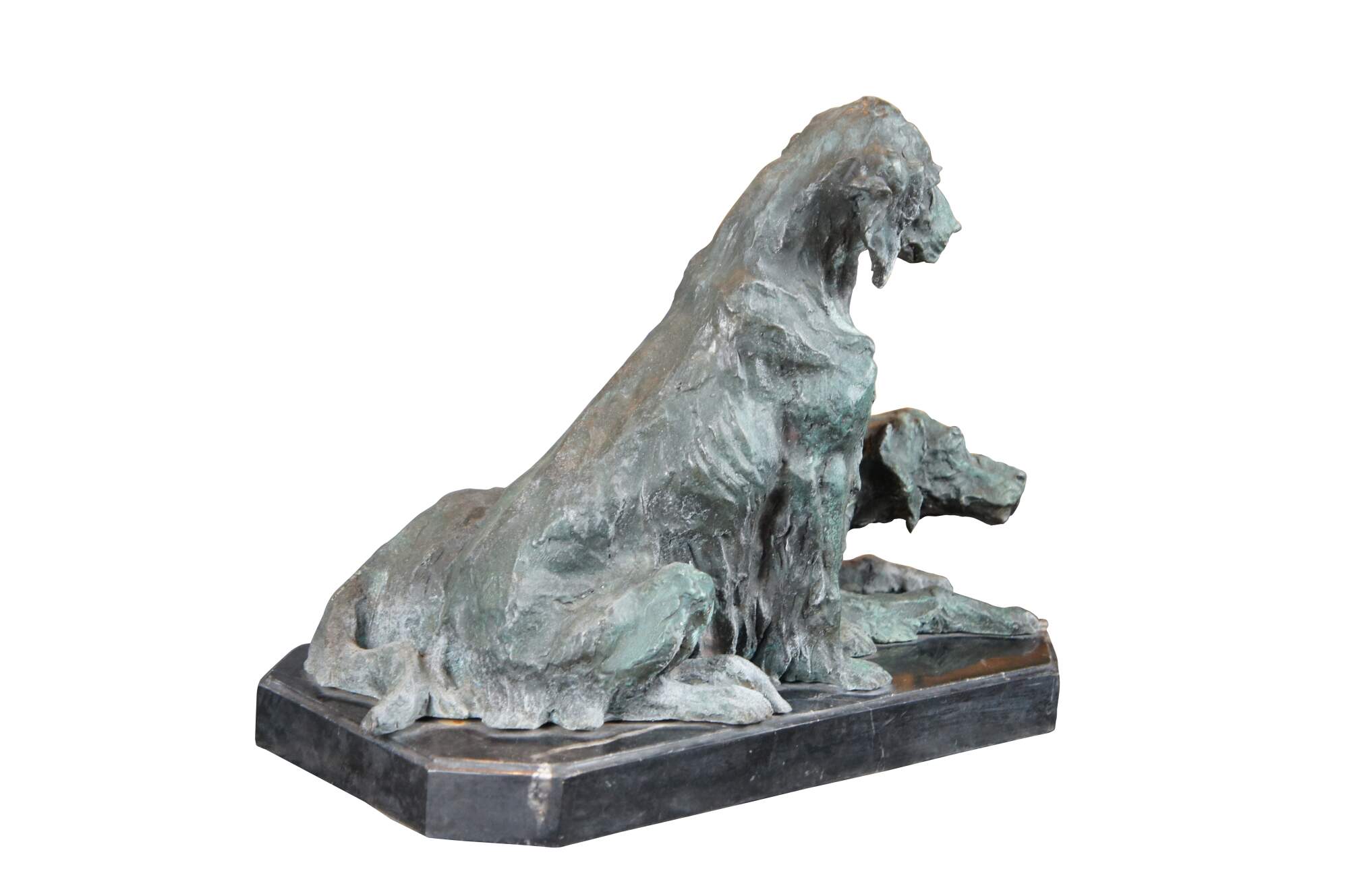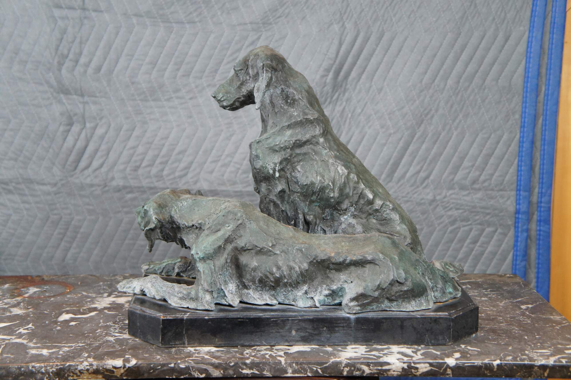 Late 20th Century bronze sculpture featuring two retrievers hunting dogs, one resting and the other kneeling. The bronze is done in French manner After Pierre Jules Mene Statue. Features a verdigris patina and rests upon a marble plinth base.