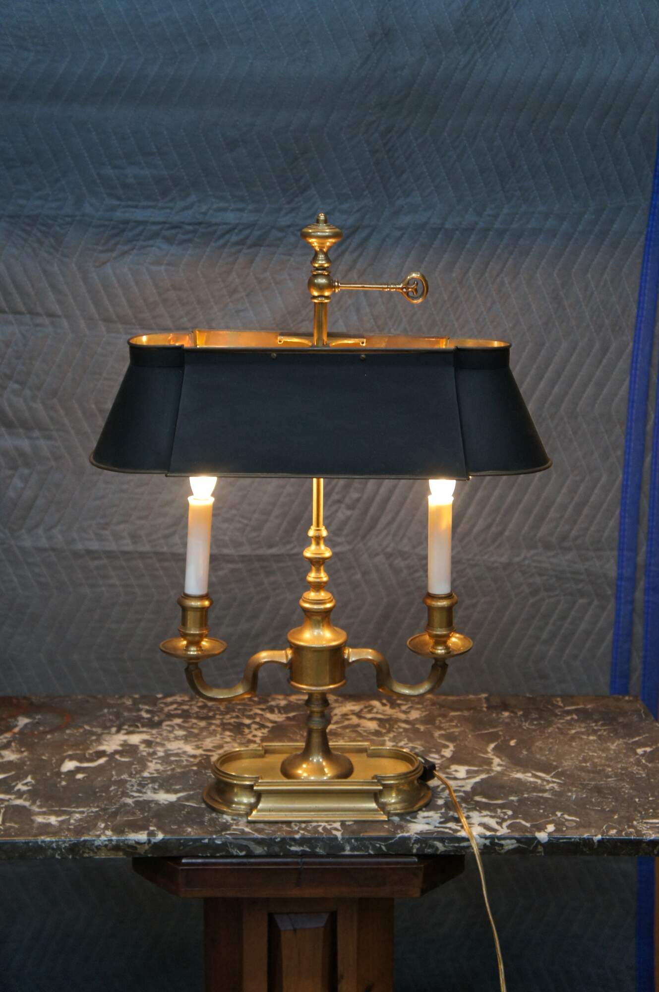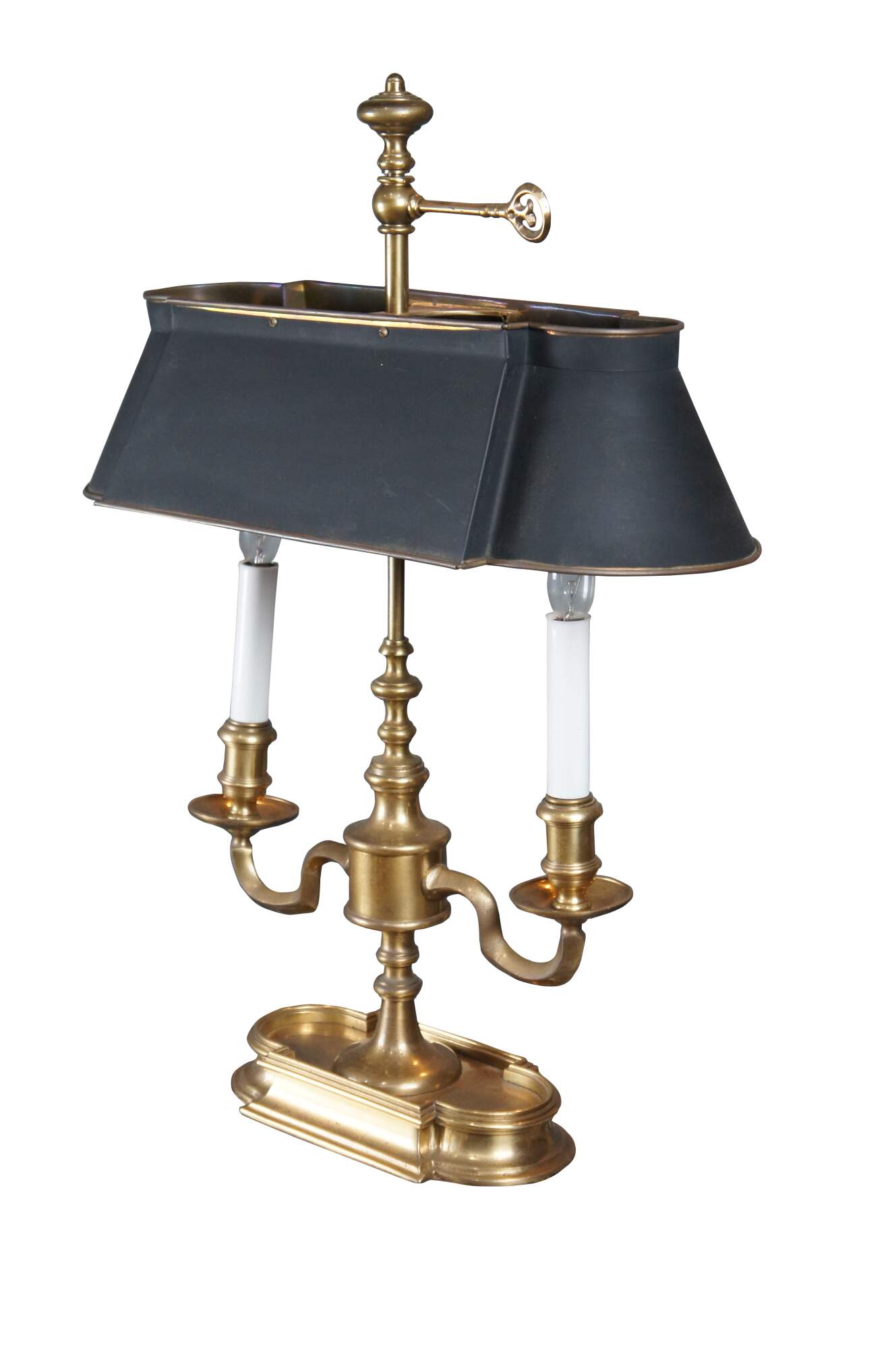 An exquisite Bouillotte lamp by Frederick Cooper, circa 1970s. Features a brass frame with two candlestick lights over an asymmetrical quatrefoil base. The lamp is fitted with a back tole shade in matching form to the base. Great for use on a desk, library table, buffet or side table.