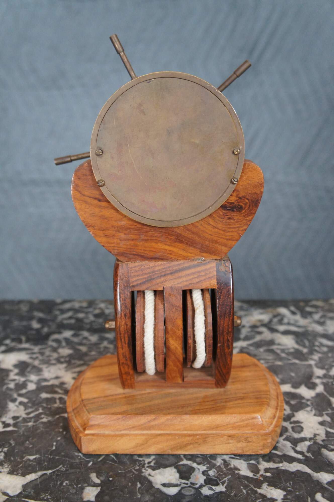 Brass ships wheel clock over wooden pulley. Clock face marked london.