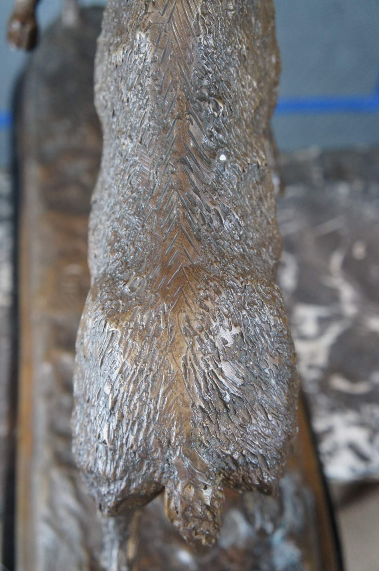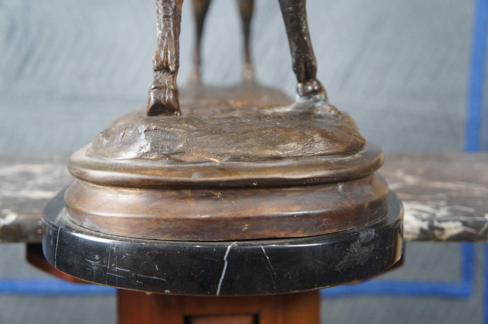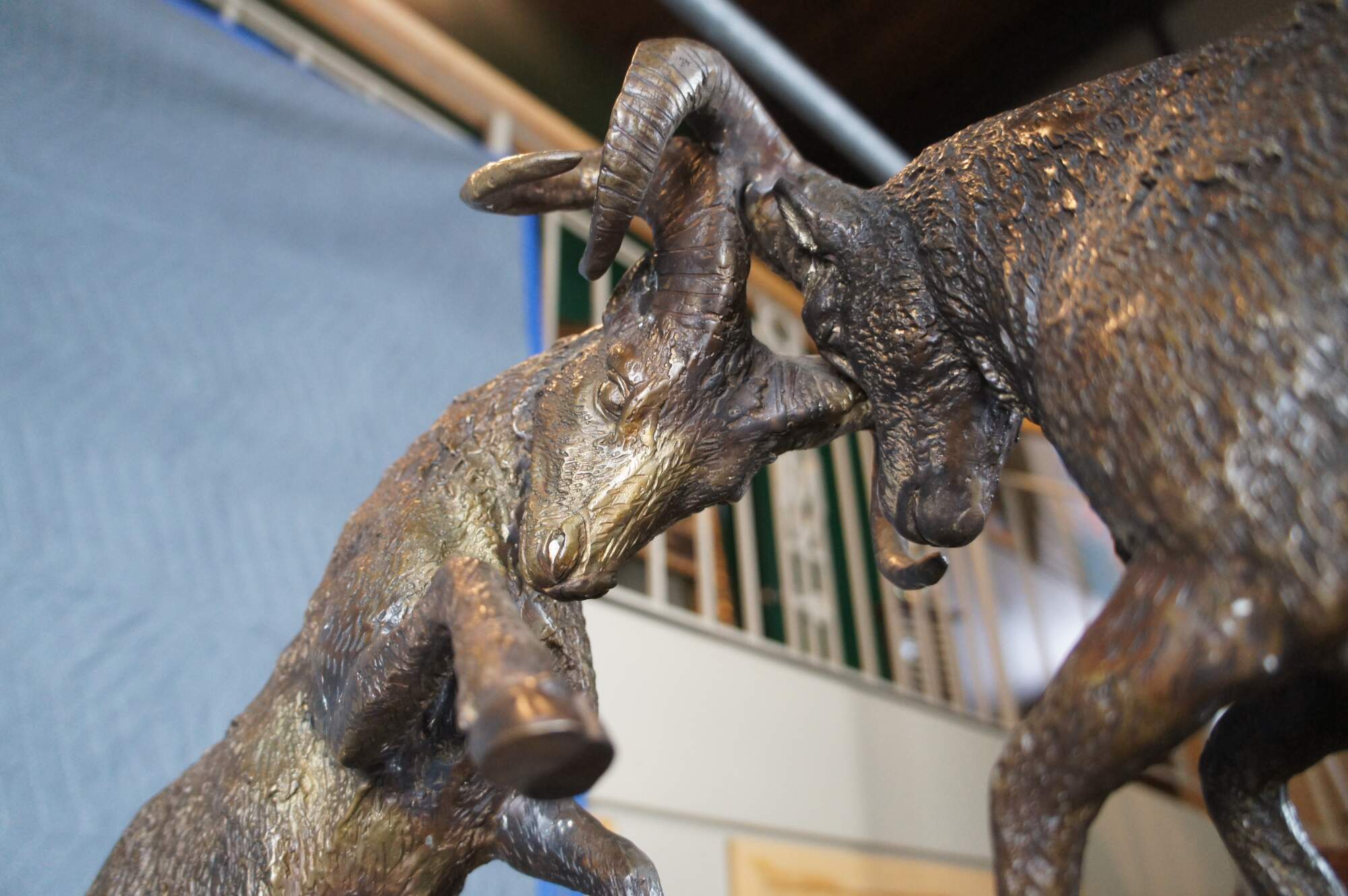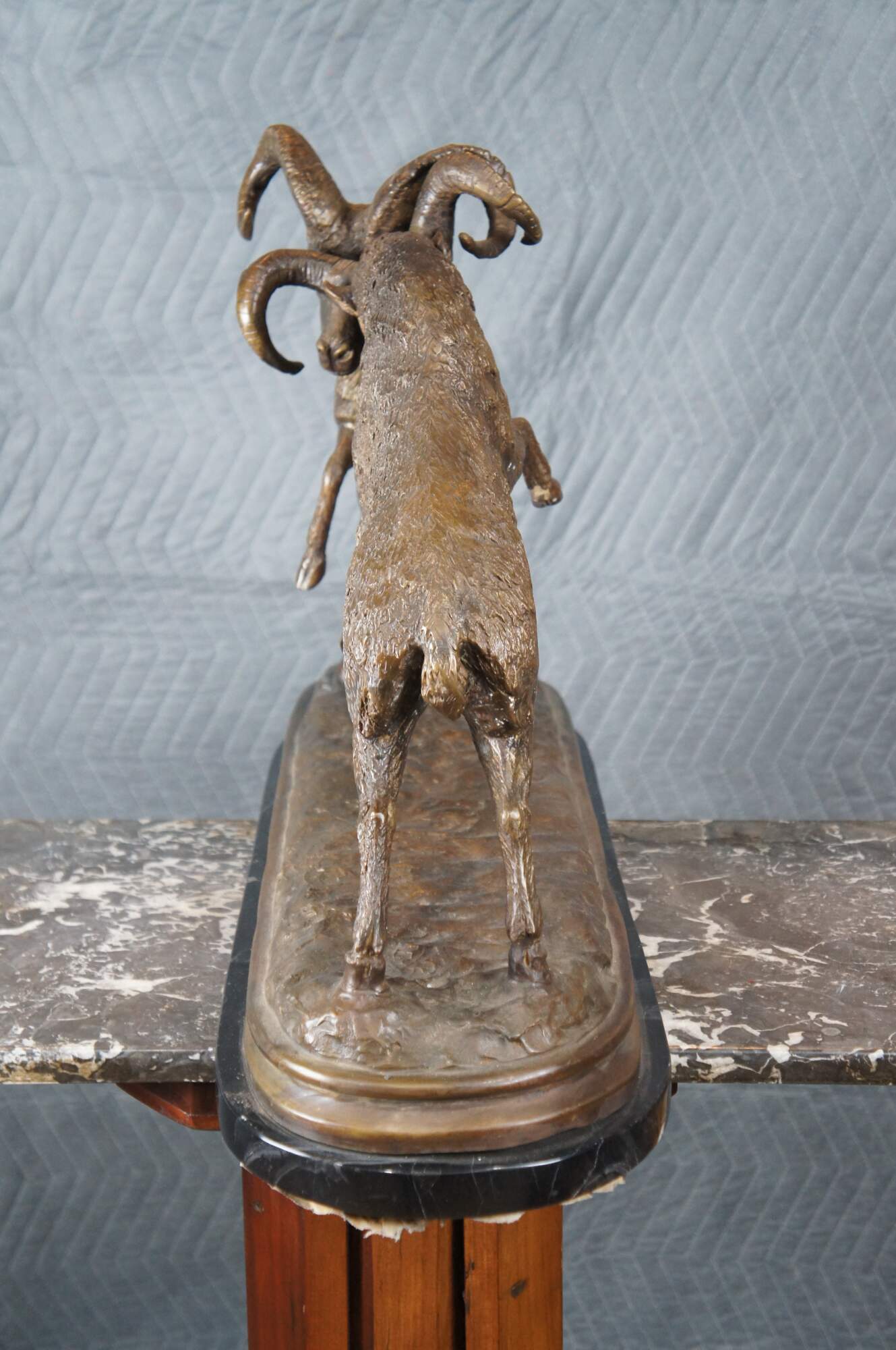 Large Signed Lost Wax Bronze Sculpture of Fighting Rams. Features two bucking / fighting mountain rams. Well detailed with fur, horns, facial features over a marble base. Signature monogram ETL on surface.