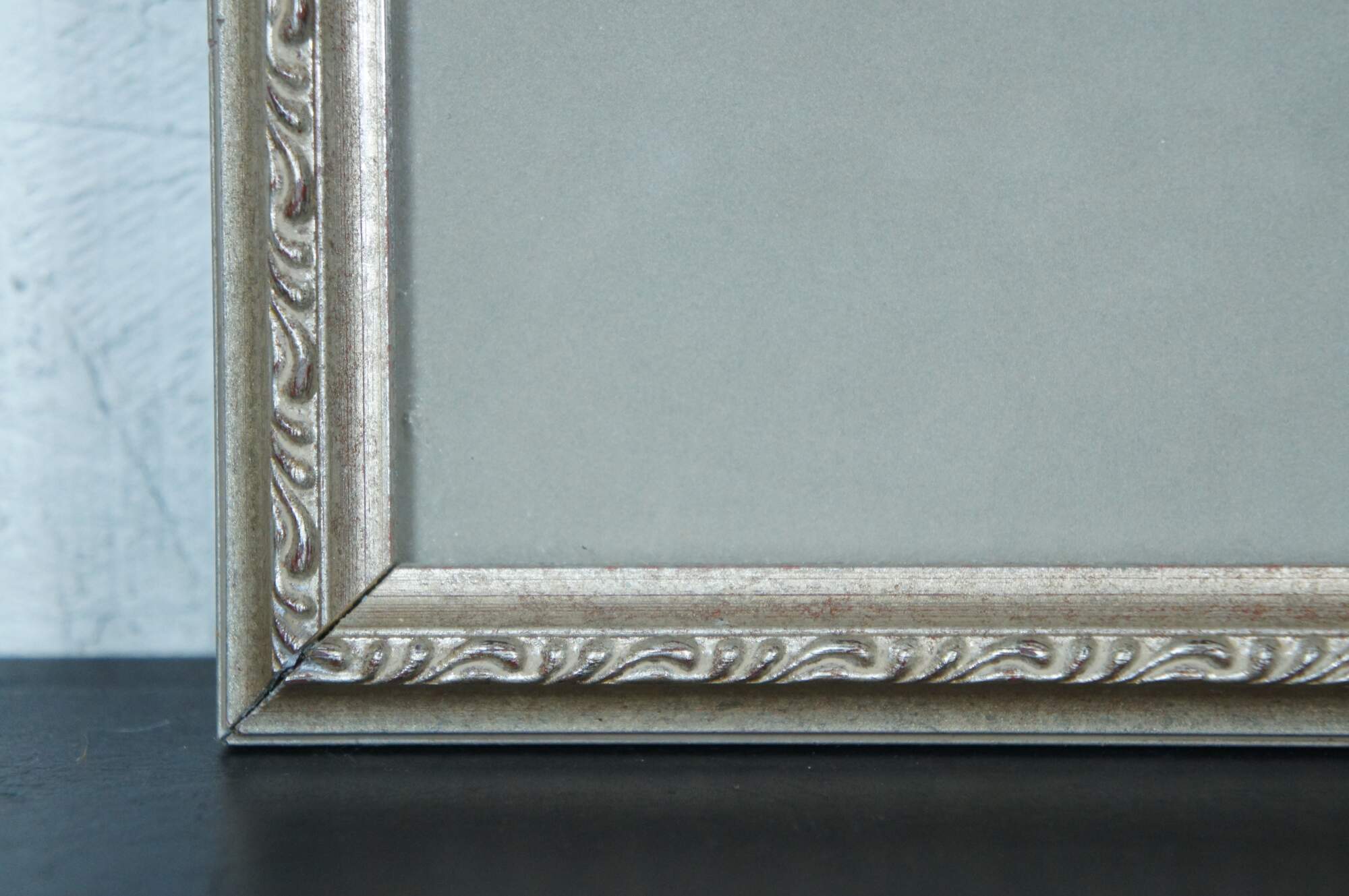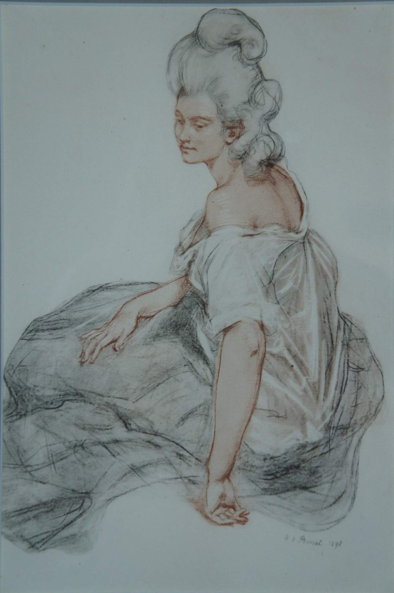 Late 19th century antique color lithograph print titled "Manon" by Rene-Xavier Francois Prinet. Shows a female figure with tall Pompador hair do, seated, looking over her left shoulder, dressed in a loose white chemise. Giltwood frame with raised foliate detail; mottled gray mat. Lithograph on wove paper. Signed on the plate lower right margin. L’Estampe Moderne’s blind stamp on the bottom right corner. Published by Masson & Piazza, Paris.