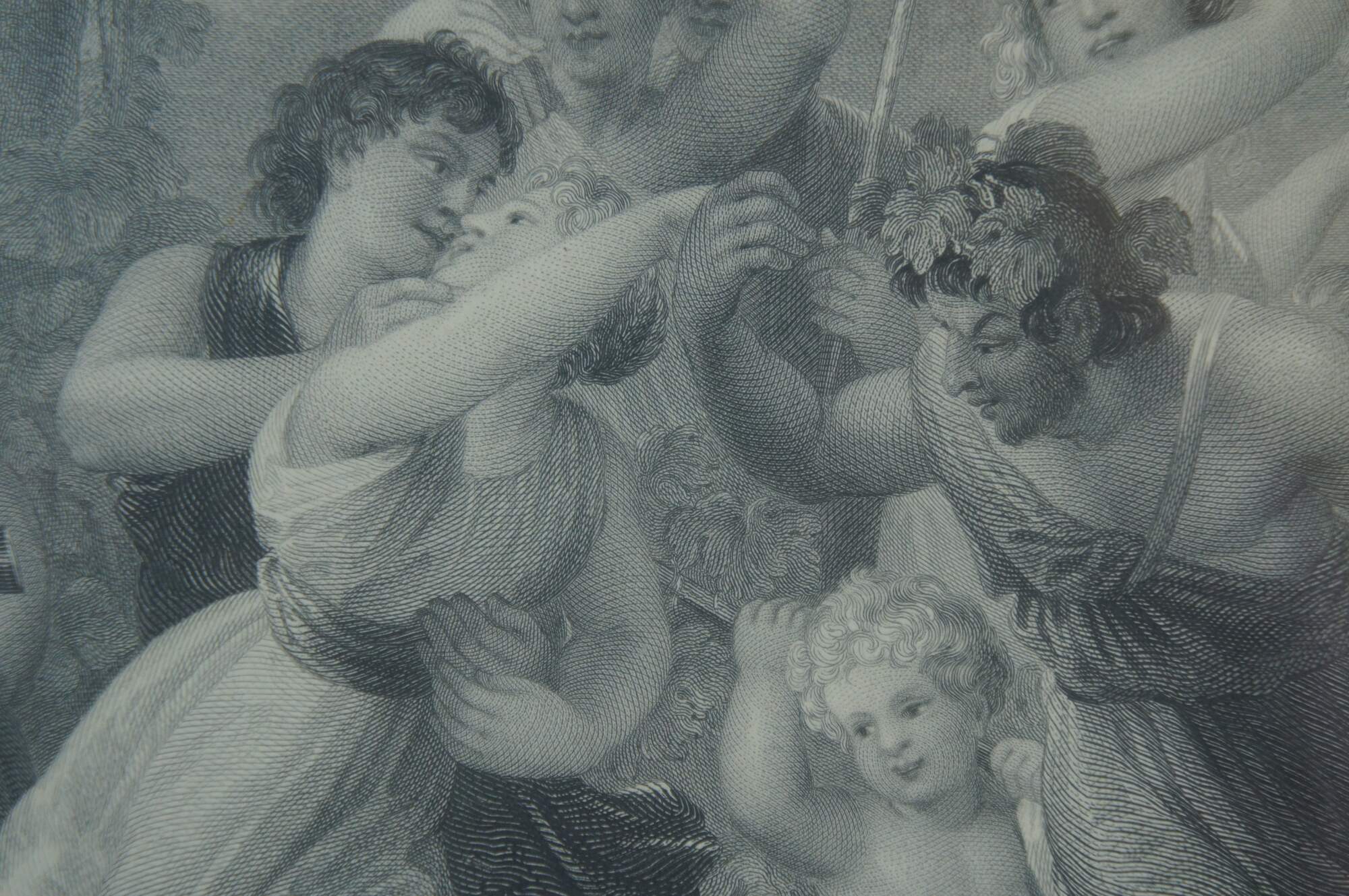 Late 19th century neoclassical engraving titled "The Vintage Festival" by Thomas Stothard, engraved by Thomas Garner, published by George Barrie. Shows a Greek / Roman festival scene / bacchanal of male and female figures dancing with baskets of grapes. Beveled giltwood frame with distressed carved edge; turquoise blue mat.
