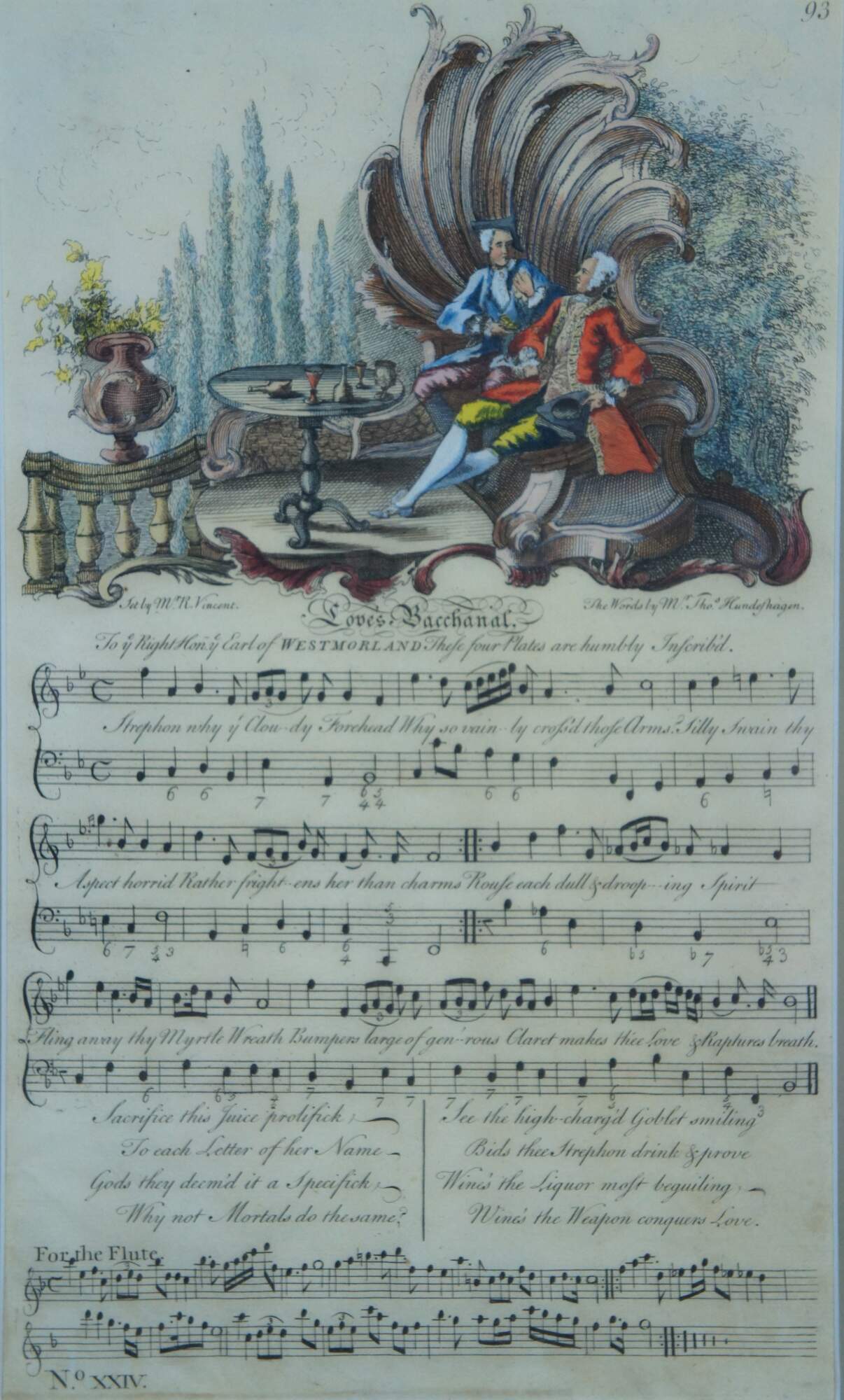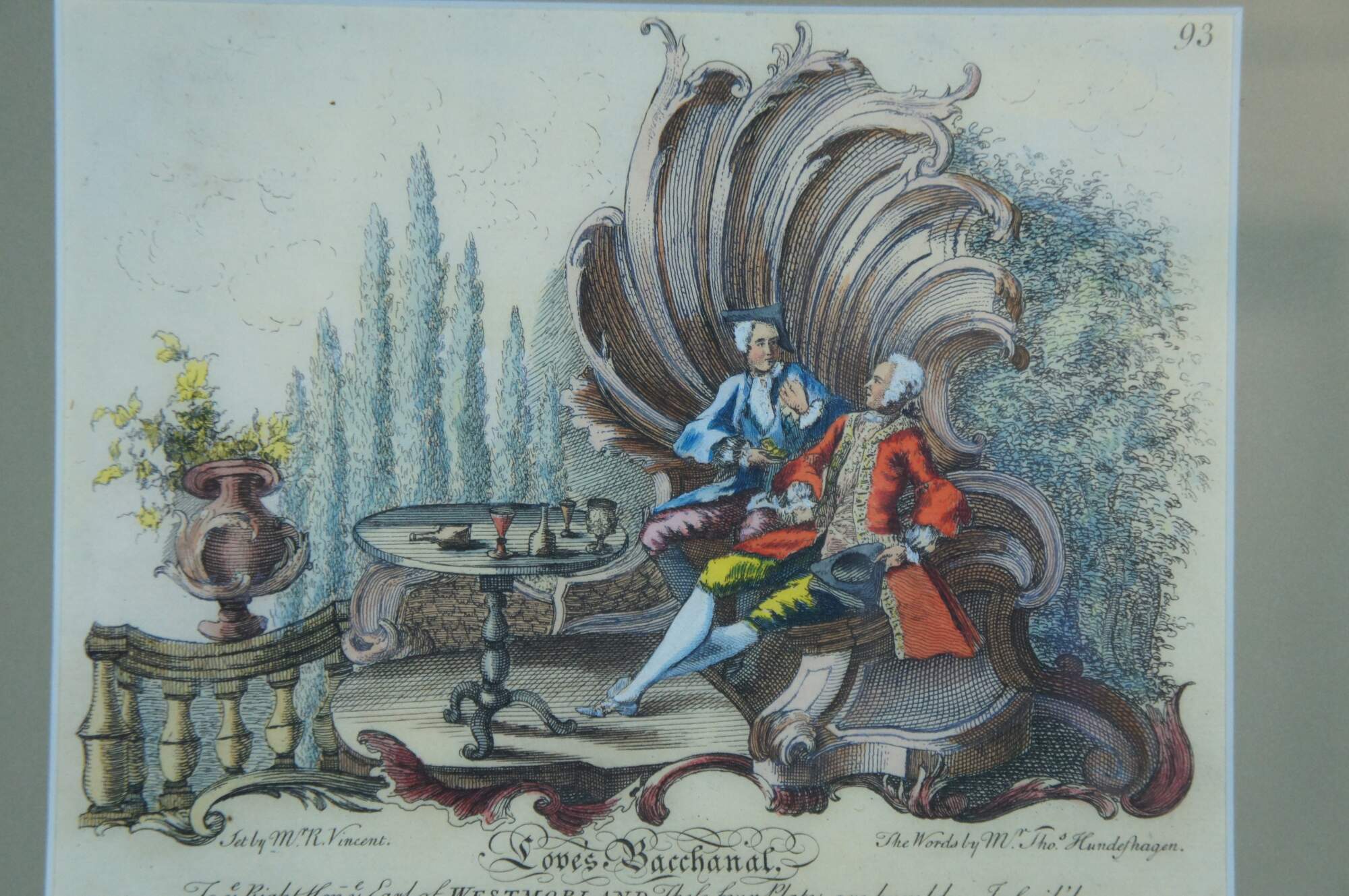 Pair of mid 18th century (1740s) colored sheets of music illustrated by George Bickham - The Syren of the Stage, showing a male and female pair of figures playing flute and mandolin, and Love's Bacchanal, showing a pair of male figures on an elegant garden veranda. Champagne gilt frame carved with beaded, rope twist and floral details; sage green mat.