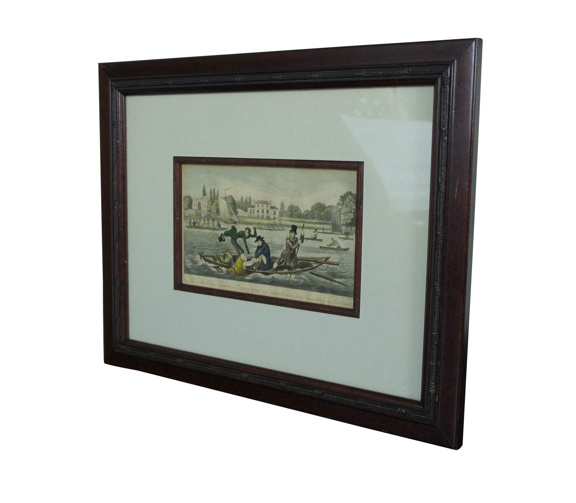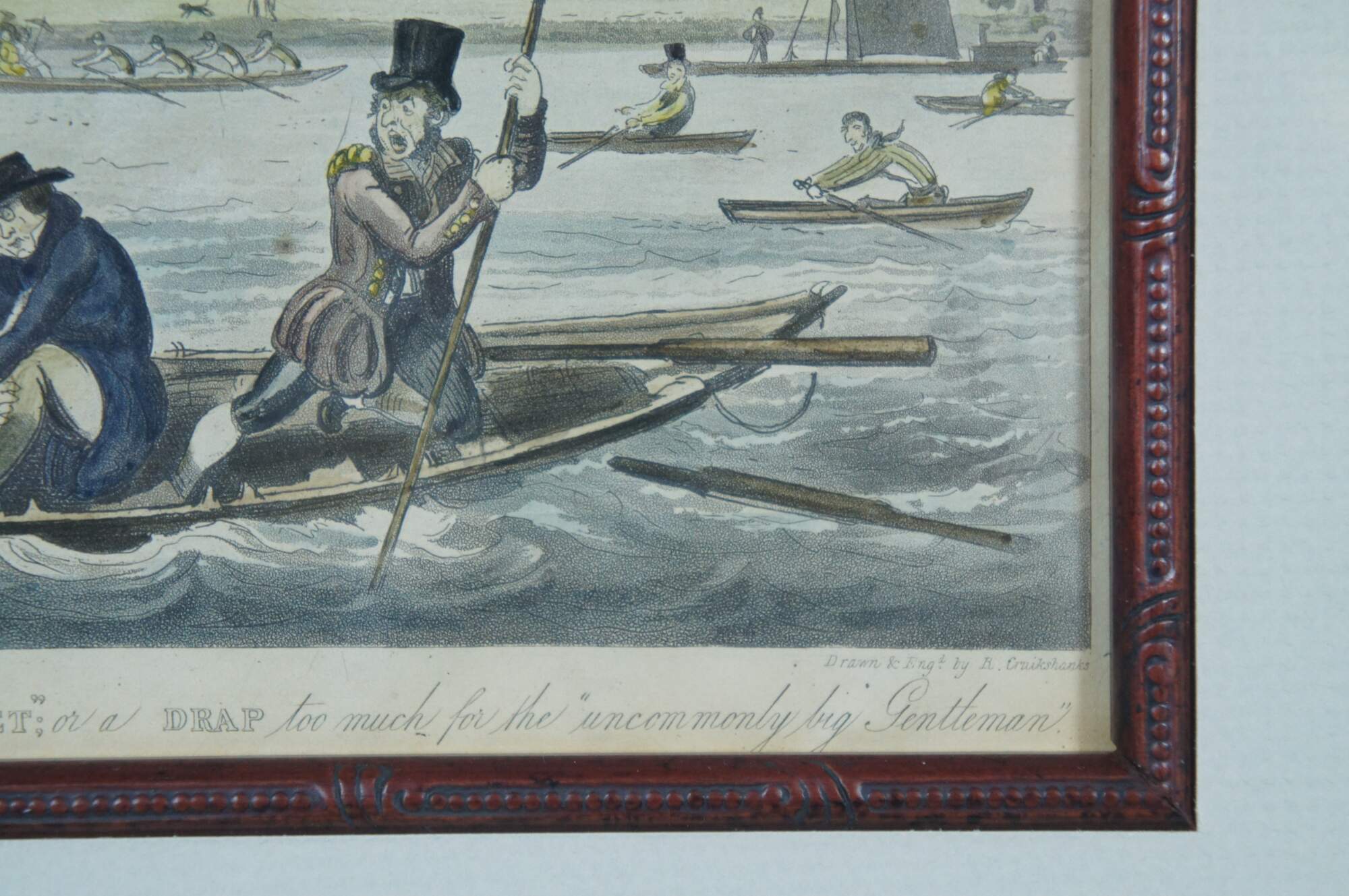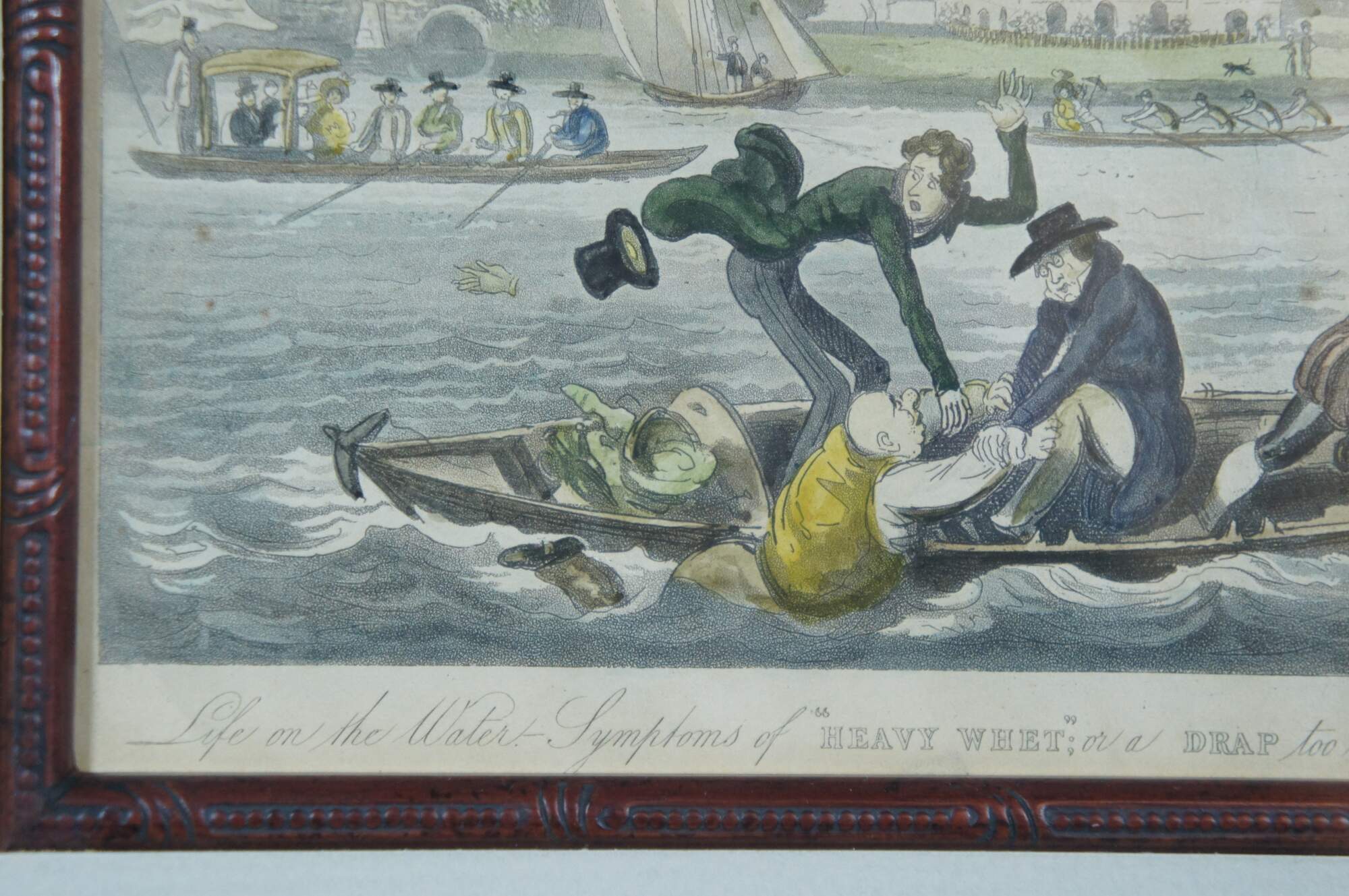 Early 19th century hand colored comedic satirical nautical maritime rowing engraving titled "Life on the Water. Symptoms of "Heavy Whet;" or a Drap too much for the 'uncommonly big Gentleman.'" Drawn and engraved by Robert Cruikshanks. Speckled wood frame with carved beaded / rope twist detail and inner border; white mat.
