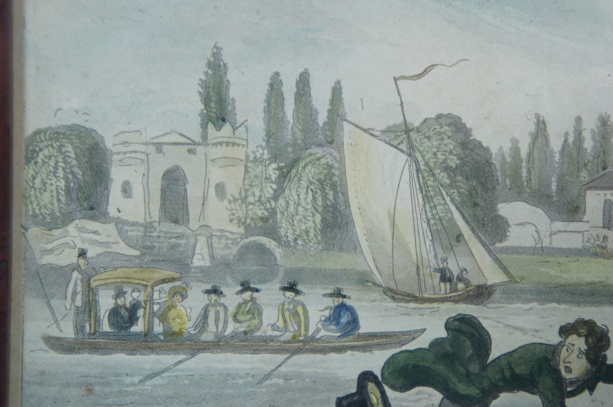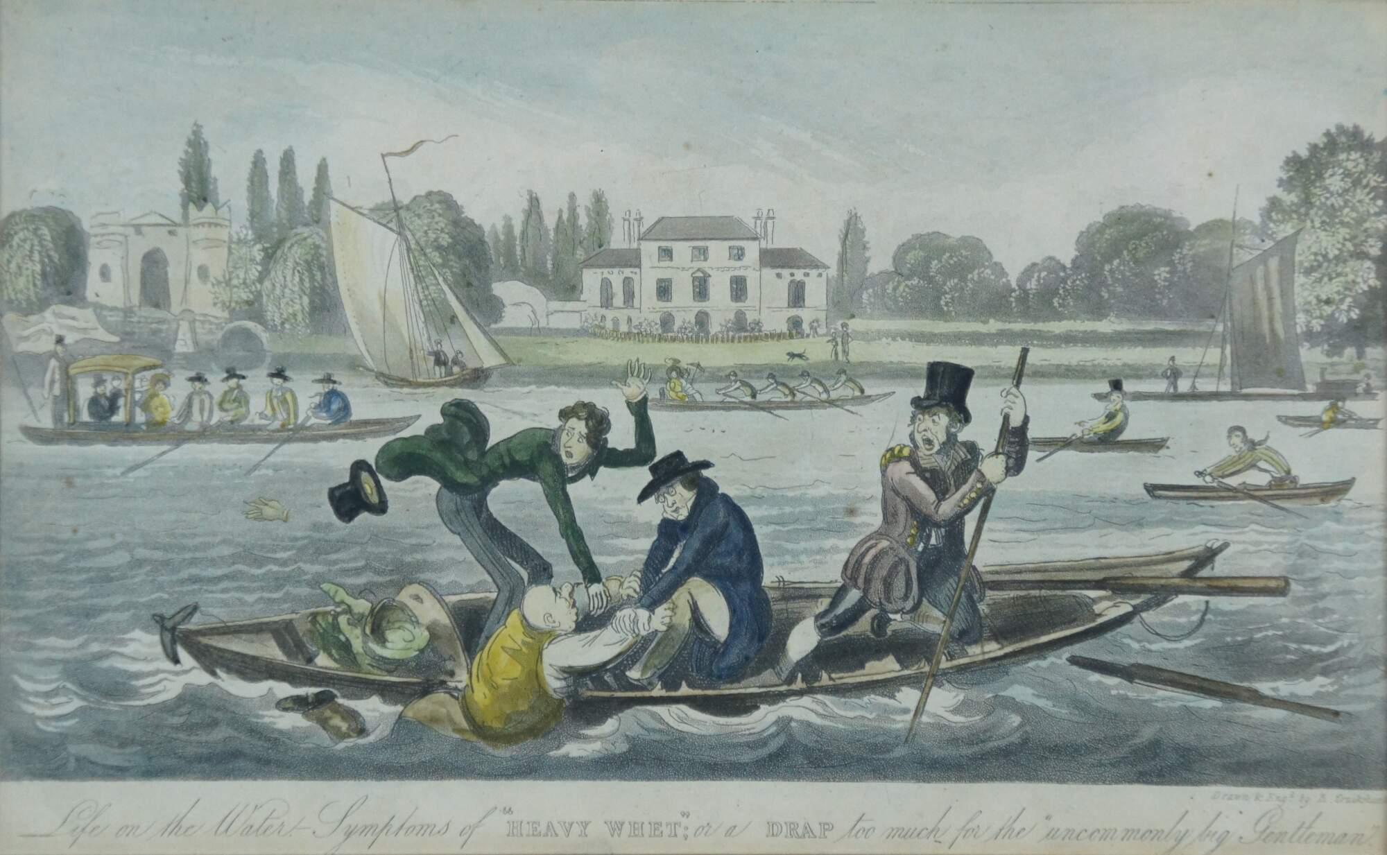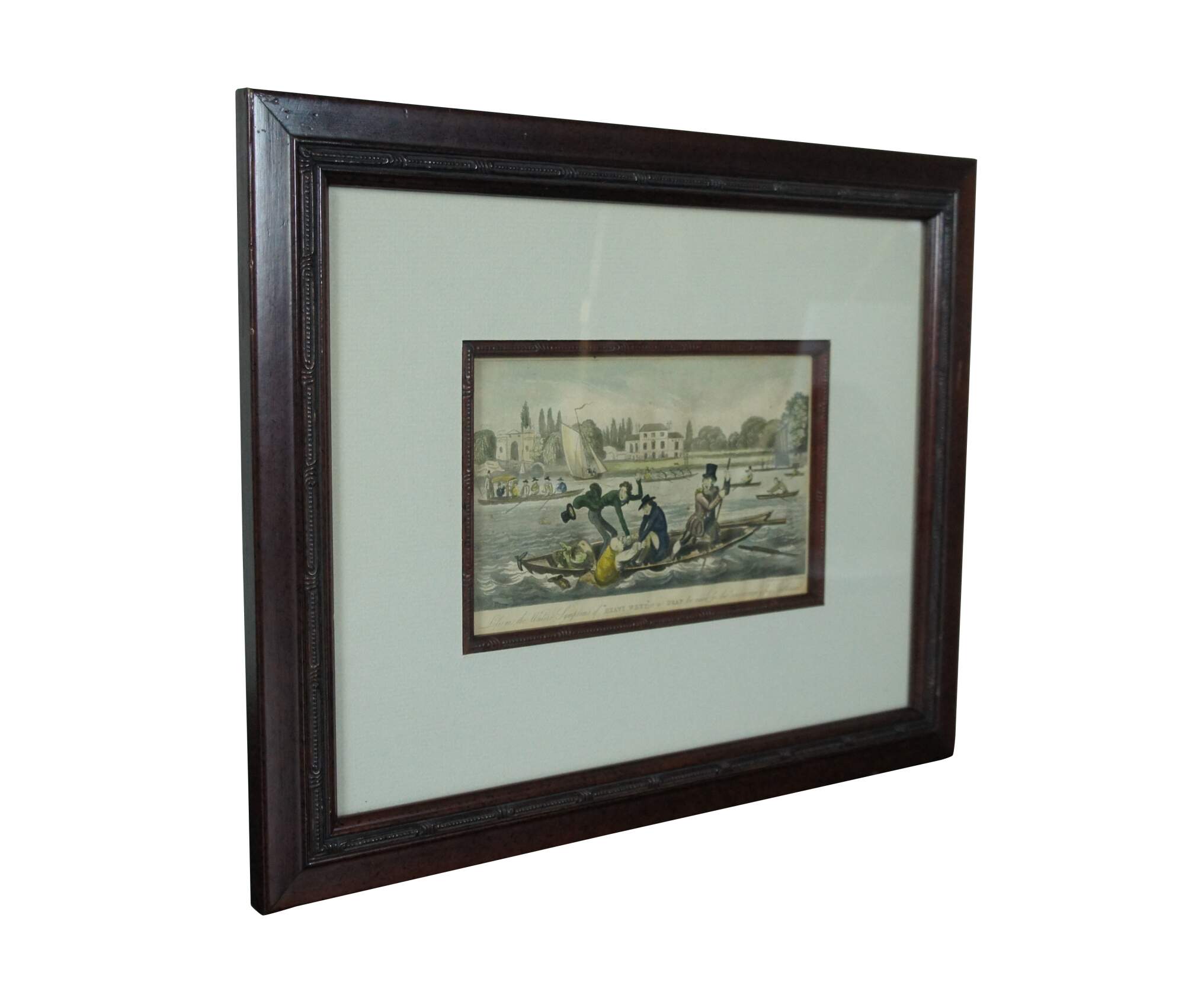 Early 19th century hand colored comedic satirical nautical maritime rowing engraving titled "Life on the Water. Symptoms of "Heavy Whet;" or a Drap too much for the 'uncommonly big Gentleman.'" Drawn and engraved by Robert Cruikshanks. Speckled wood frame with carved beaded / rope twist detail and inner border; white mat.