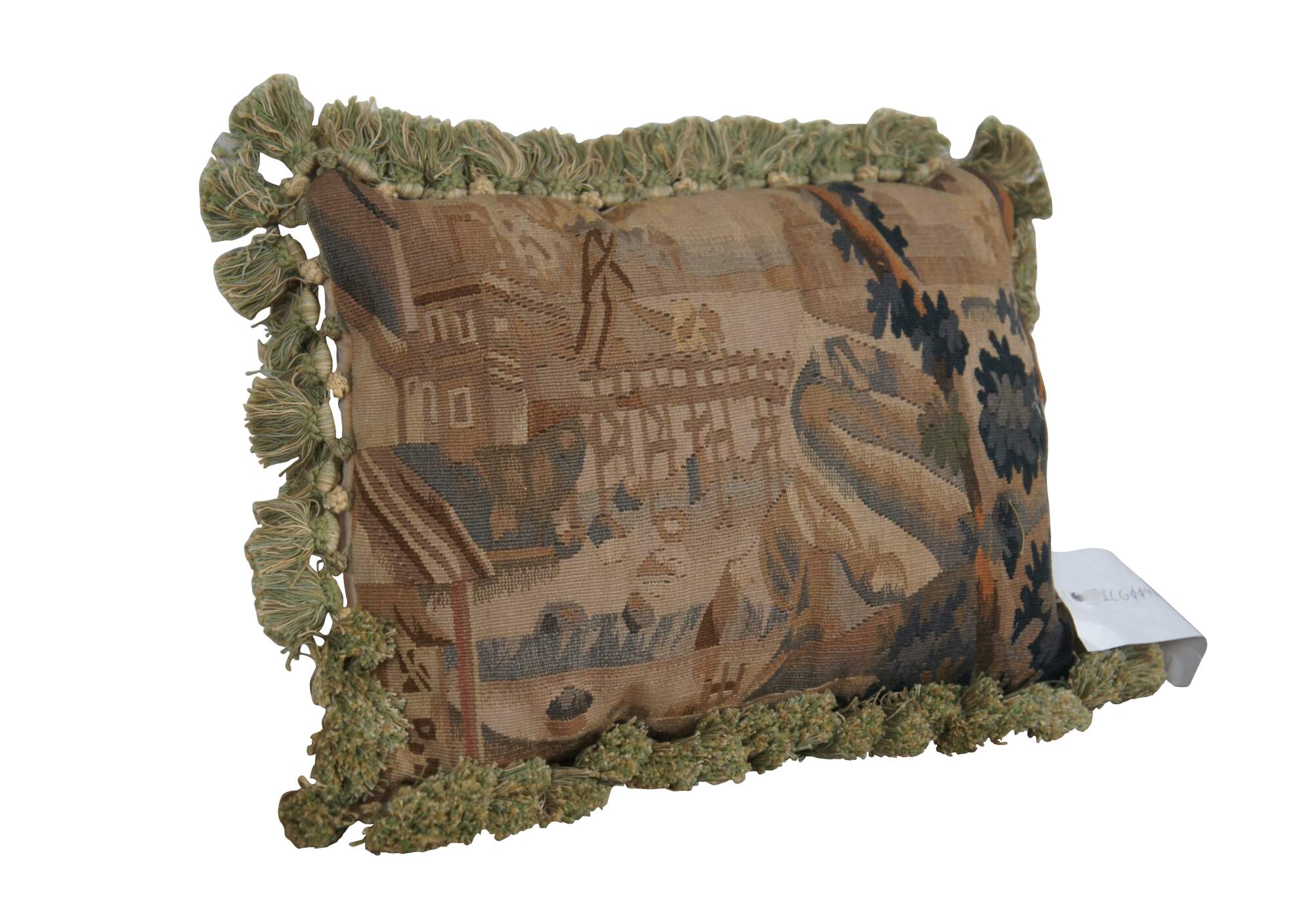 3 Available - 20th century French Aubusson style rectangular lumbar / throw pillow, embroidered in wool showing a cityscape along a river, framed with rocks and trees. Cream and green tassel trim. Light brown velour back with zipper closure. Down filled.