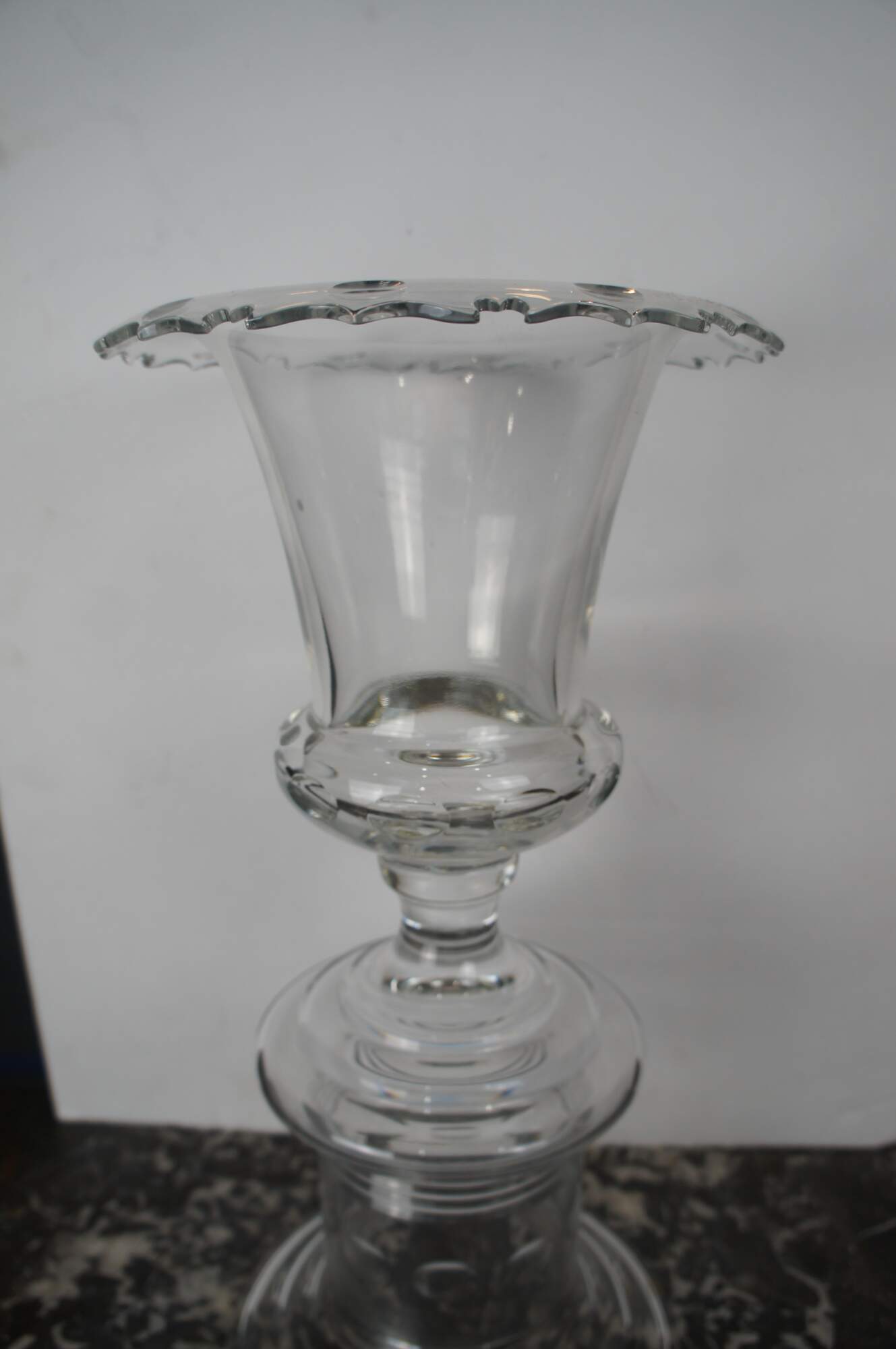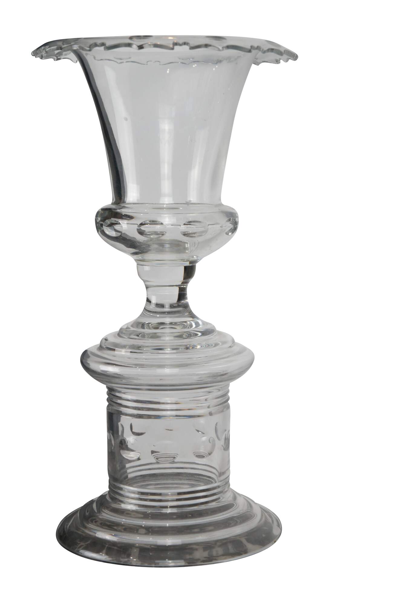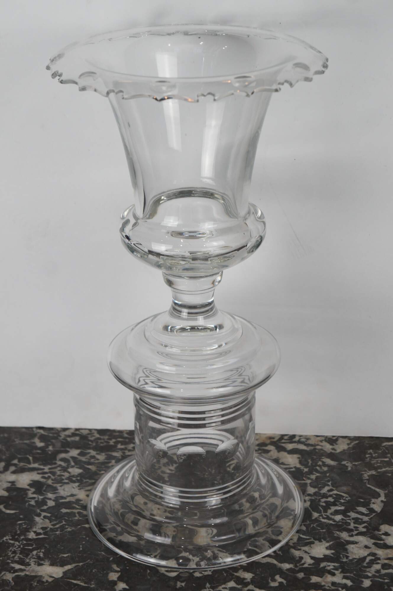 Large and impressive crystal vase from the Jenkins Collection by William Yeoward. Features a trohpy urn / flower vase with cut coin dot patterns and ribbed accents over a tired footed base. The vase has a flared mouth with sawtooth cut design. This vase is discontinued and about 40% larger than the one that is now offered.