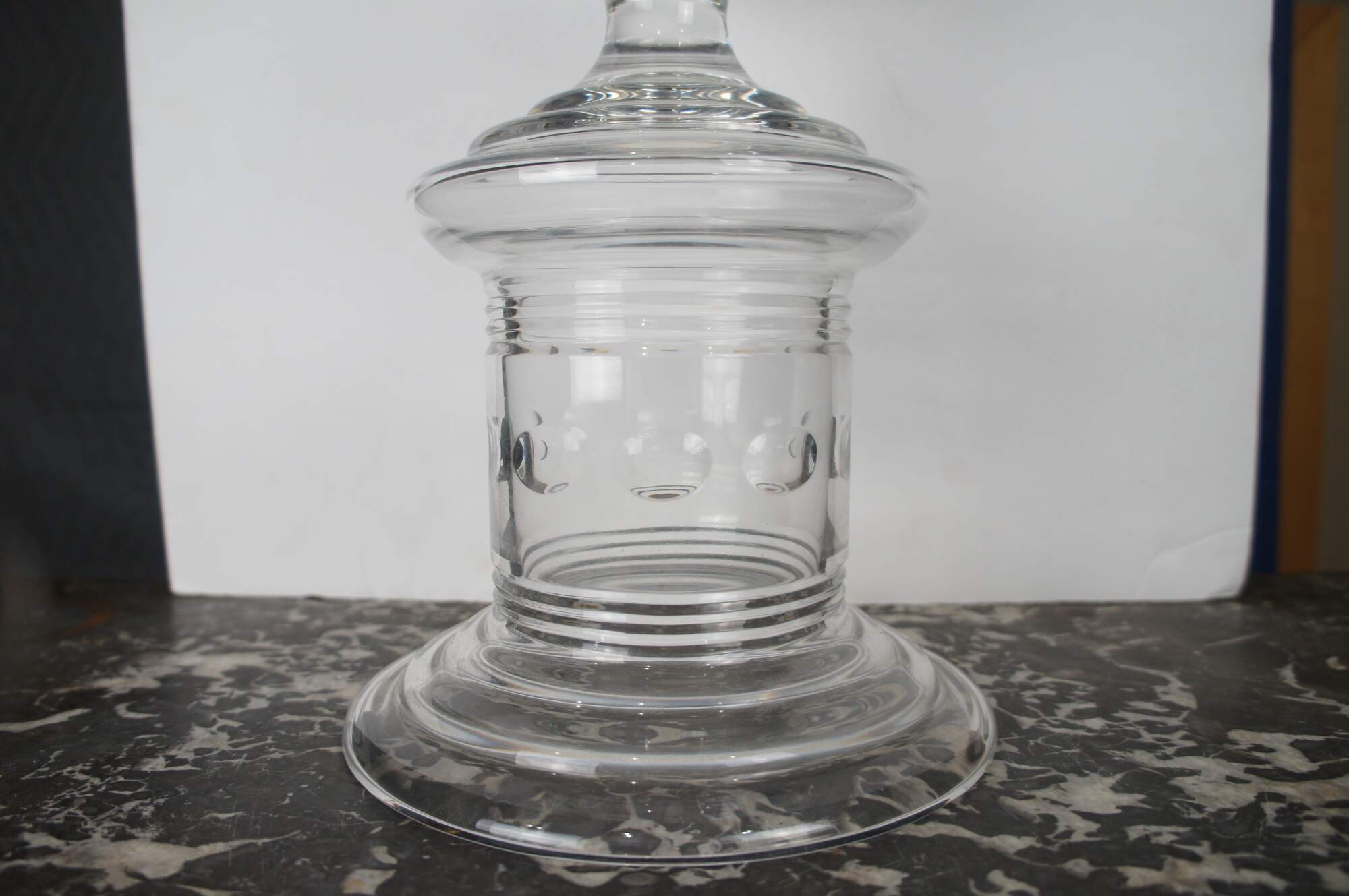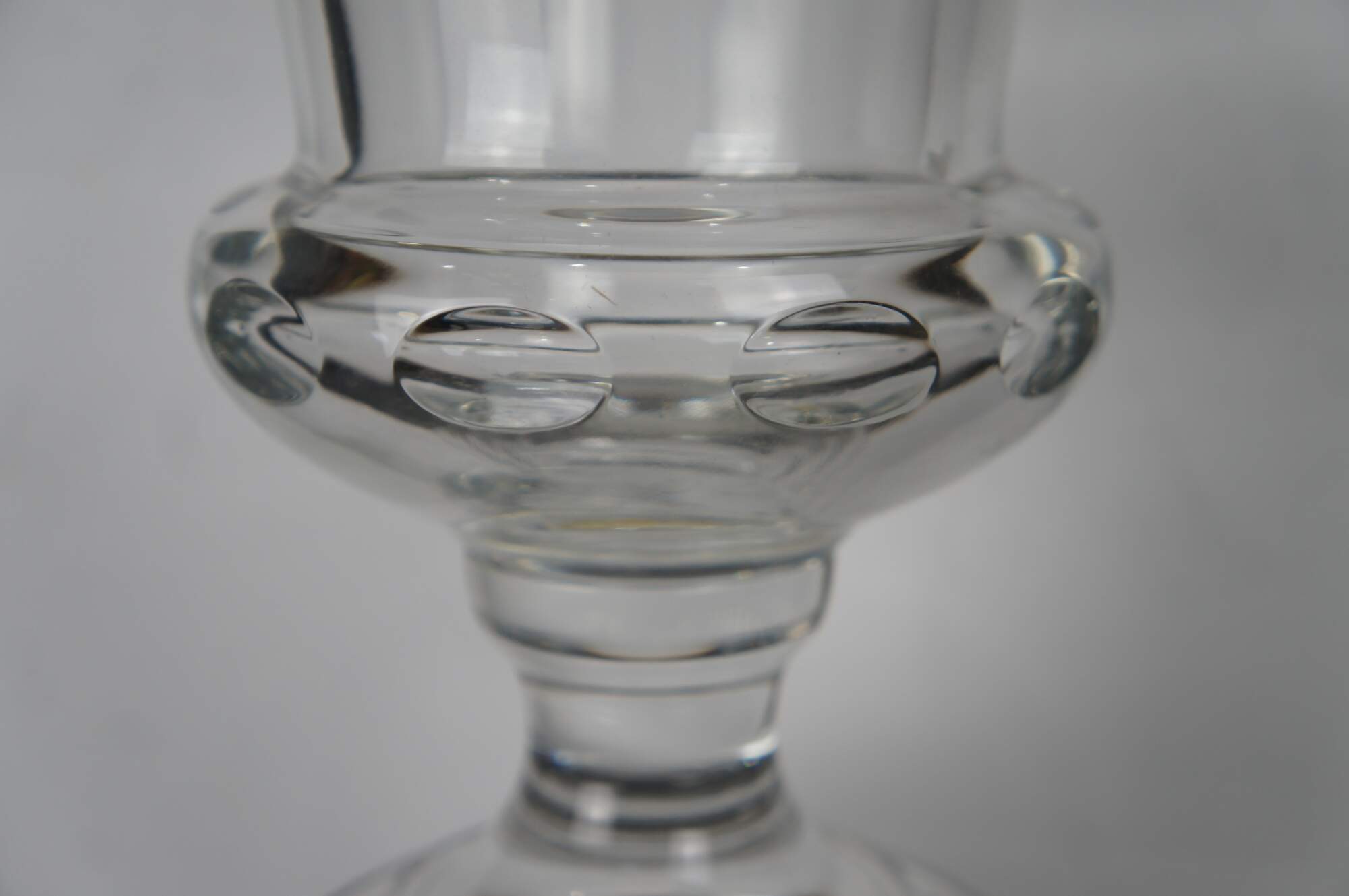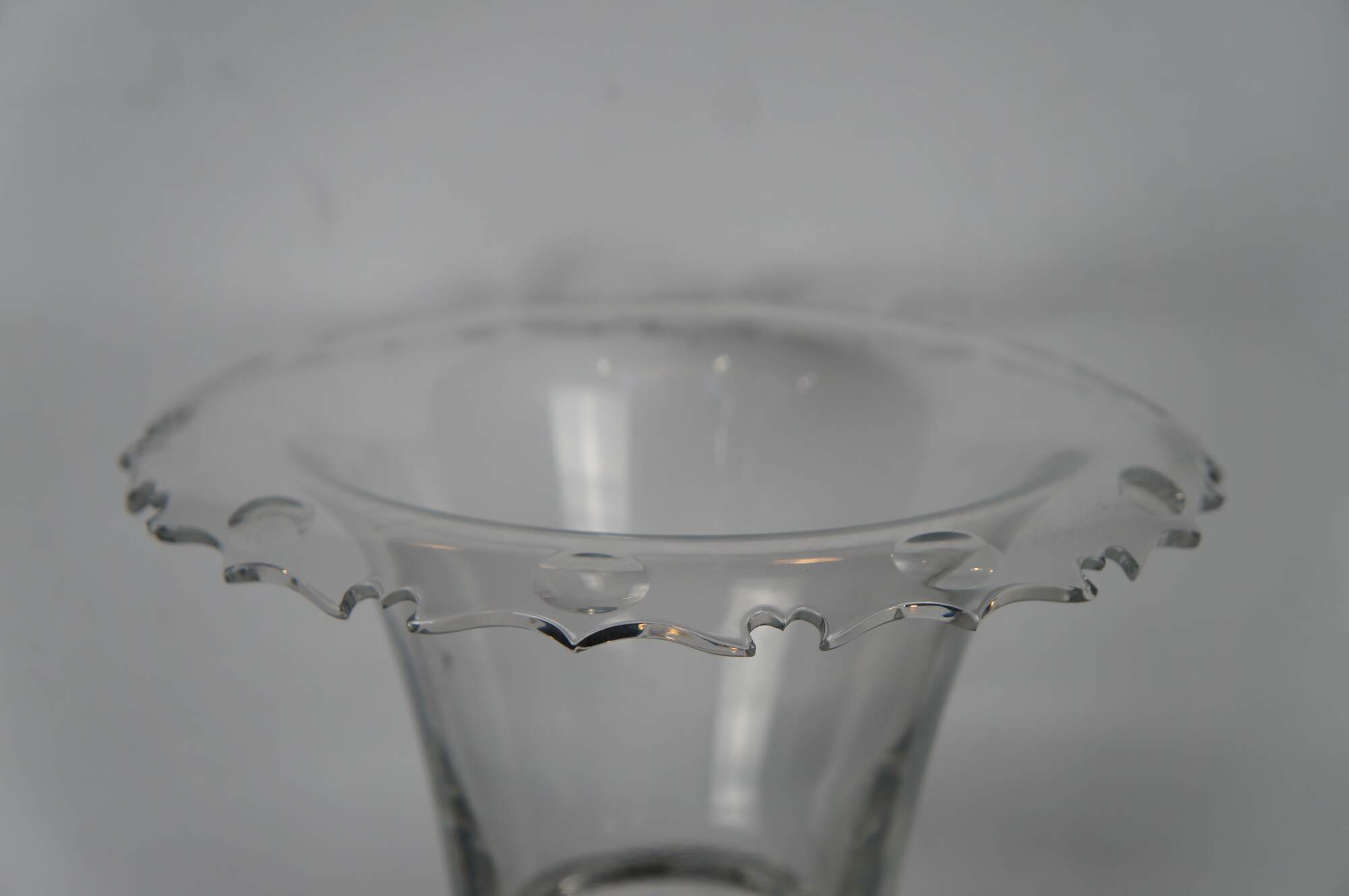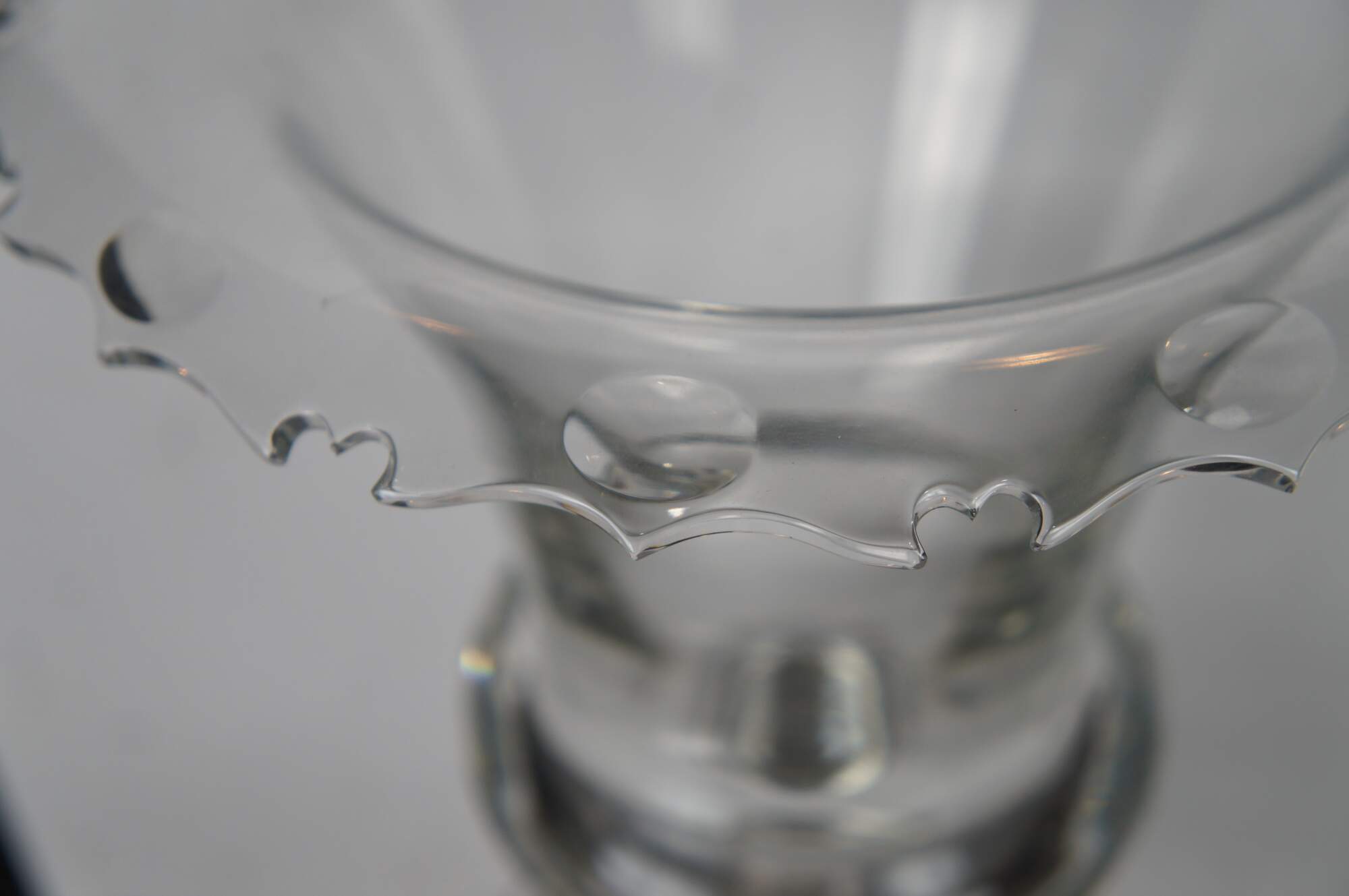 Large and impressive crystal vase from the Jenkins Collection by William Yeoward. Features a trohpy urn / flower vase with cut coin dot patterns and ribbed accents over a tired footed base. The vase has a flared mouth with sawtooth cut design. This vase is discontinued and about 40% larger than the one that is now offered.