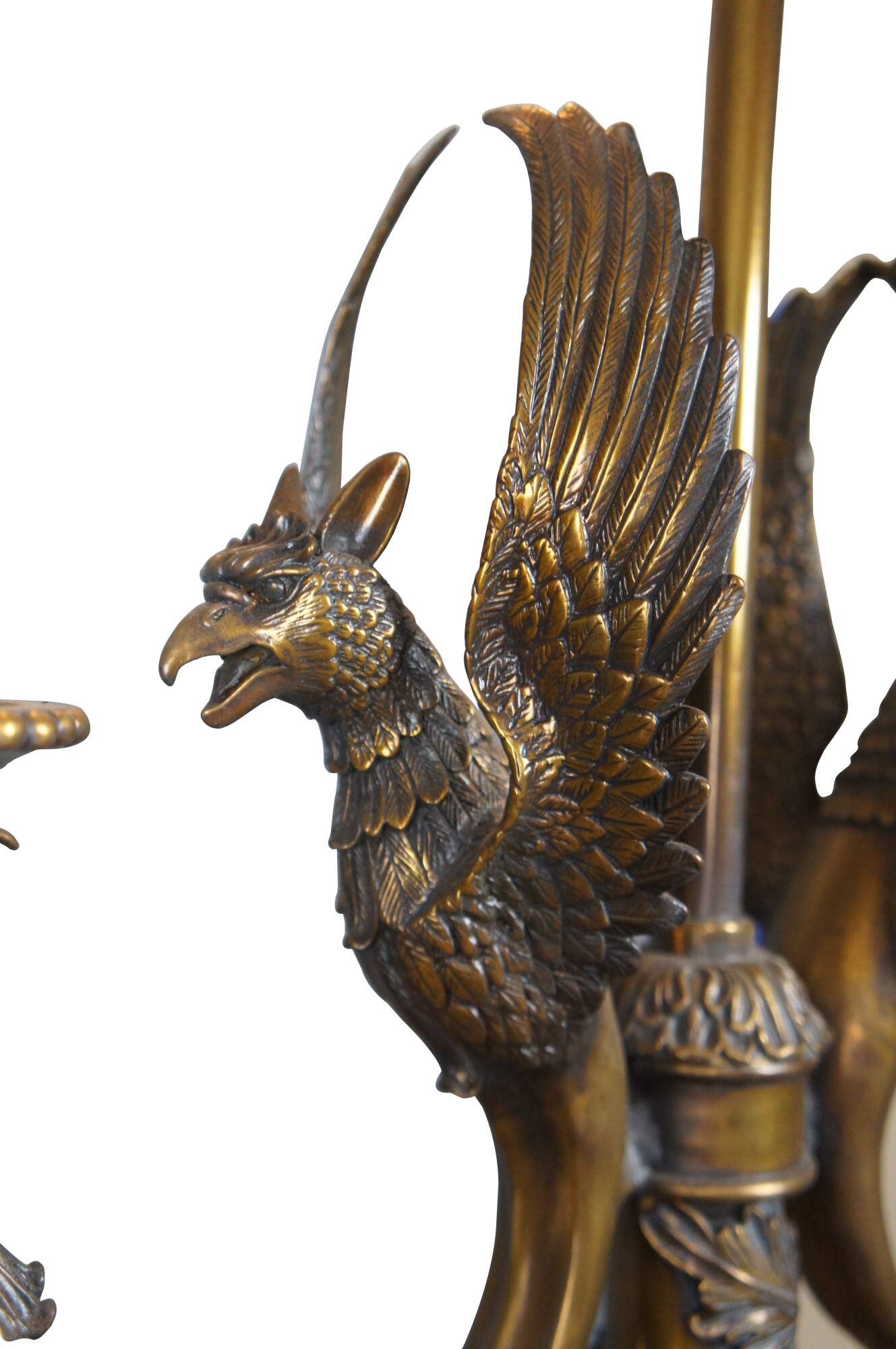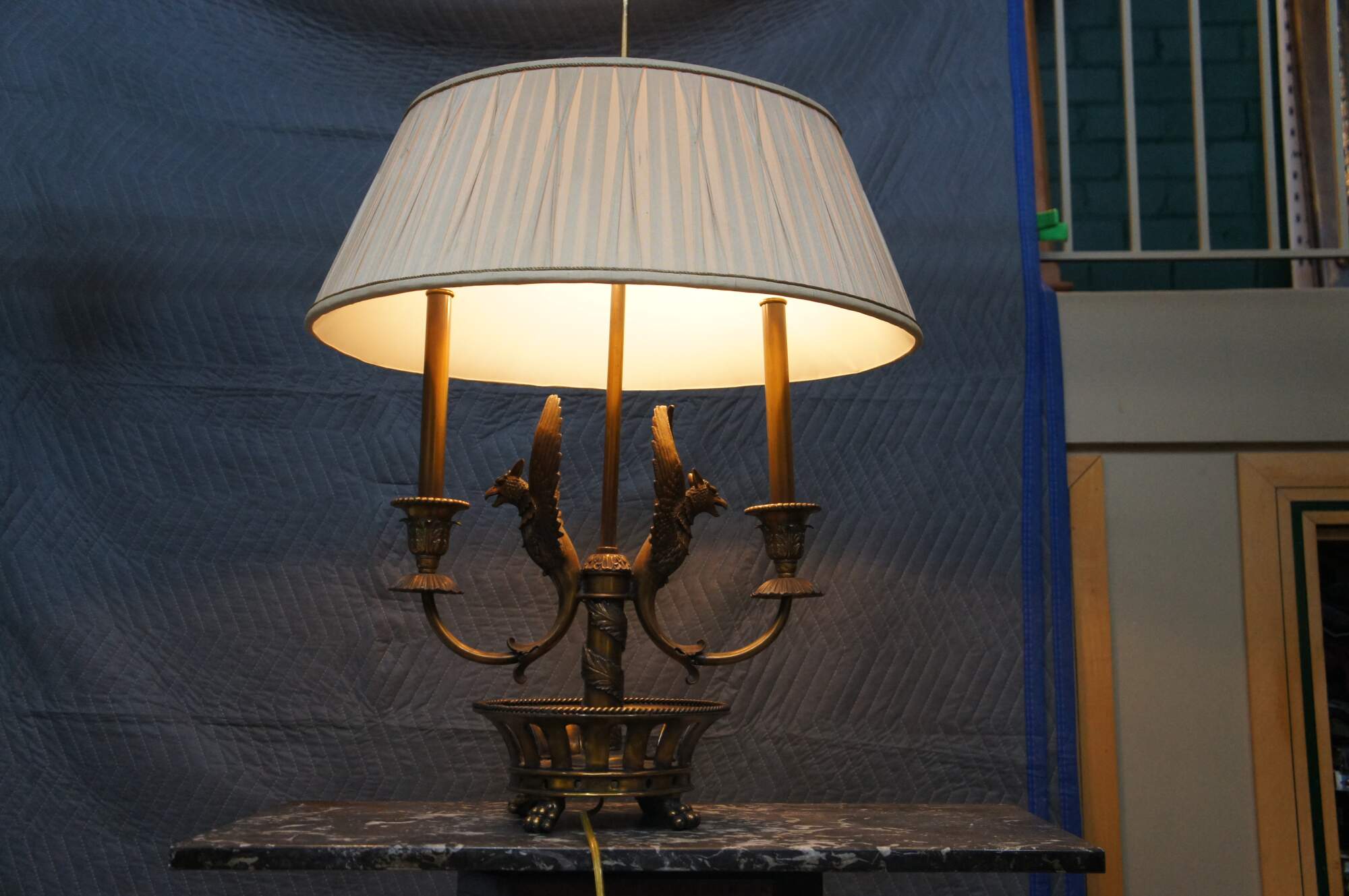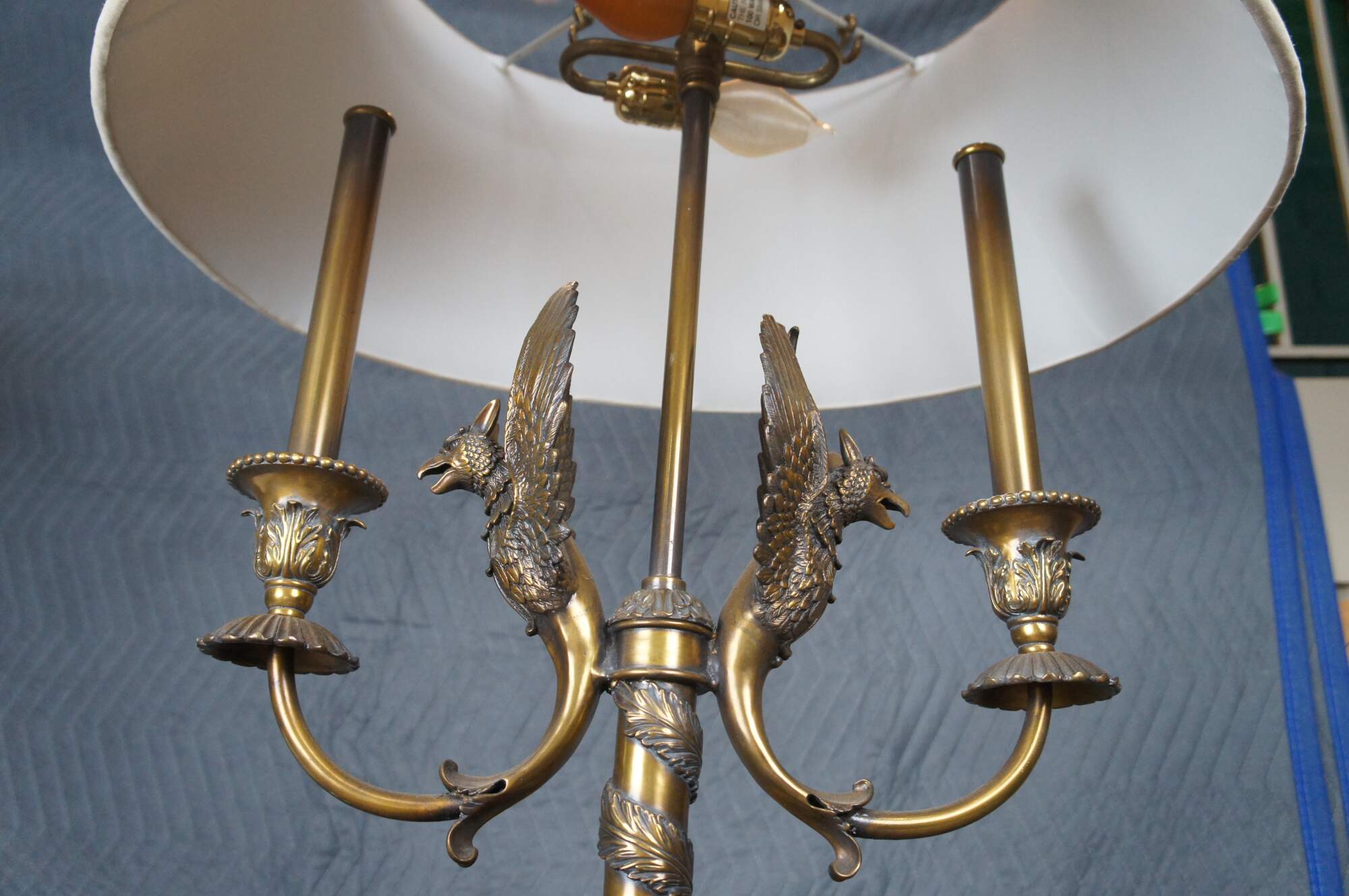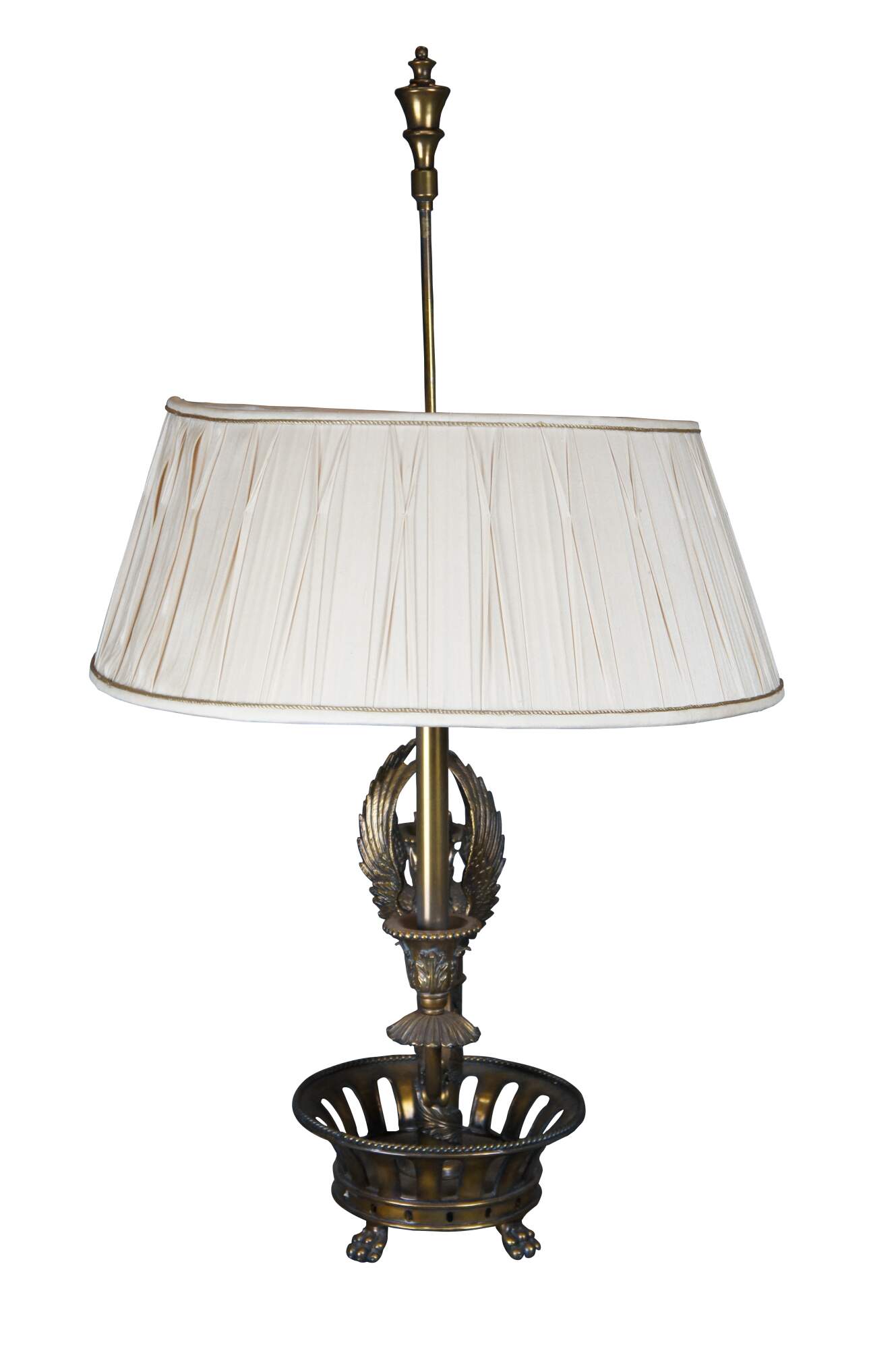 Monumental late 20th century Maitland Smith Empire style Bouillote / Budoir lamp. Made from brass with a pierced and paw footed base over an acanthus wrapped column leading to a figural winged Phoenix / Griffon candlestick center below large oval silk shade. Trophy finial rises on long column over shade.