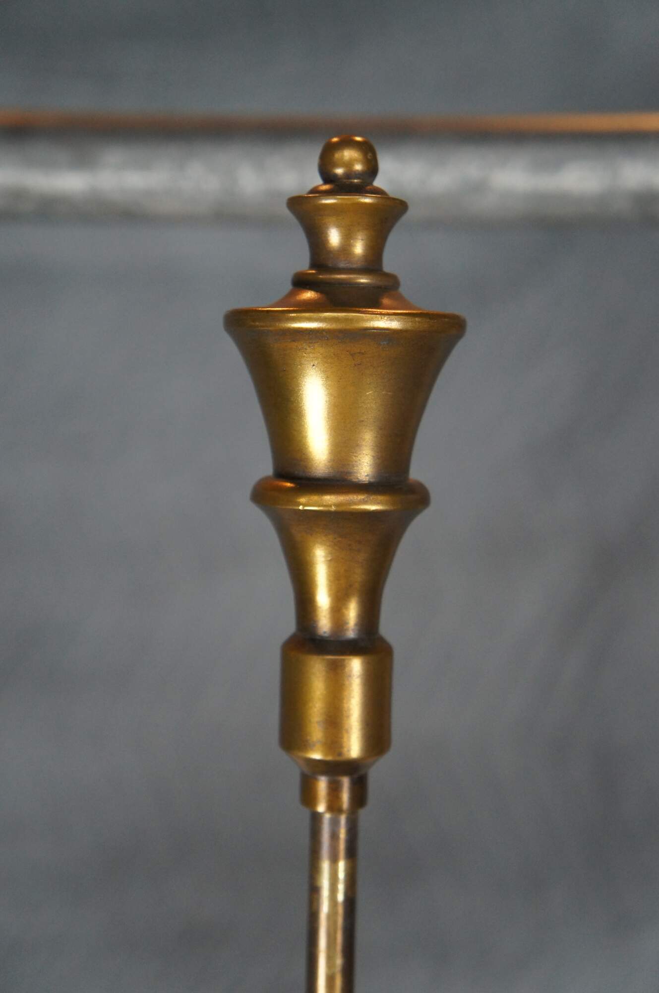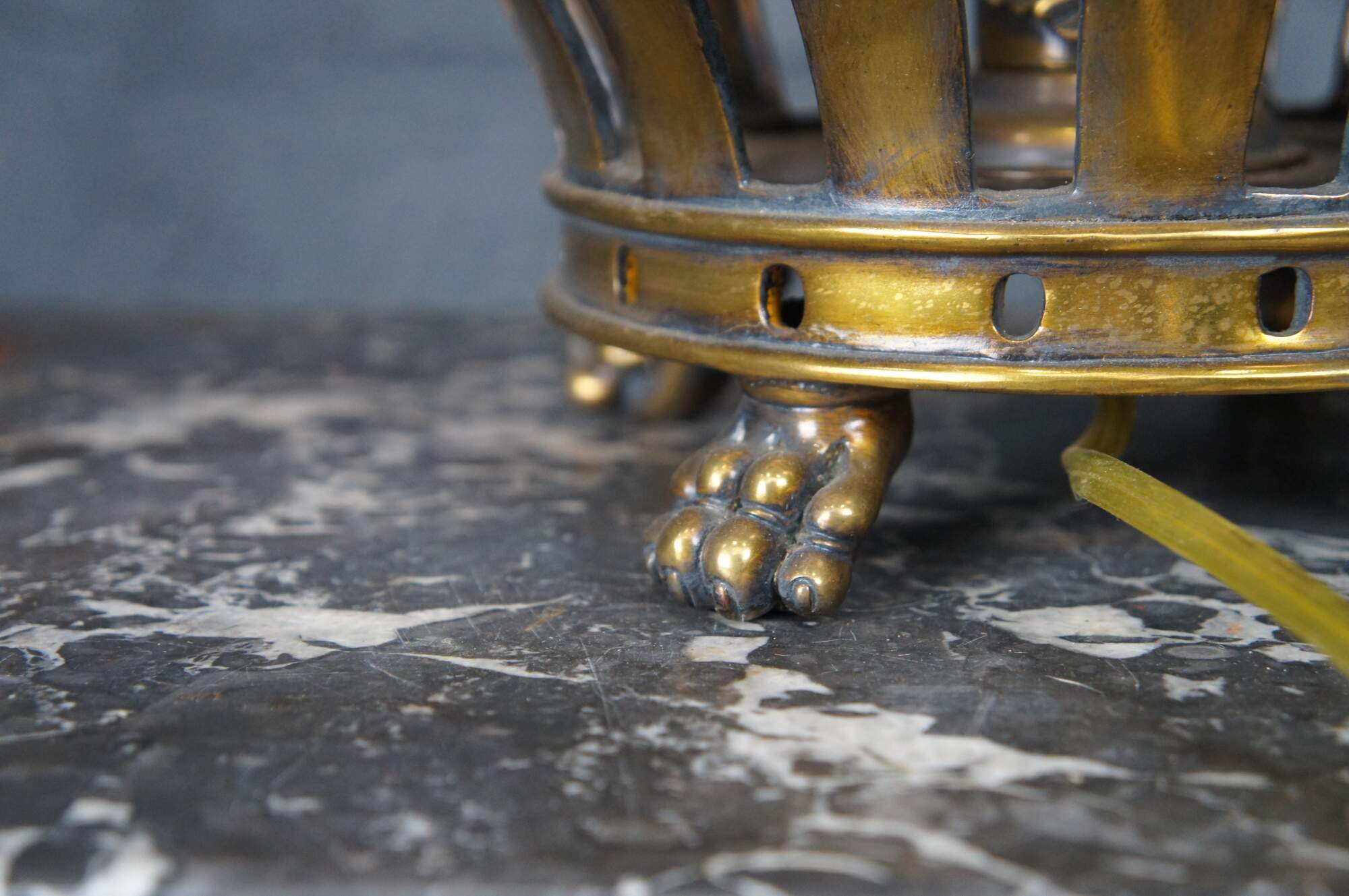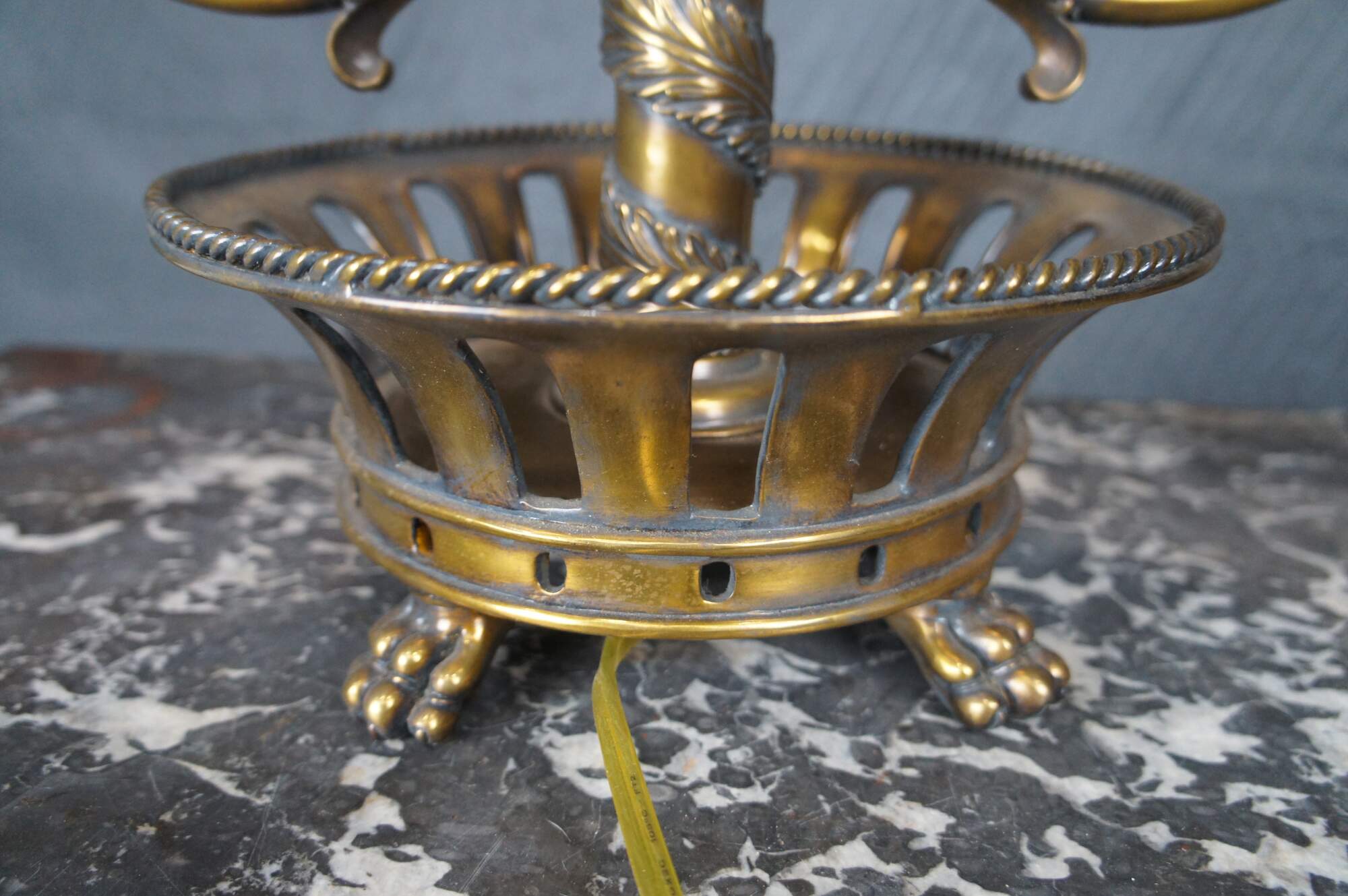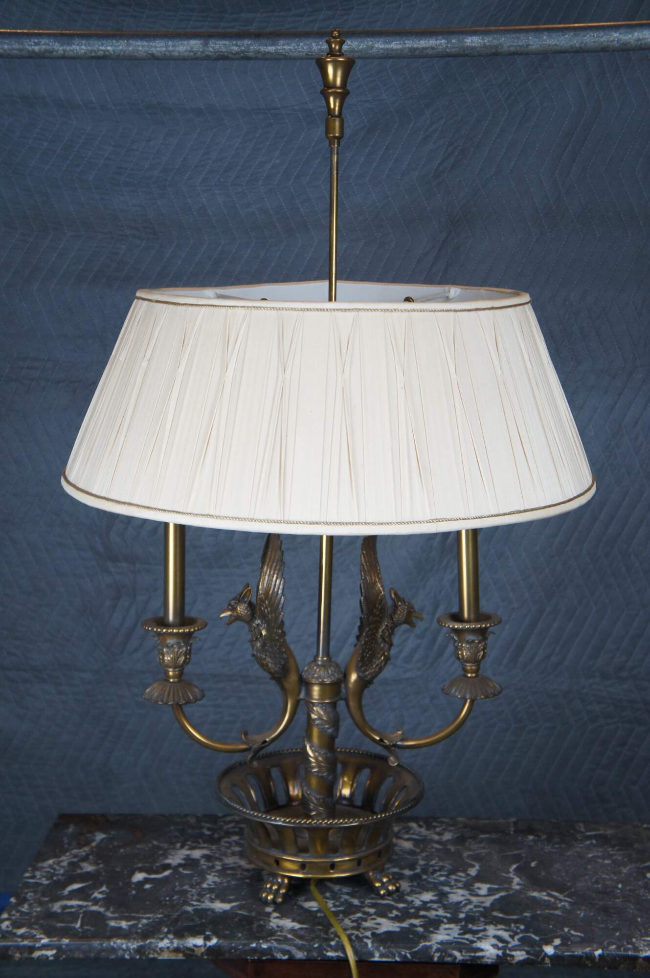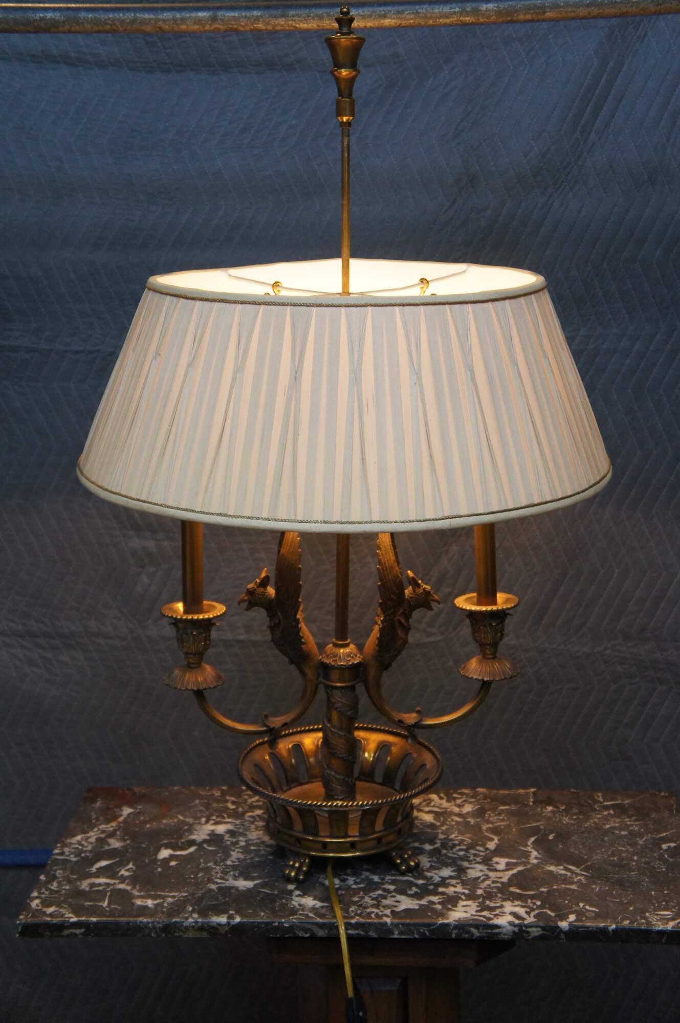 Monumental late 20th century Maitland Smith Empire style Bouillote / Budoir lamp. Made from brass with a pierced and paw footed base over an acanthus wrapped column leading to a figural winged Phoenix / Griffon candlestick center below large oval silk shade. Trophy finial rises on long column over shade.