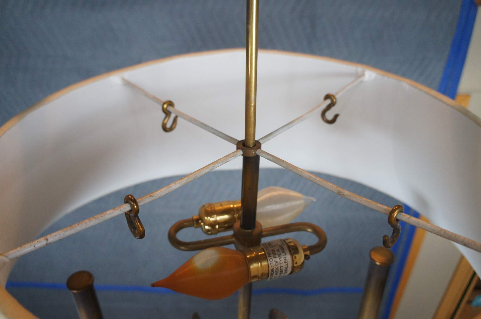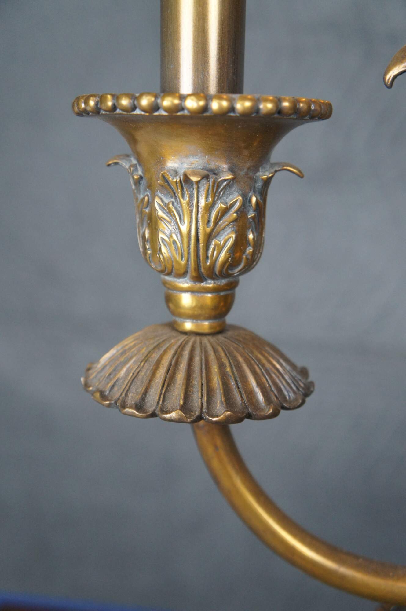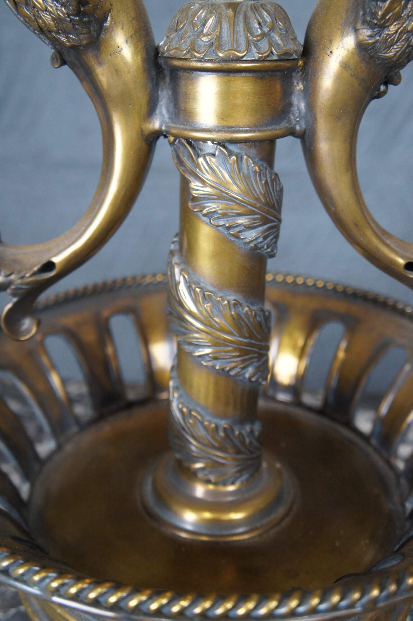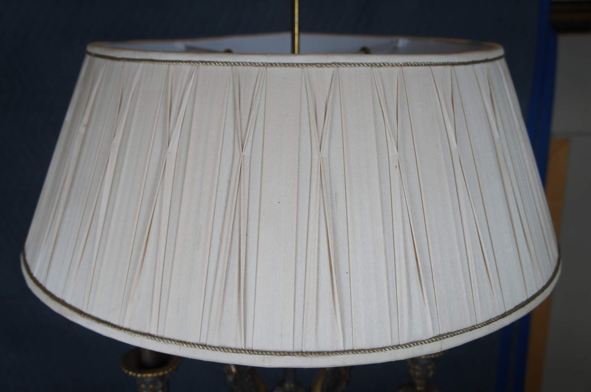 Monumental late 20th century Maitland Smith Empire style Bouillote / Budoir lamp. Made from brass with a pierced and paw footed base over an acanthus wrapped column leading to a figural winged Phoenix / Griffon candlestick center below large oval silk shade. Trophy finial rises on long column over shade.