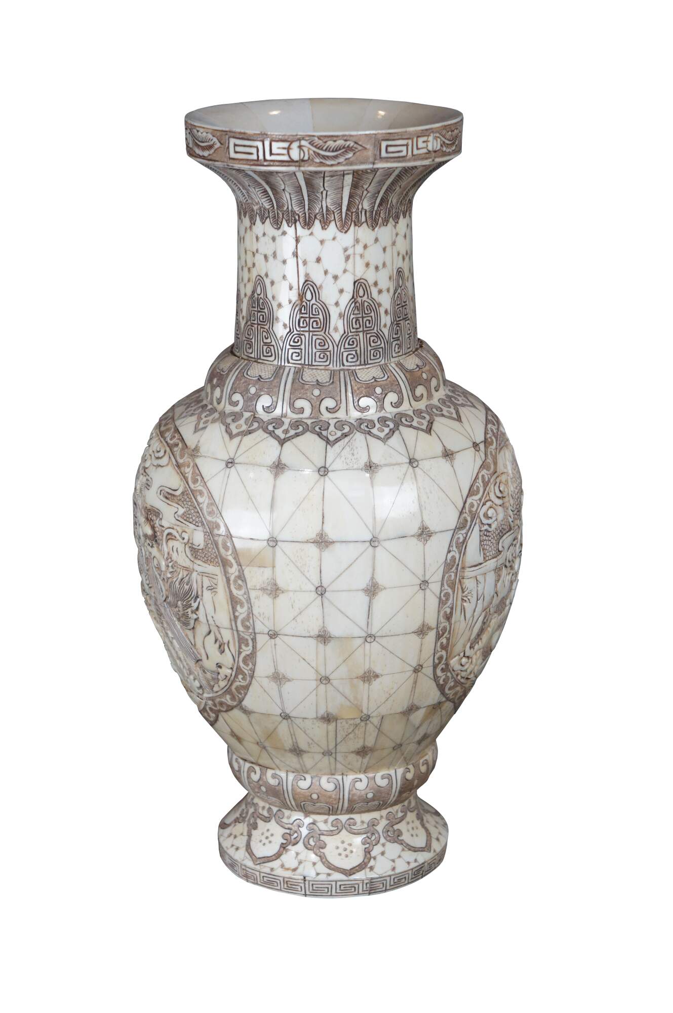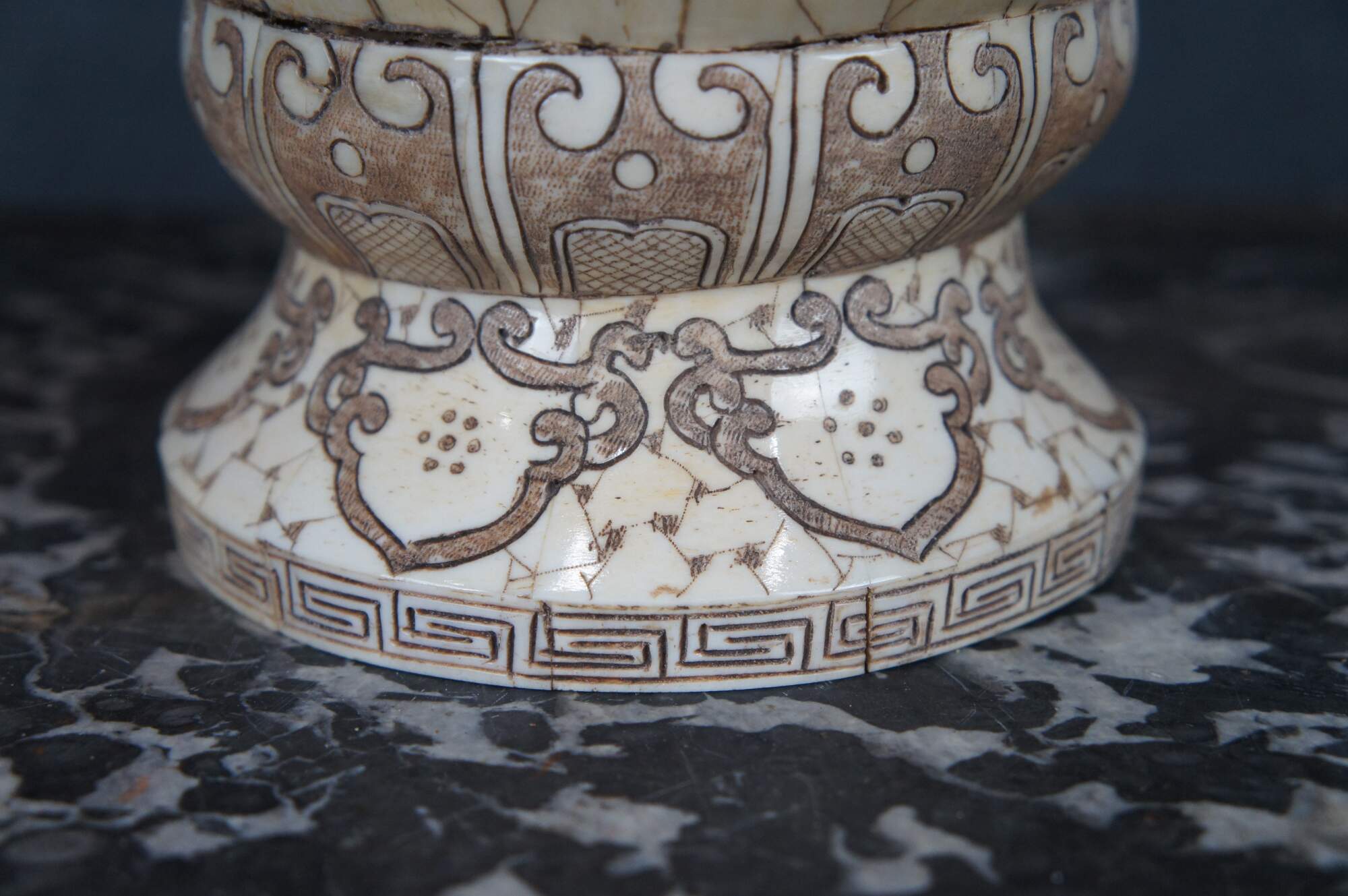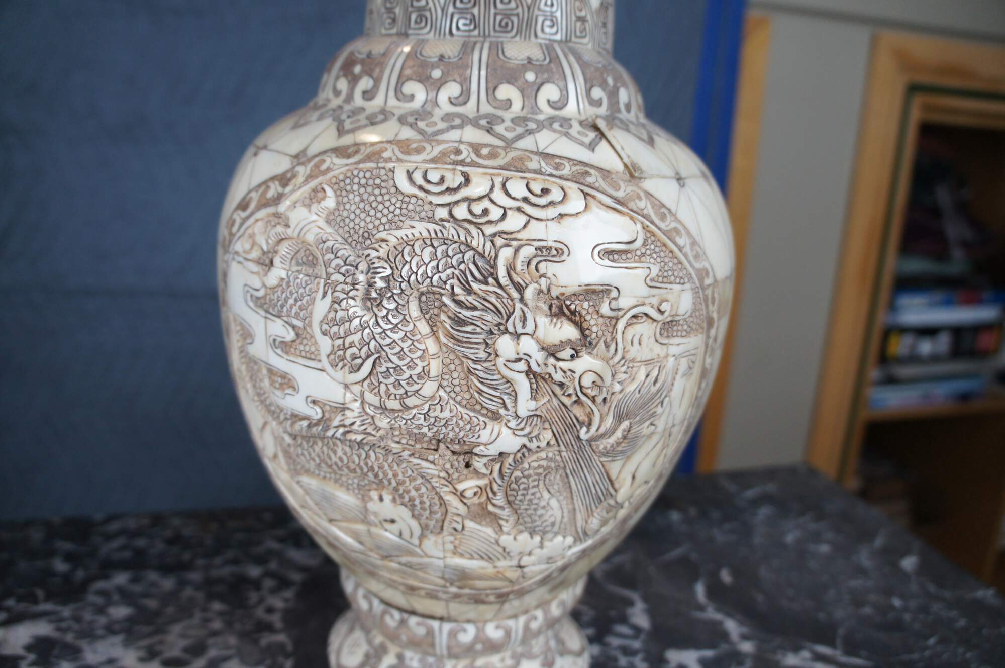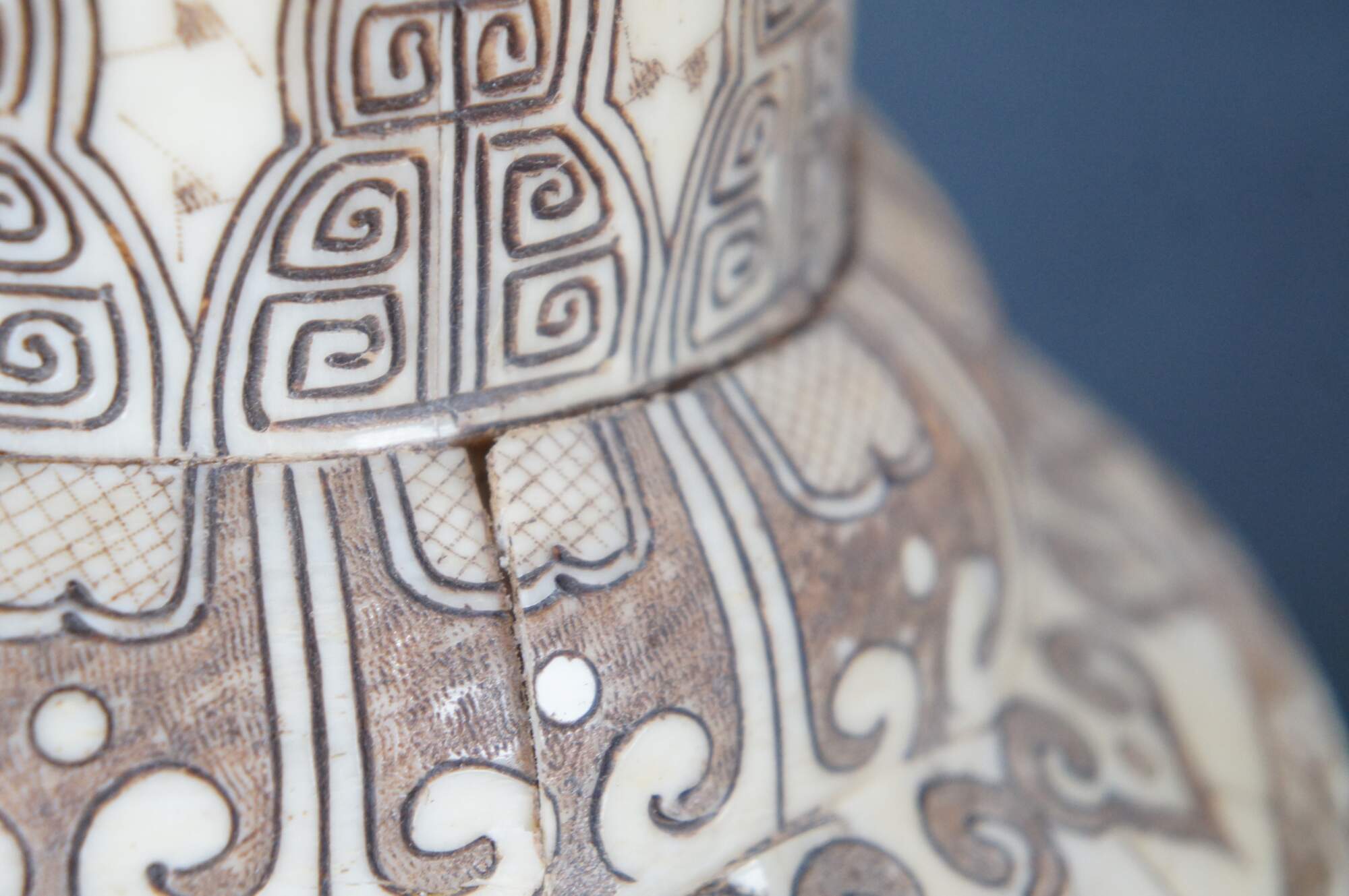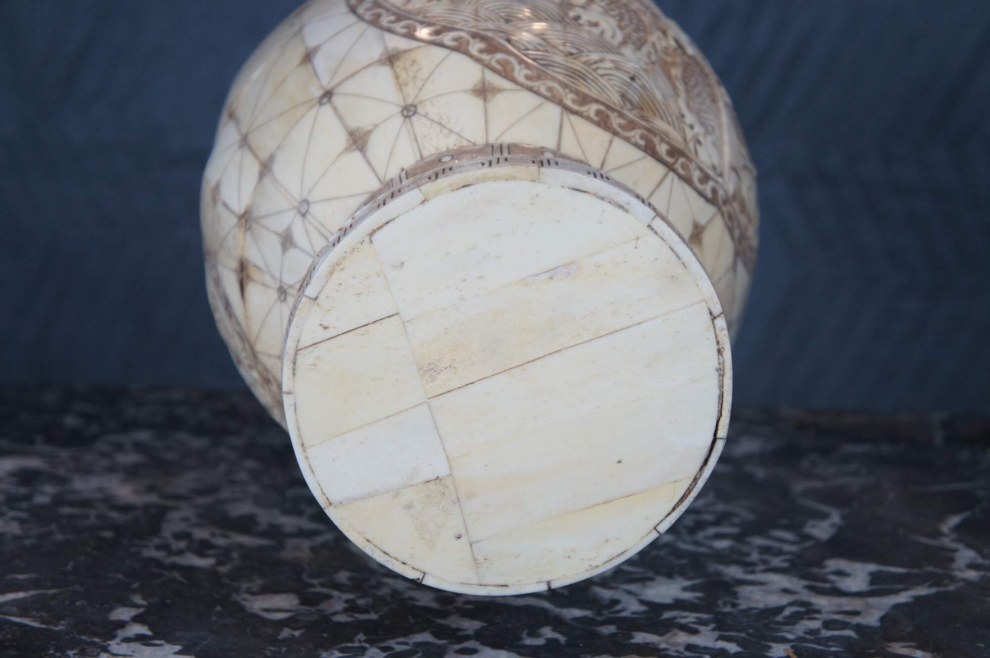 An intriguing Chinese 20th century cow bone veneered vase or bottle. Features a tessellated frame decorated on each side with to gnarling dragons and incised Chinese motifs.