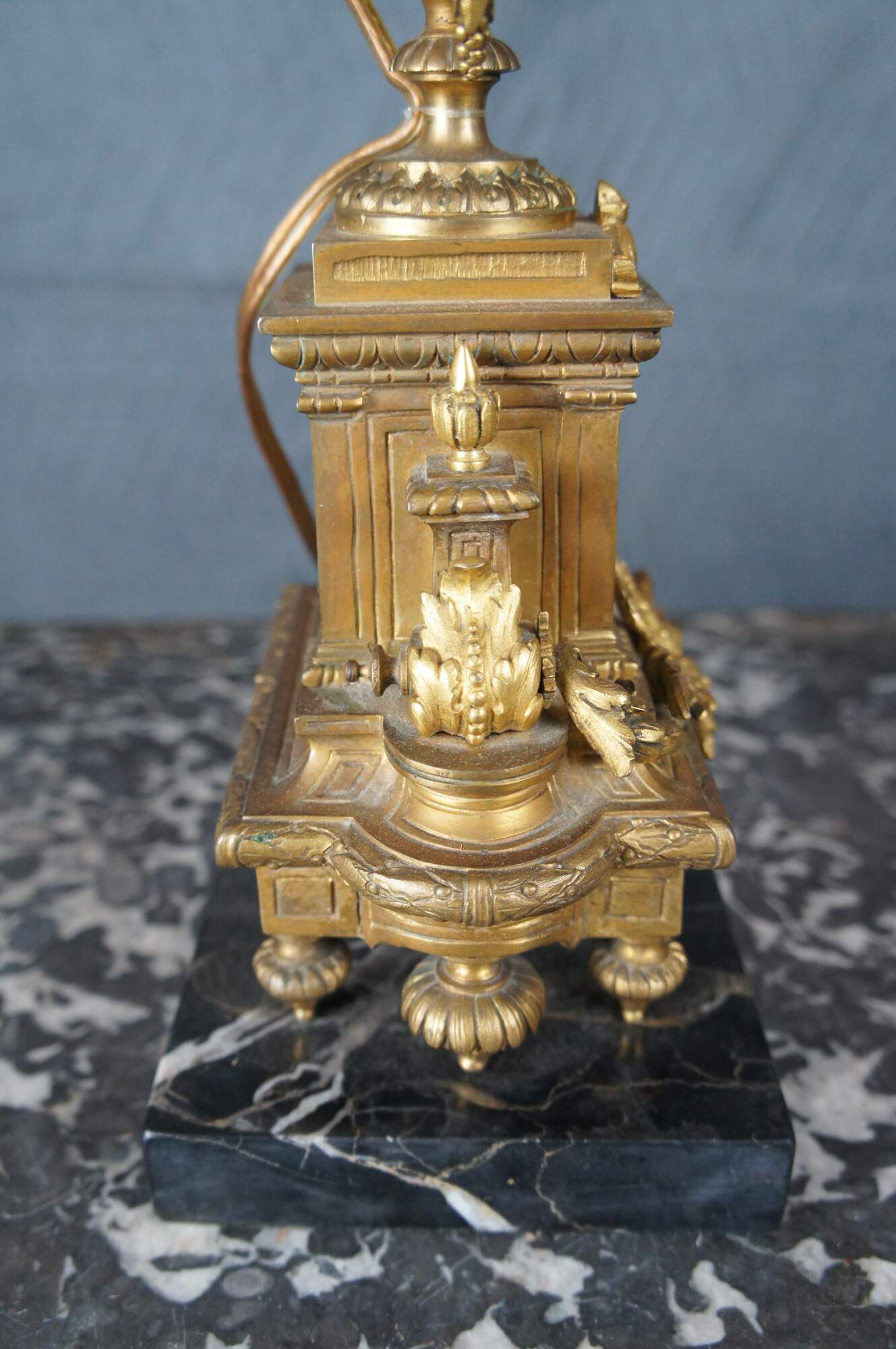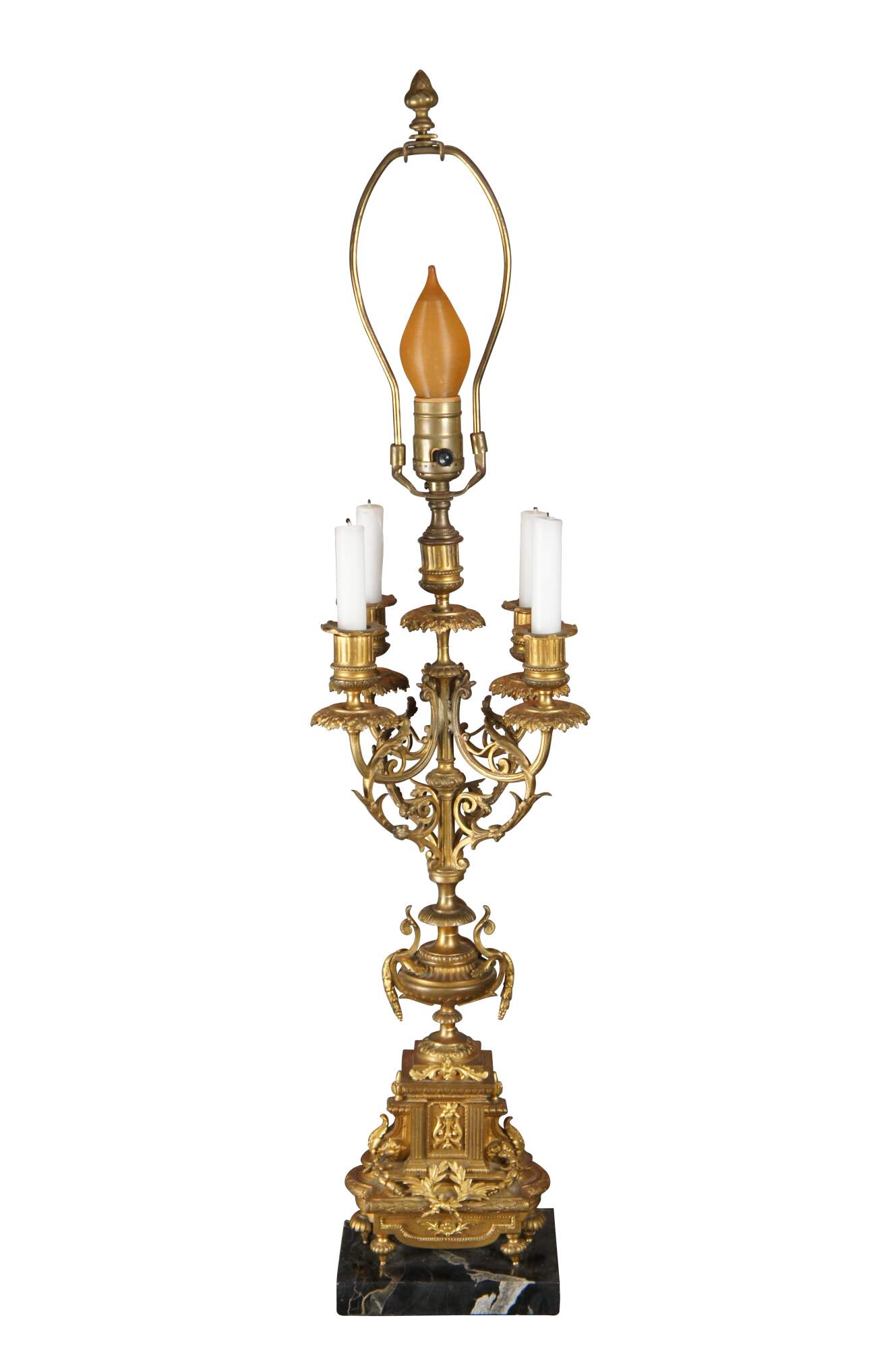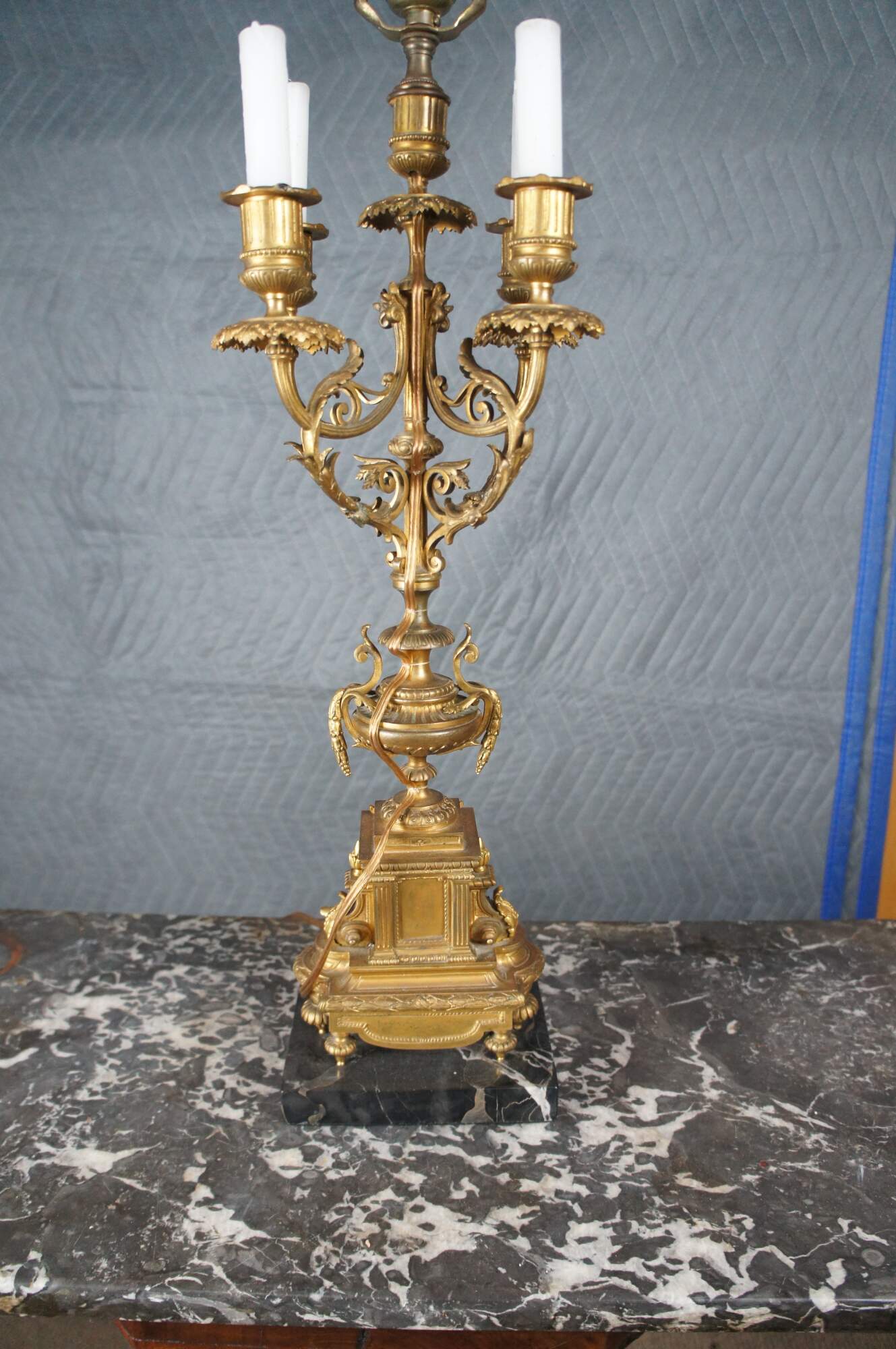 An elegant French Louis XVI Converted Candelabra Lamp. Features a gilt brass finish with classical motifs over a footed base on a black marble plinth. Arms are scrolled with acanthus accents and ornate drip pans. Lamp was added at the center where the fifth candle would have sat. Includes switch and brass harp with trophy finial.
