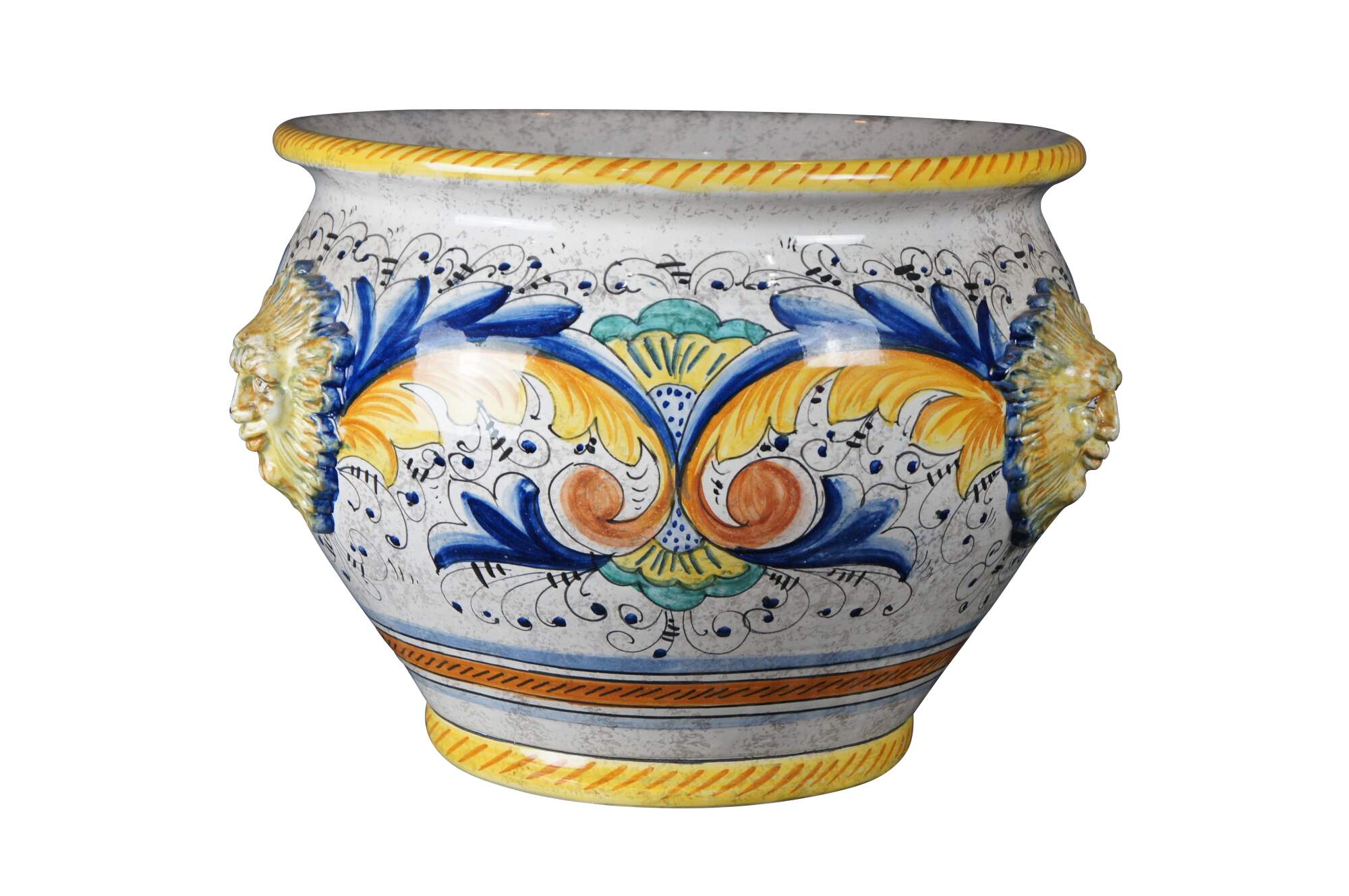A beautiful 20th century jardiniere by Deruta pottery. Features a polychrome finish with elegant scrolling folitate motifs. The planter has three figural sunfaces along the exterior.
